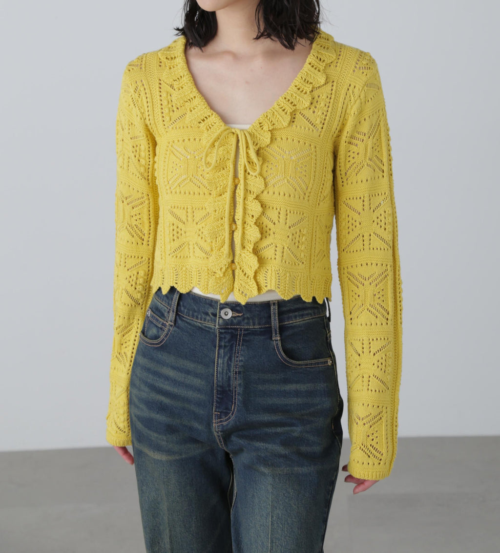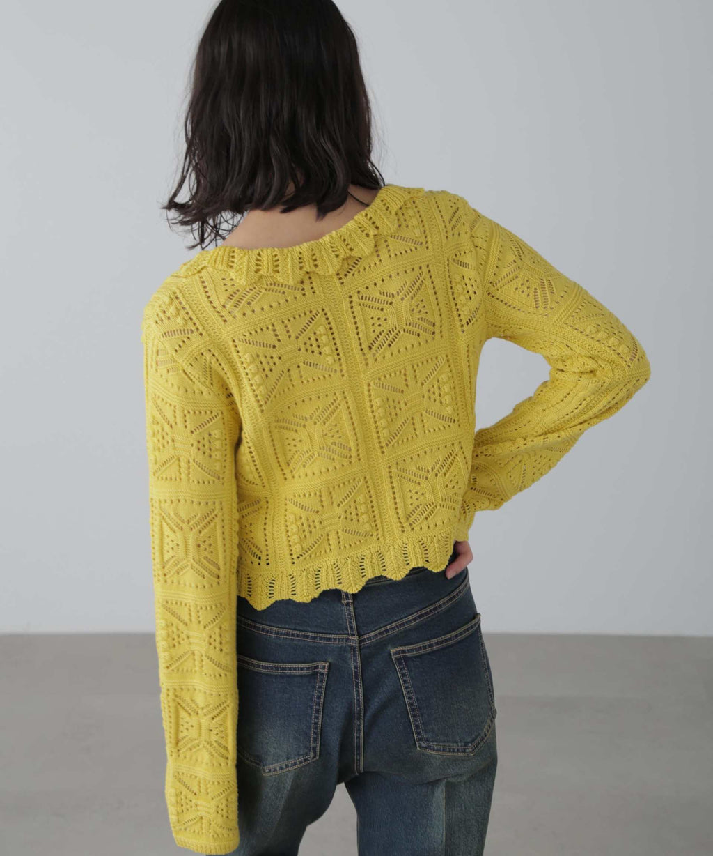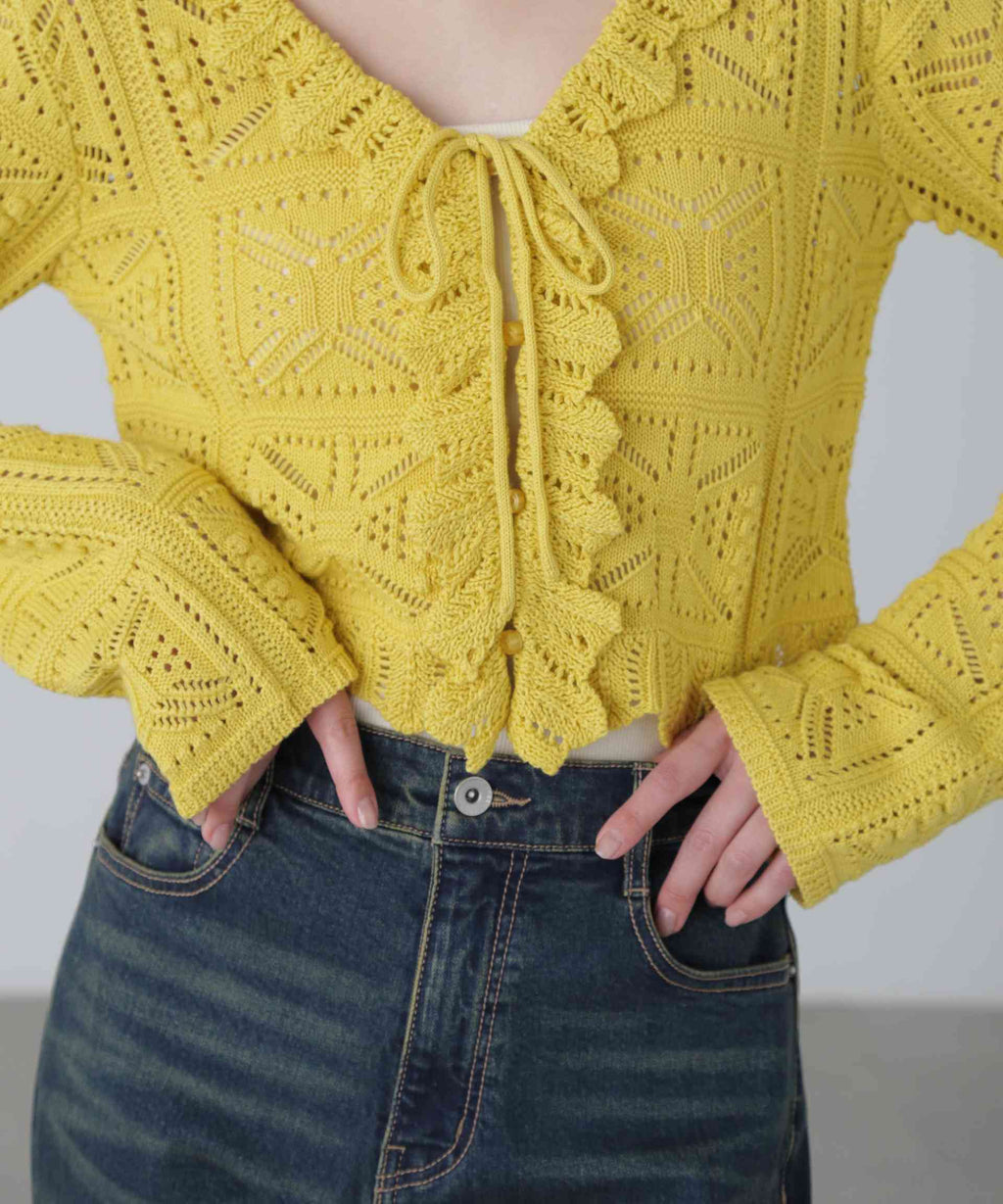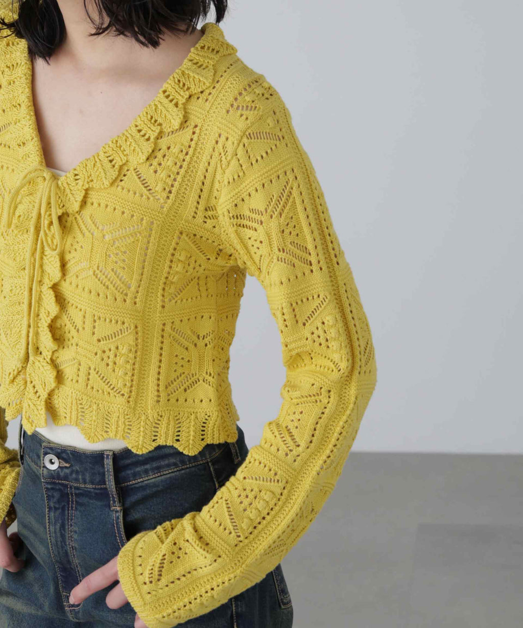 使用棉花和腈綸的休閒風格紗線,採用編有透空感的鉤針風格,具有工藝感的針織開衫。領口加入扇貝邊的荷葉邊裝飾,裙擺也用扇貝邊收邊。前面採用鈕扣設計,最上面配有蝴蝶結作為點綴。短款的長度和較長的袖長是今年的流行平衡。建議搭配吊帶衫或坦克背心與牛仔褲。也可以搭配短褲,享受度假風格。由於適度的透空編織,春季初也可以穿著。