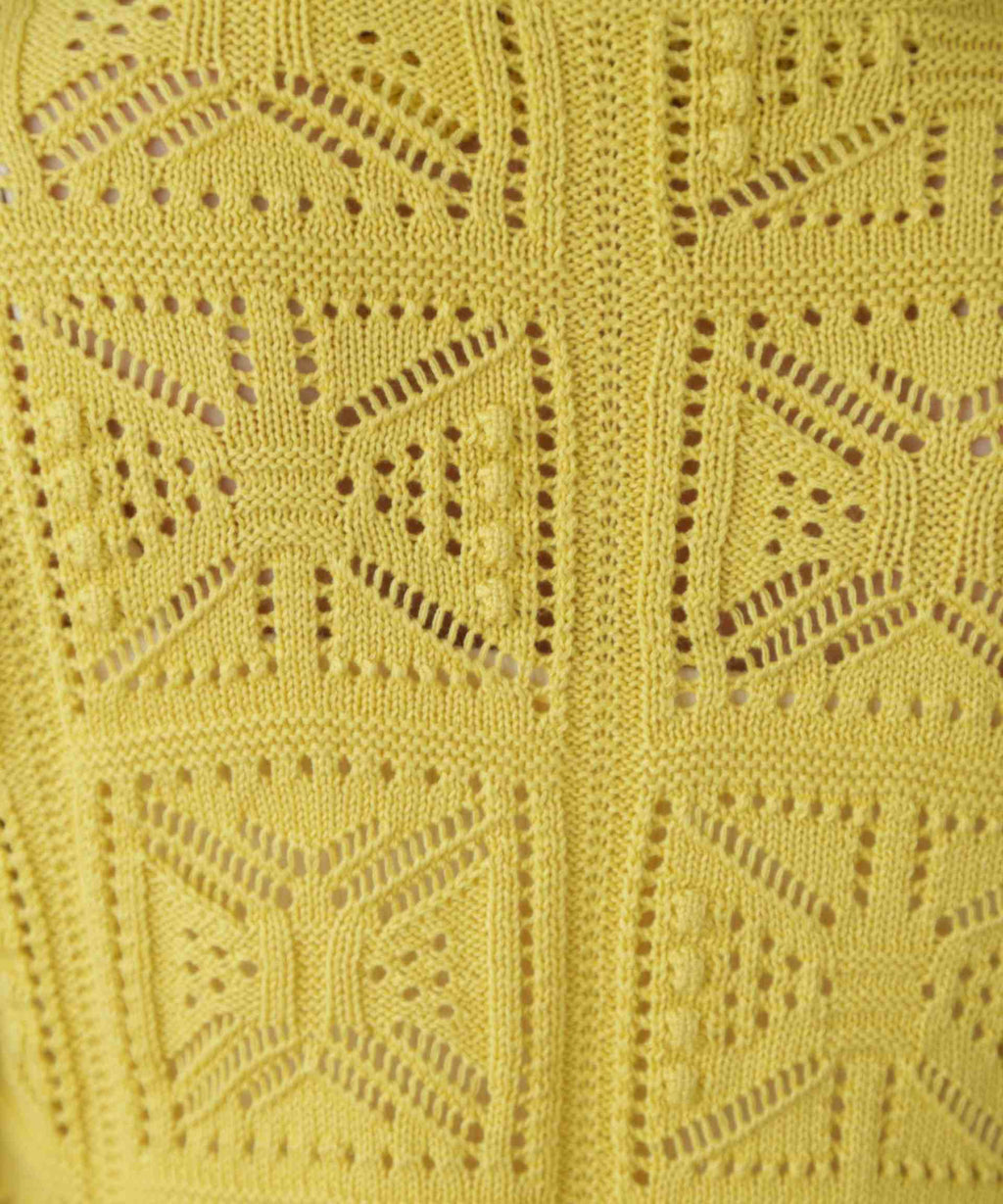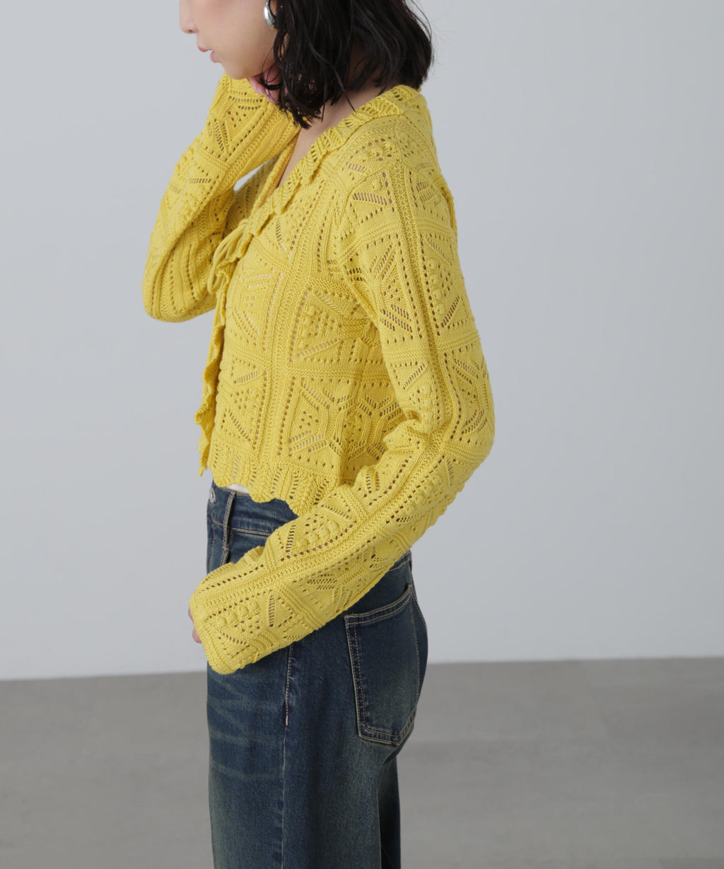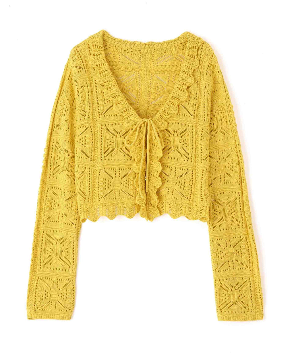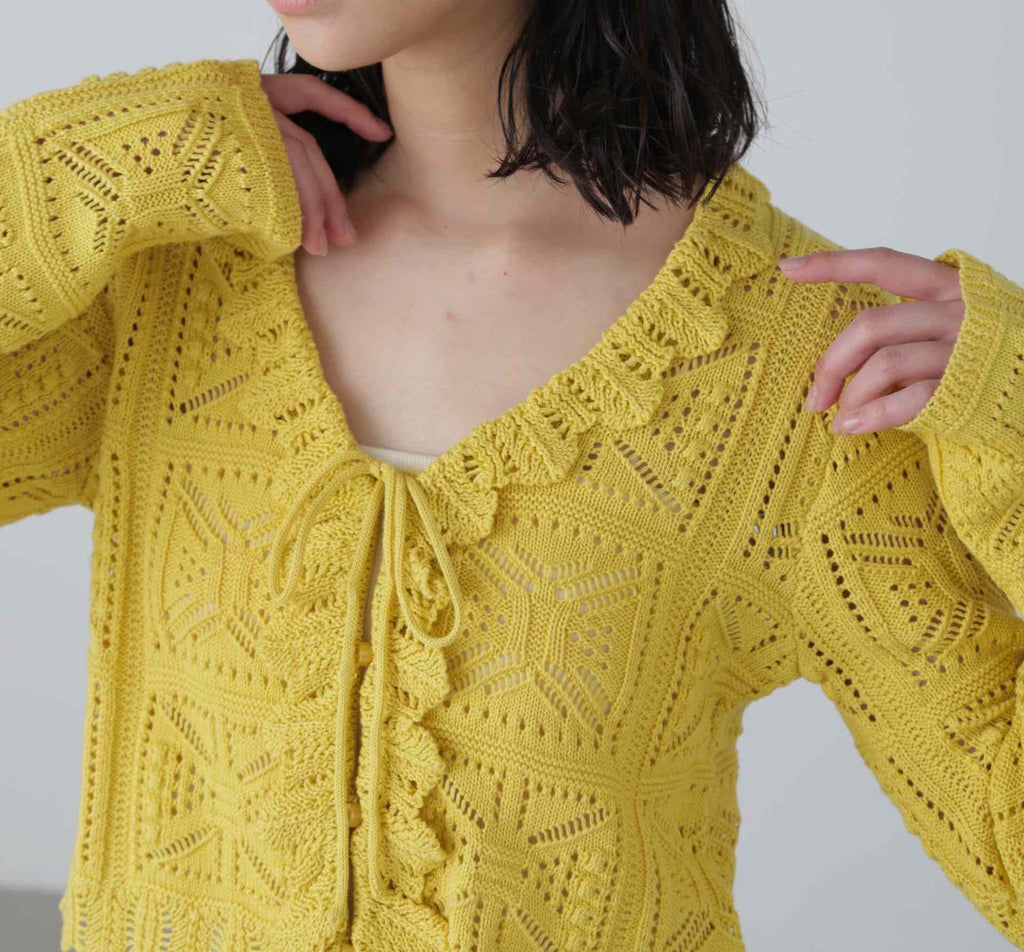 使用棉花和腈綸的休閒風格紗線,採用編有透空感的鉤針風格,具有工藝感的針織開衫。領口加入扇貝邊的荷葉邊裝飾,裙擺也用扇貝邊收邊。前面採用鈕扣設計,最上面配有蝴蝶結作為點綴。短款的長度和較長的袖長是今年的流行平衡。建議搭配吊帶衫或坦克背心與牛仔褲。也可以搭配短褲,享受度假風格。由於適度的透空編織,春季初也可以穿著。