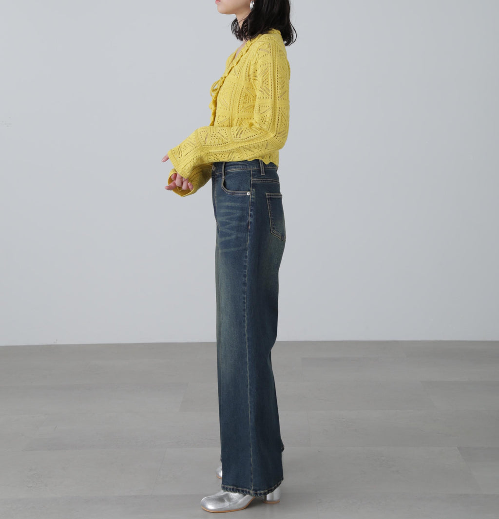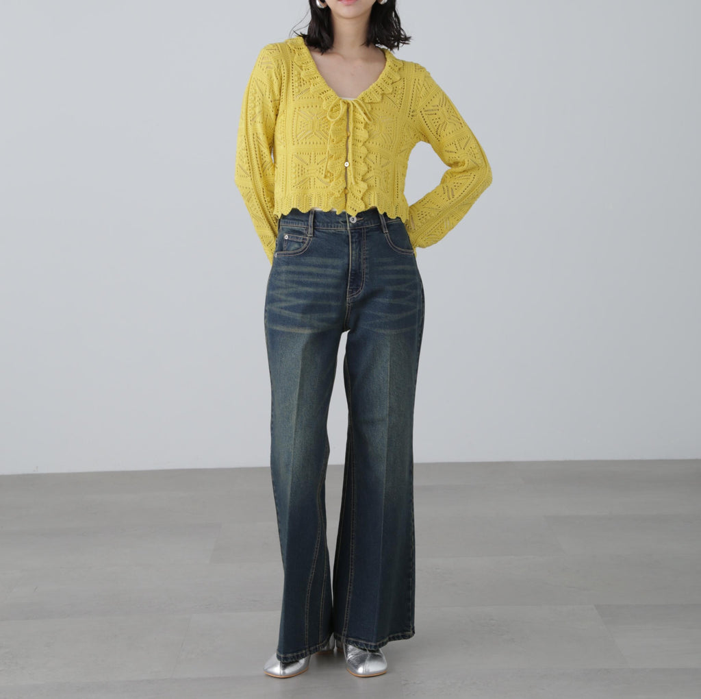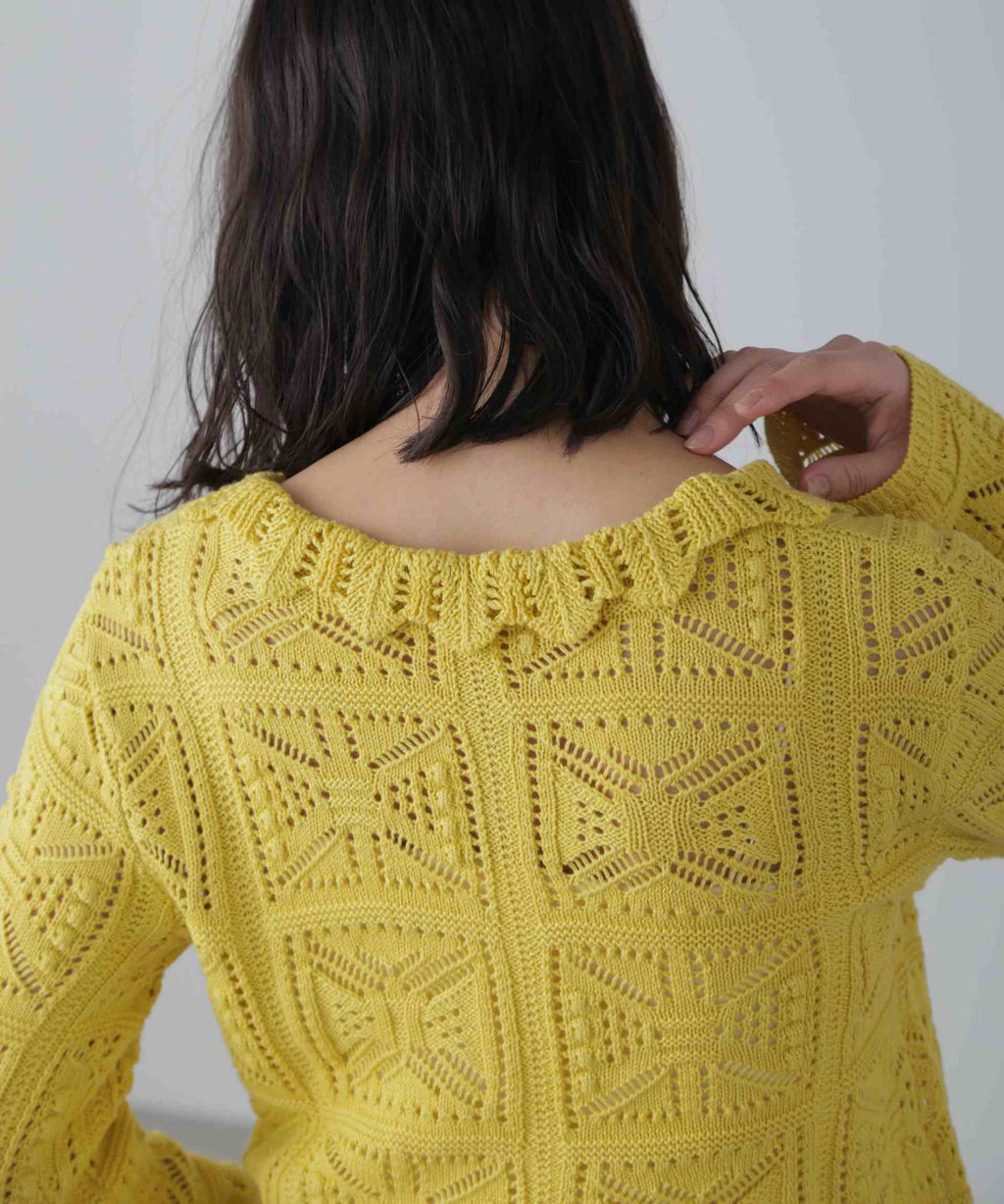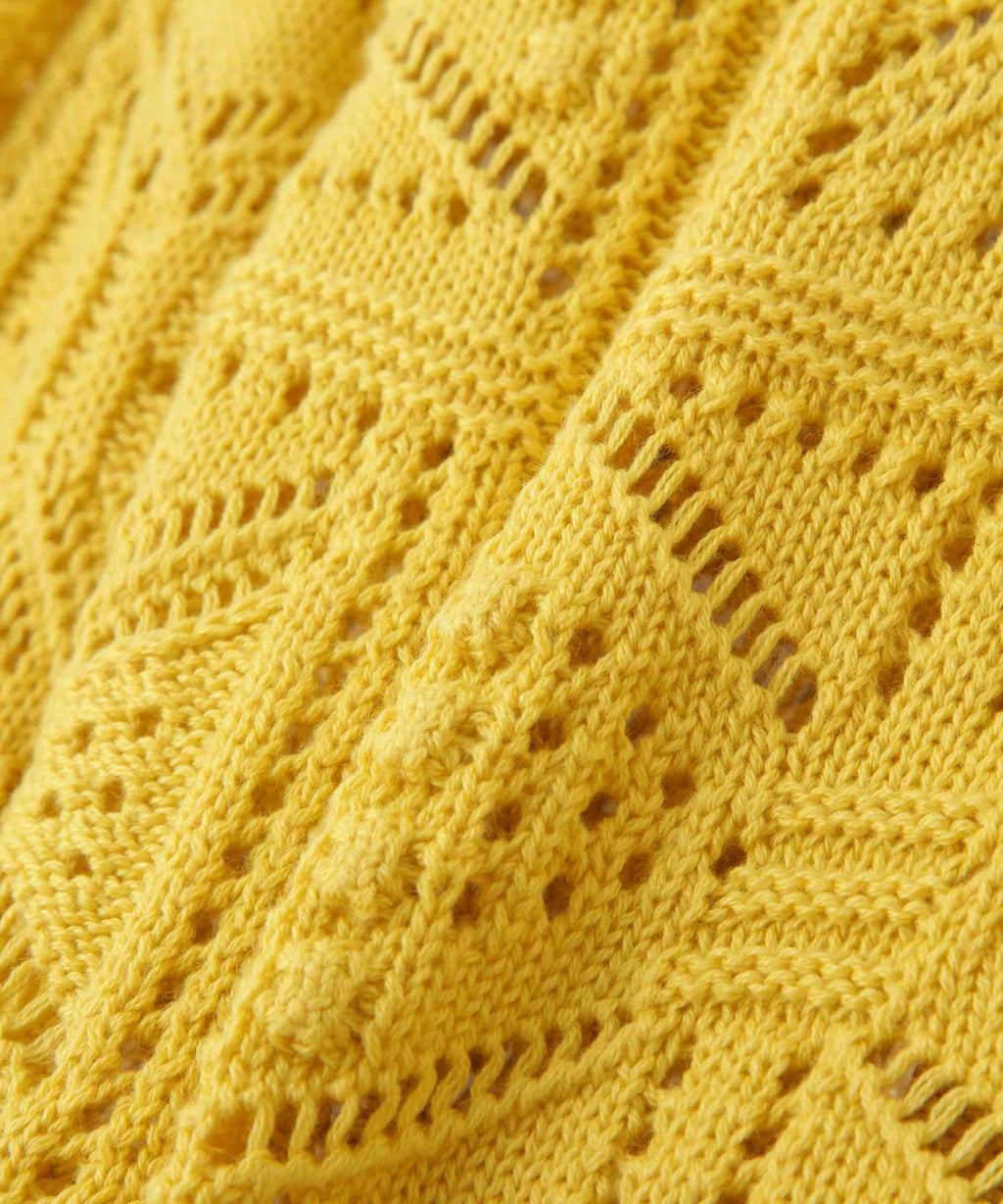 使用棉花和腈綸的休閒風格紗線,採用編有透空感的鉤針風格,具有工藝感的針織開衫。領口加入扇貝邊的荷葉邊裝飾,裙擺也用扇貝邊收邊。前面採用鈕扣設計,最上面配有蝴蝶結作為點綴。短款的長度和較長的袖長是今年的流行平衡。建議搭配吊帶衫或坦克背心與牛仔褲。也可以搭配短褲,享受度假風格。由於適度的透空編織,春季初也可以穿著。