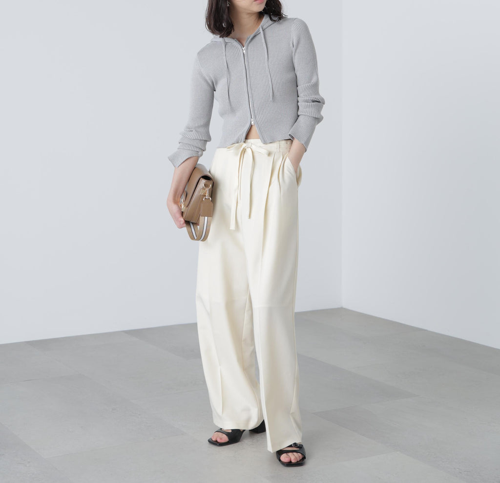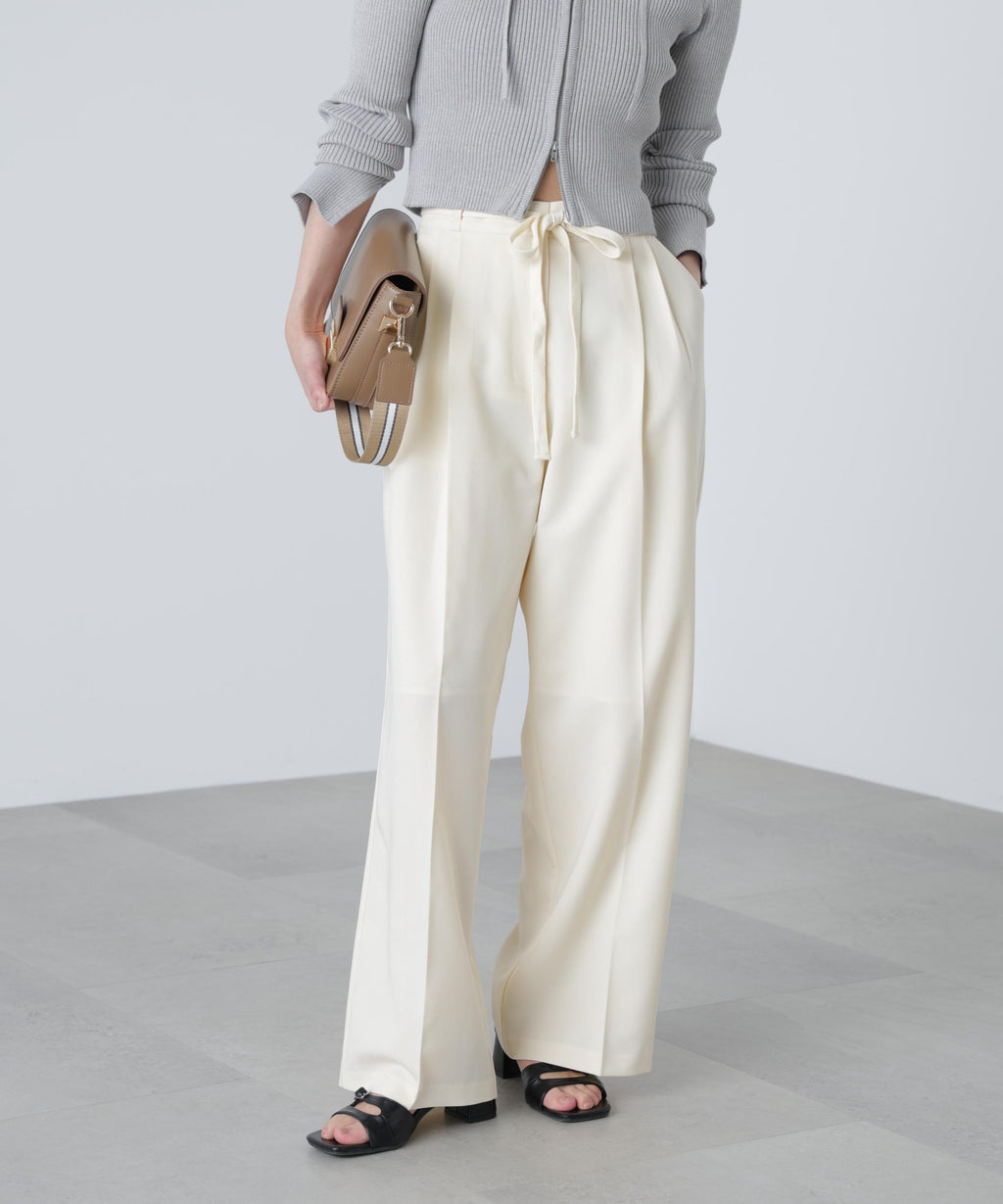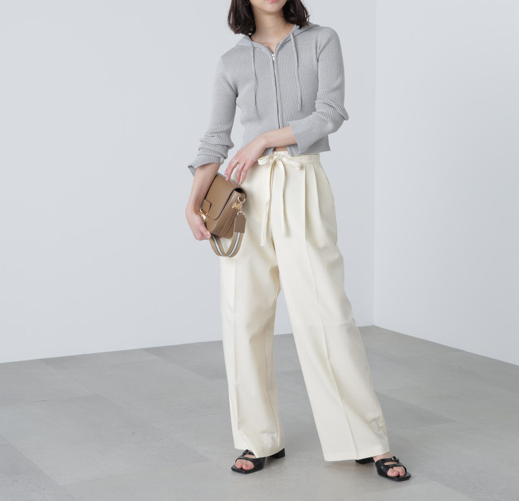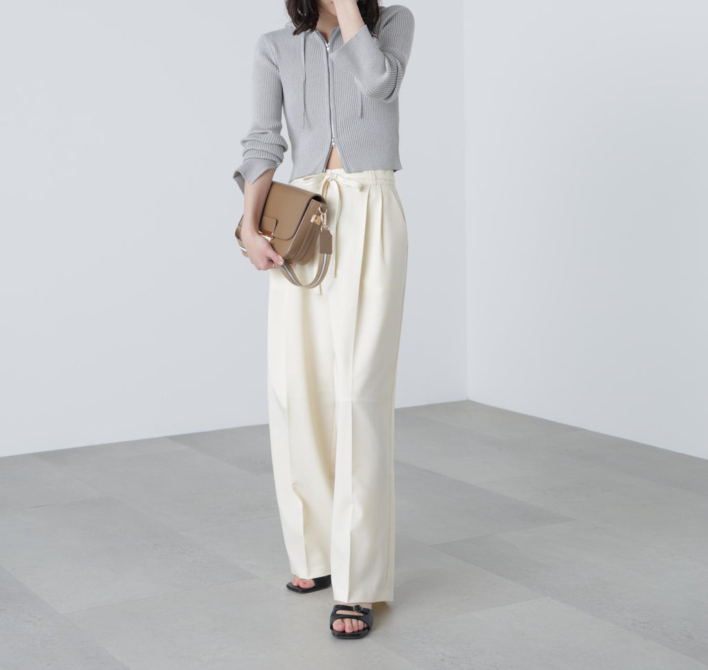 這款寬褲採用輕盈的T/R材質,觸感柔滑。中央壓褶設計展現整潔感,並配有雙褶設計,穿著時不會緊束腰部。腰帶搭配休閒風格的杉綾帶蝴蝶結。腰帶可拆卸,平日穿著時也可以作為正式的休閒褲穿搭。建議搭配印花T恤、潮流條紋T恤或 Polo 衫。腳部搭配運動鞋,增添休閒感也是不錯的選擇。