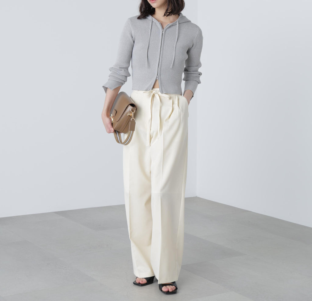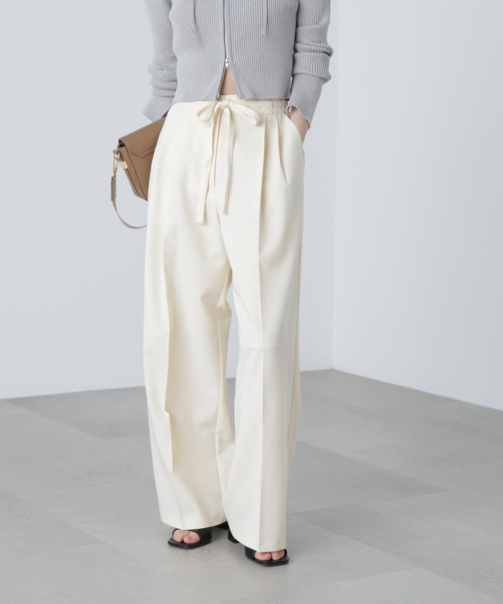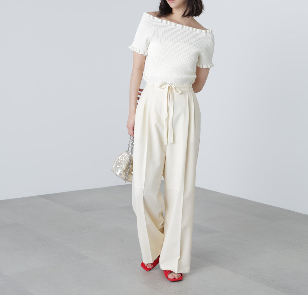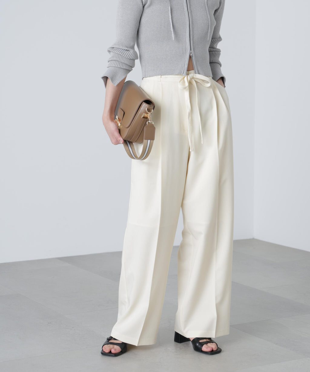 這款寬褲採用輕盈的T/R材質,觸感柔滑。中央壓褶設計展現整潔感,並配有雙褶設計,穿著時不會緊束腰部。腰帶搭配休閒風格的杉綾帶蝴蝶結。腰帶可拆卸,平日穿著時也可以作為正式的休閒褲穿搭。建議搭配印花T恤、潮流條紋T恤或 Polo 衫。腳部搭配運動鞋,增添休閒感也是不錯的選擇。