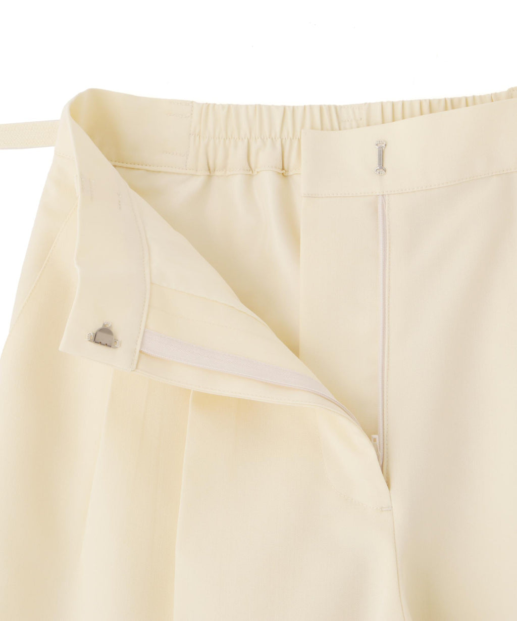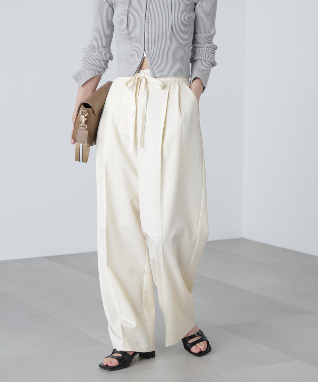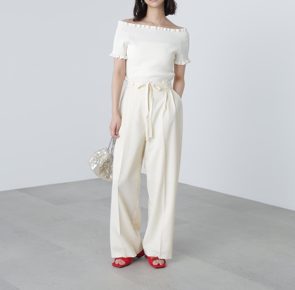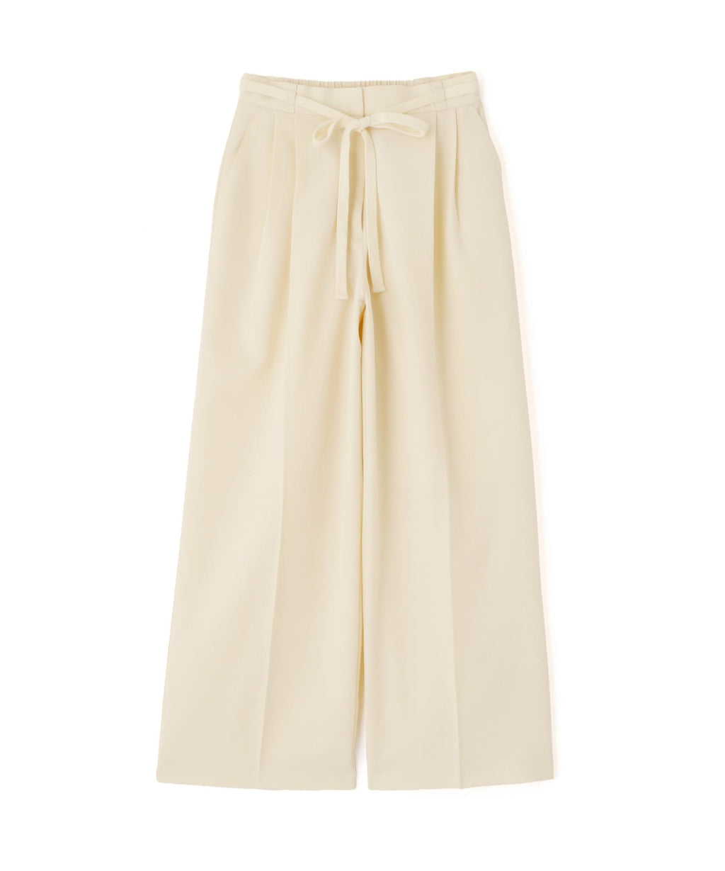 這款寬褲採用輕盈的T/R材質,觸感柔滑。中央壓褶設計展現整潔感,並配有雙褶設計,穿著時不會緊束腰部。腰帶搭配休閒風格的杉綾帶蝴蝶結。腰帶可拆卸,平日穿著時也可以作為正式的休閒褲穿搭。建議搭配印花T恤、潮流條紋T恤或 Polo 衫。腳部搭配運動鞋,增添休閒感也是不錯的選擇。