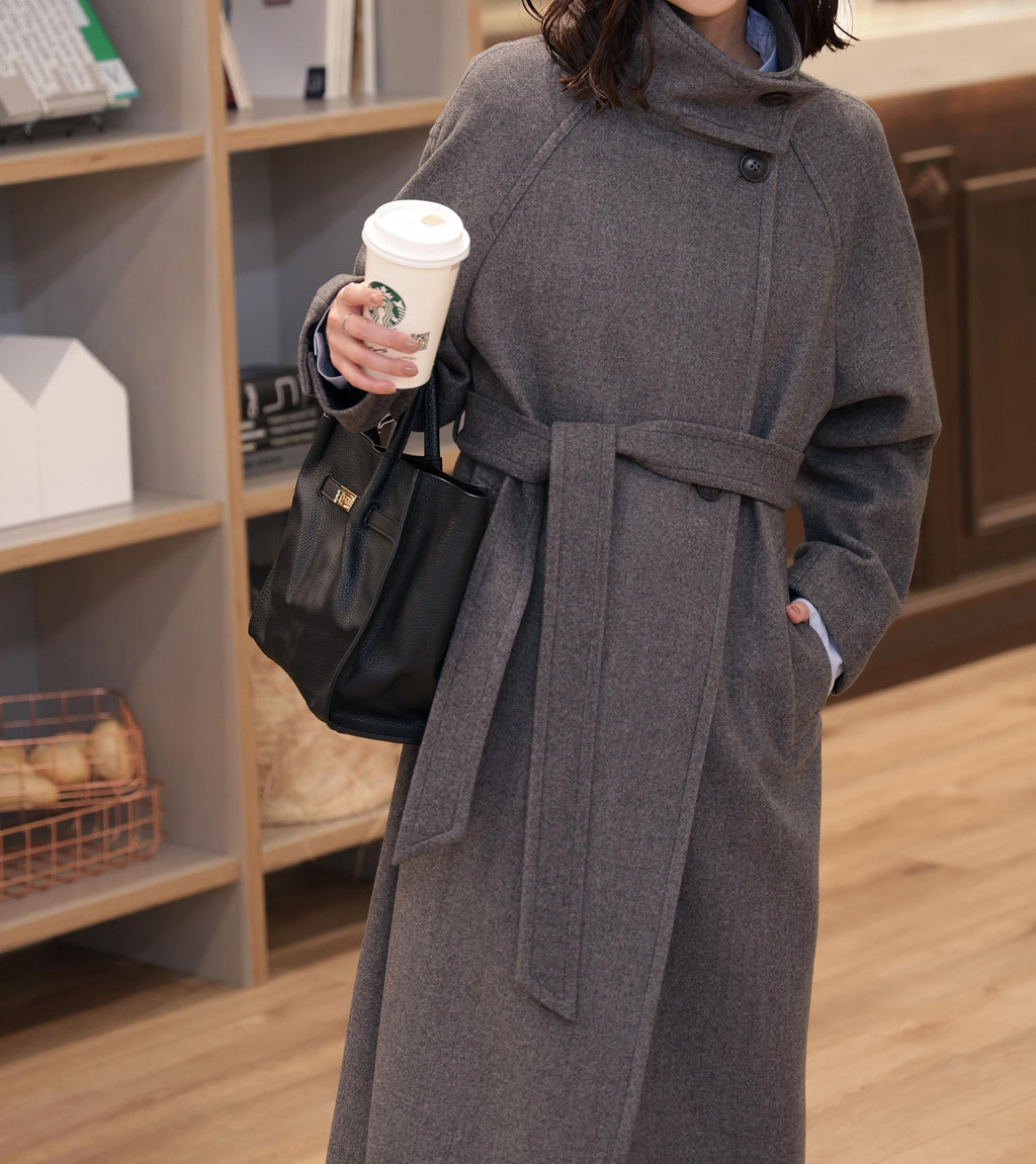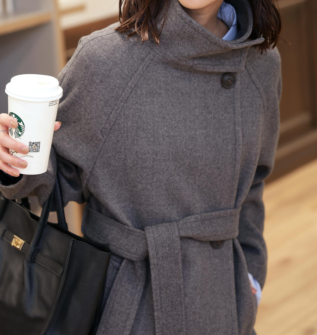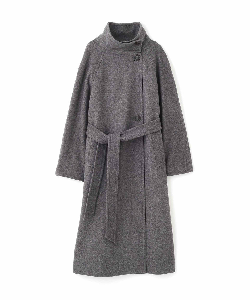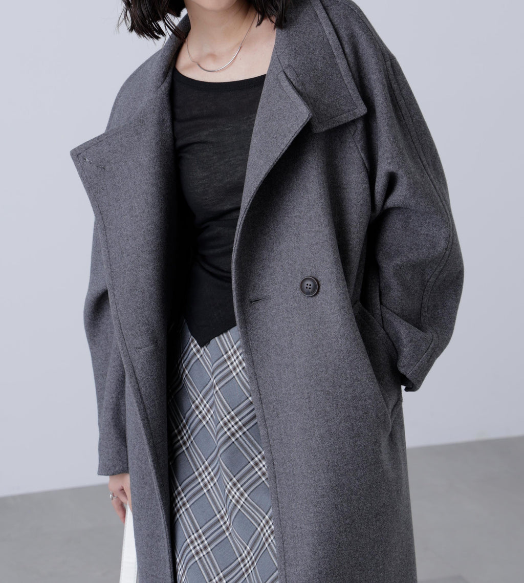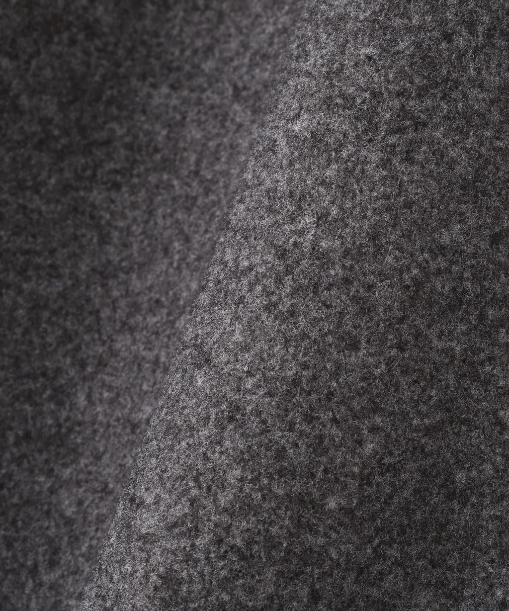 縫製素材をフェルト化して織り上げたオリジナル生地のロングコート。メルトン羊毛素材の見た目をジャージ素材で表現したコートは、防寒にも優れており、打ち込みの強い高級感のある生地を使用。形はスタンドカラーで襟腰が高く、(1)ボタンを全て閉じる、(2)襟腰のワンボタンと第二ボタンを外して襟を返す、(3)ボタンを全てオープンにするなど、様々な表情に変わります。インナーにニットを着込みやすいラグランスリーブとゆとりのあるバスト設定。付属で腰圍ベルトが付いているので、好みで絞ったり、ベルト無しでAラインも楽しめます。