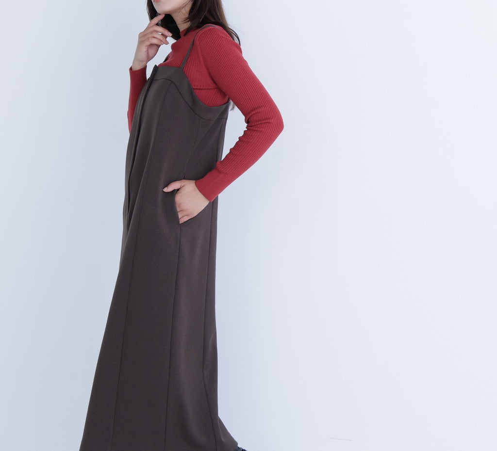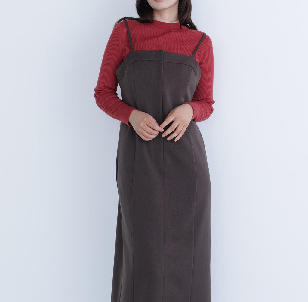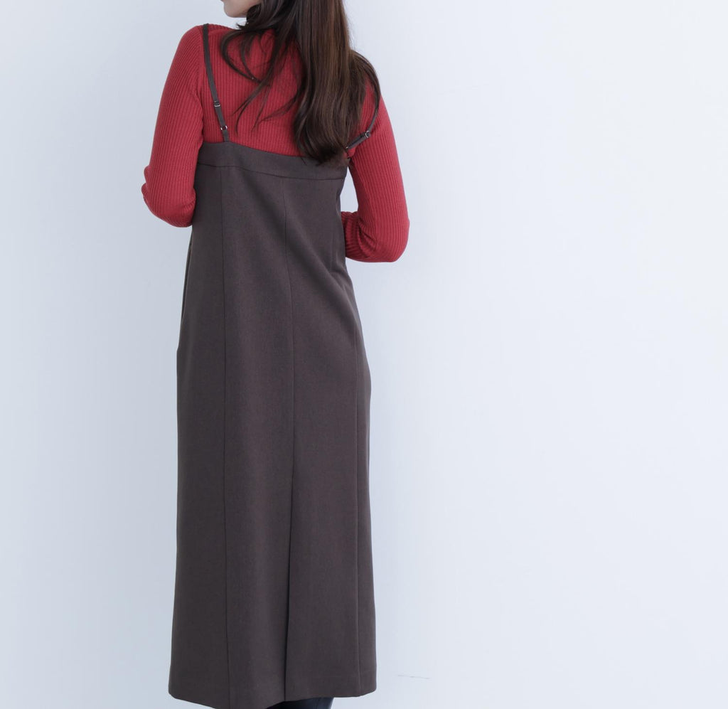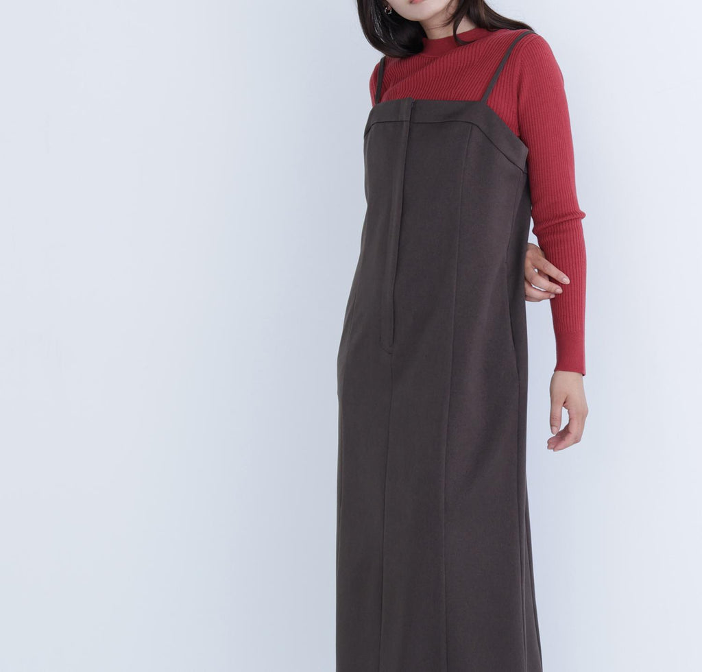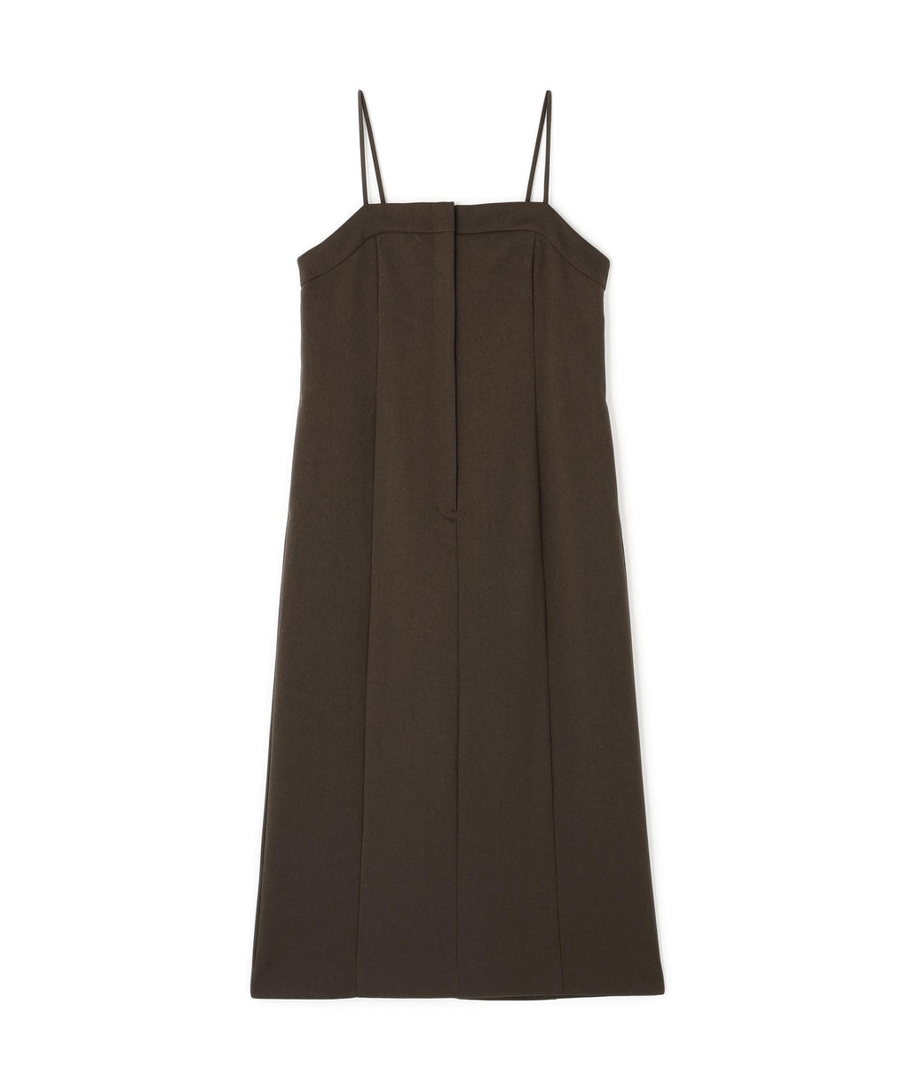 與同素材的短款夾克搭配的背心洋裝。既可作為套裝,也可單獨穿著,具有高回搭性,適合正式與休閒場合。這款背心洋裝採用拼接設計,腰部柔和塑形,後方設有中心折縫。肩帶可調整長度。