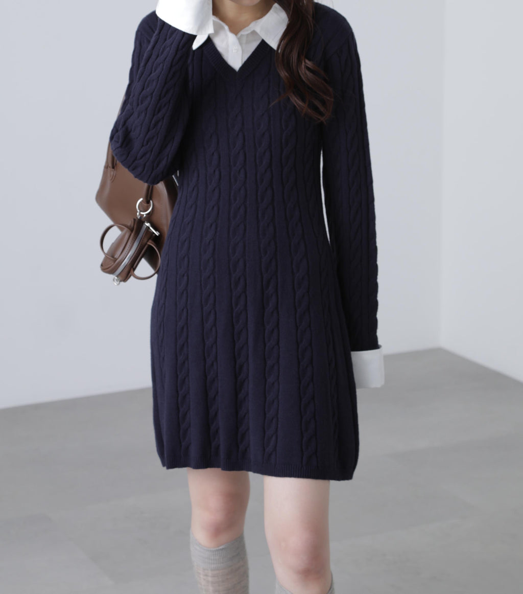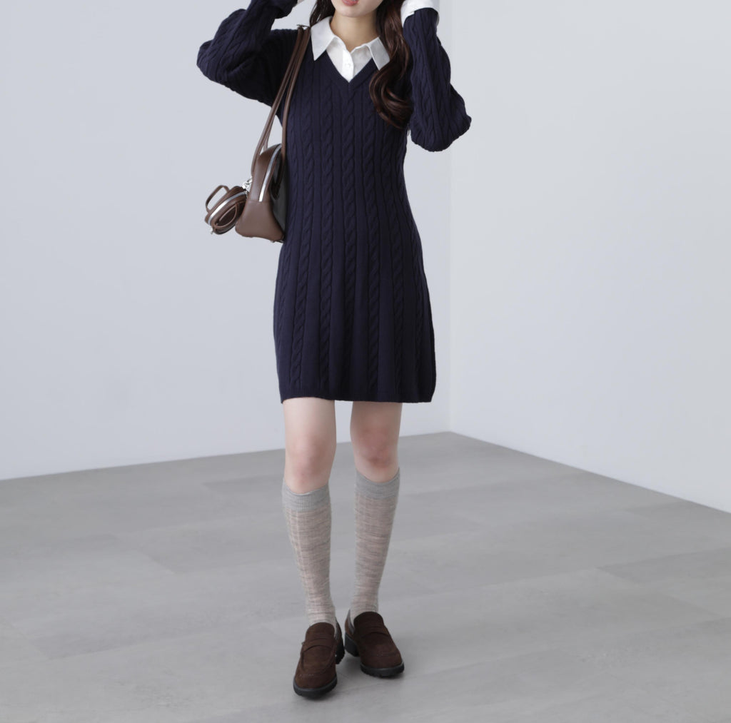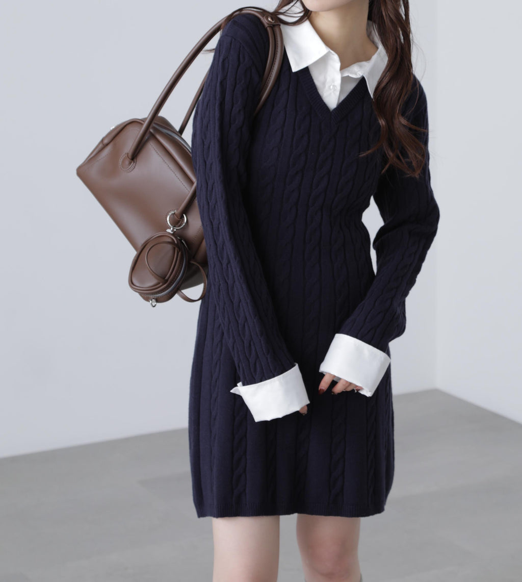 今季趨勢的網球核心意識的襯衫層次風格設計的連衣裙。身體部分是針織,袖子和領子是布料的襯衫面料的接合。結實的肉感,單穿也能安心穿著。細緻的纜織強調了縱向線條,腰圍自然收緊的設計,期待提升身形。建議將領子的一個鈕扣打開來穿搭。可以沿著針織袖口的羅紋折返袖口,或將袖口的一個鈕扣打開也可以穿著。