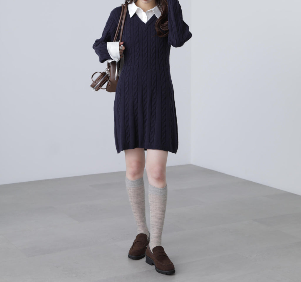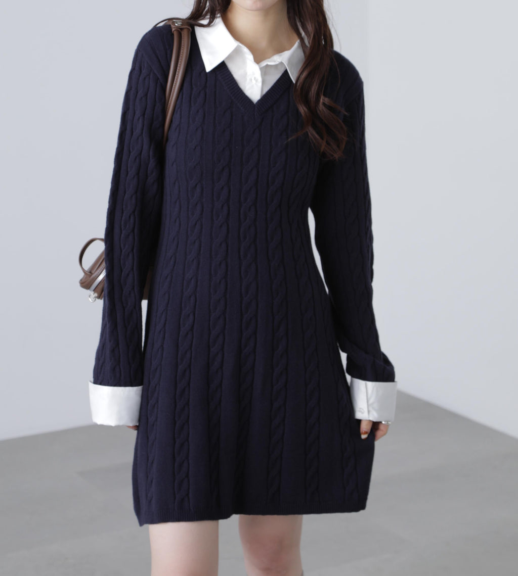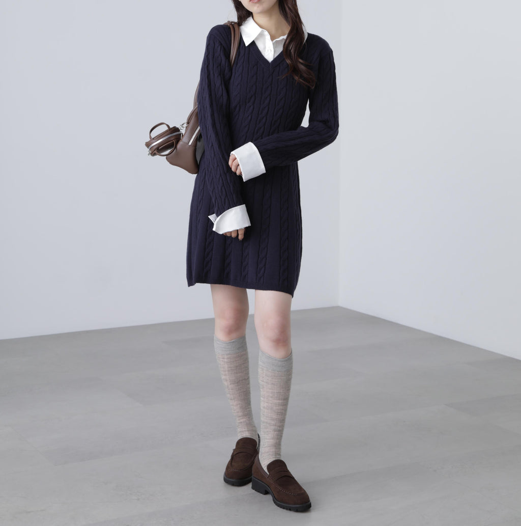 今季趨勢的網球核心意識的襯衫層次風格設計的連衣裙。身體部分是針織,袖子和領子是布料的襯衫面料的接合。結實的肉感,單穿也能安心穿著。細緻的纜織強調了縱向線條,腰圍自然收緊的設計,期待提升身形。建議將領子的一個鈕扣打開來穿搭。可以沿著針織袖口的羅紋折返袖口,或將袖口的一個鈕扣打開也可以穿著。