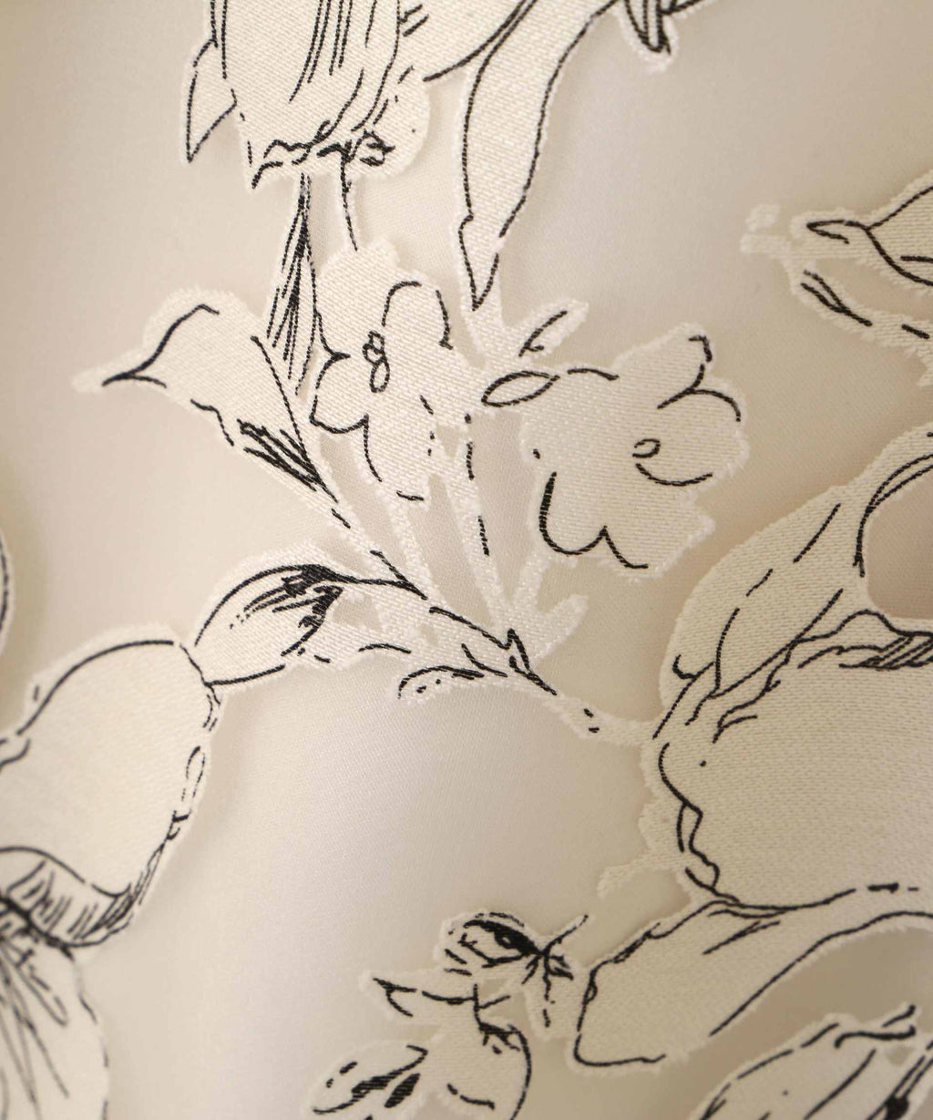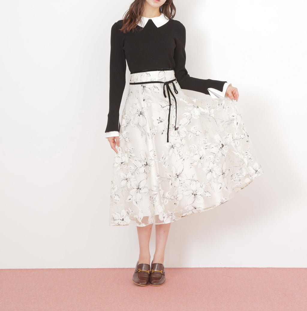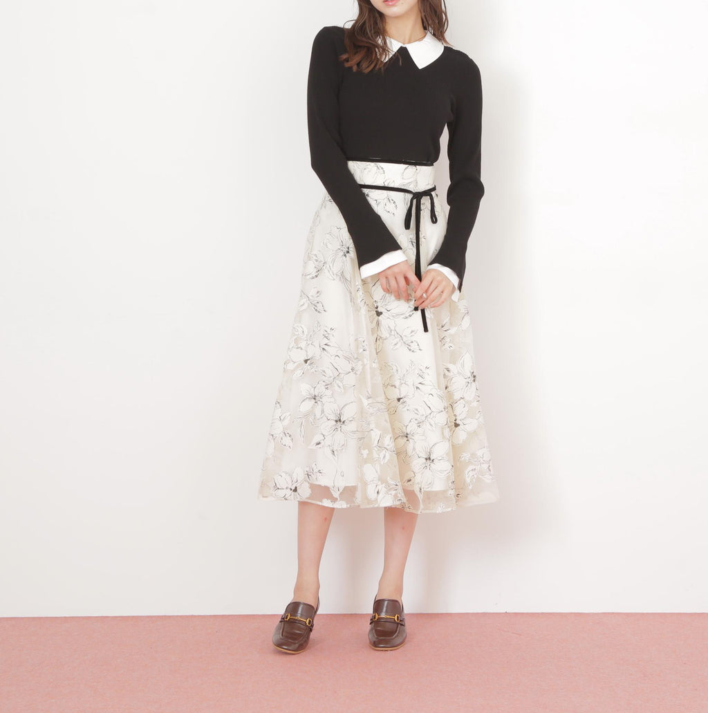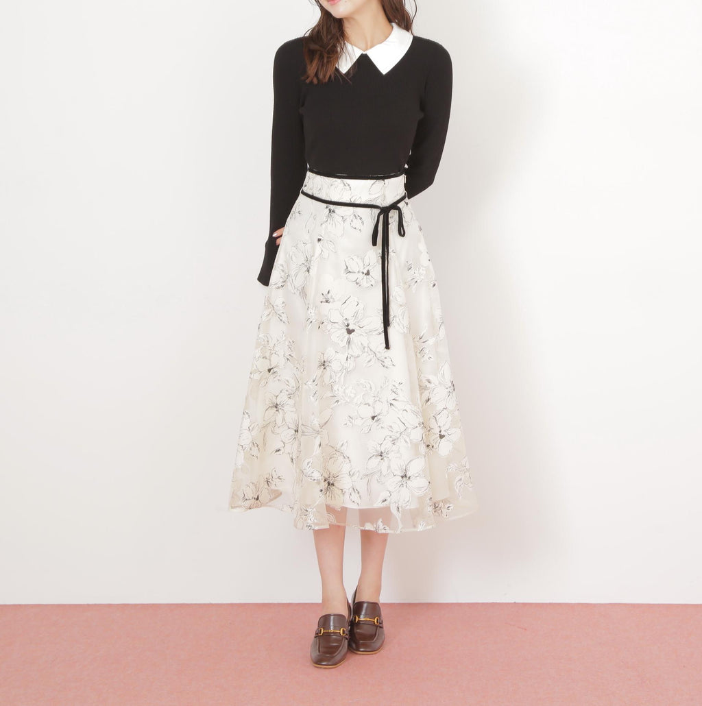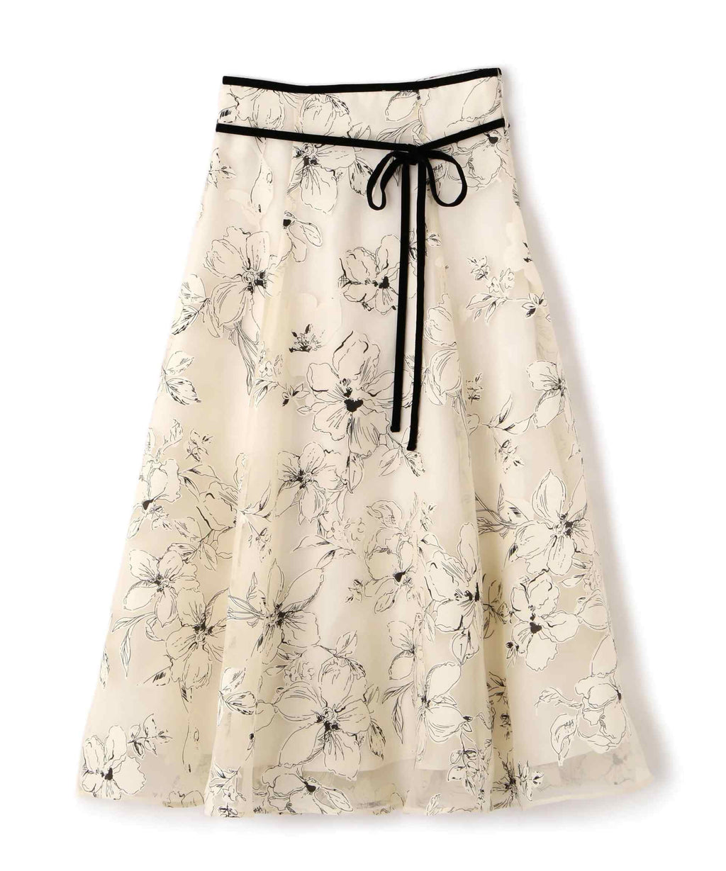 施加了蛋白石加工的大型線條花紋印花裙。適合秋冬風格的天鵝絨絲帶是亮點。展現出腰部周圍的清爽感,營造出喇叭裙線條。搭配假毛皮無領外套的外出搭配,或是清爽的針織衫、蓬鬆的針織衫也非常合適。※由於拍攝時的照明關係,顏色可能會有所不同。