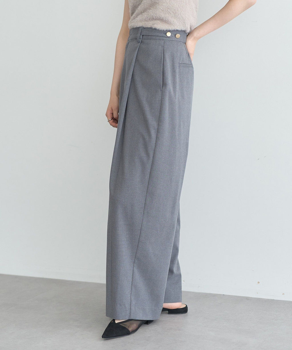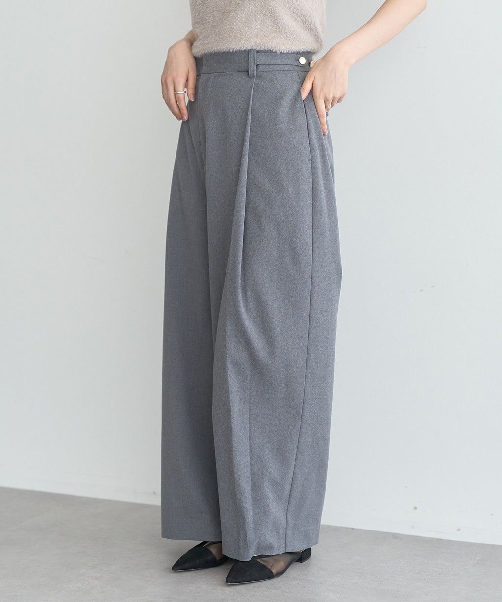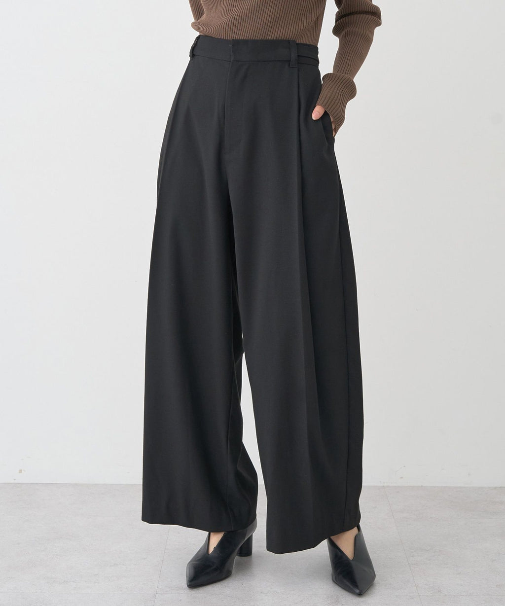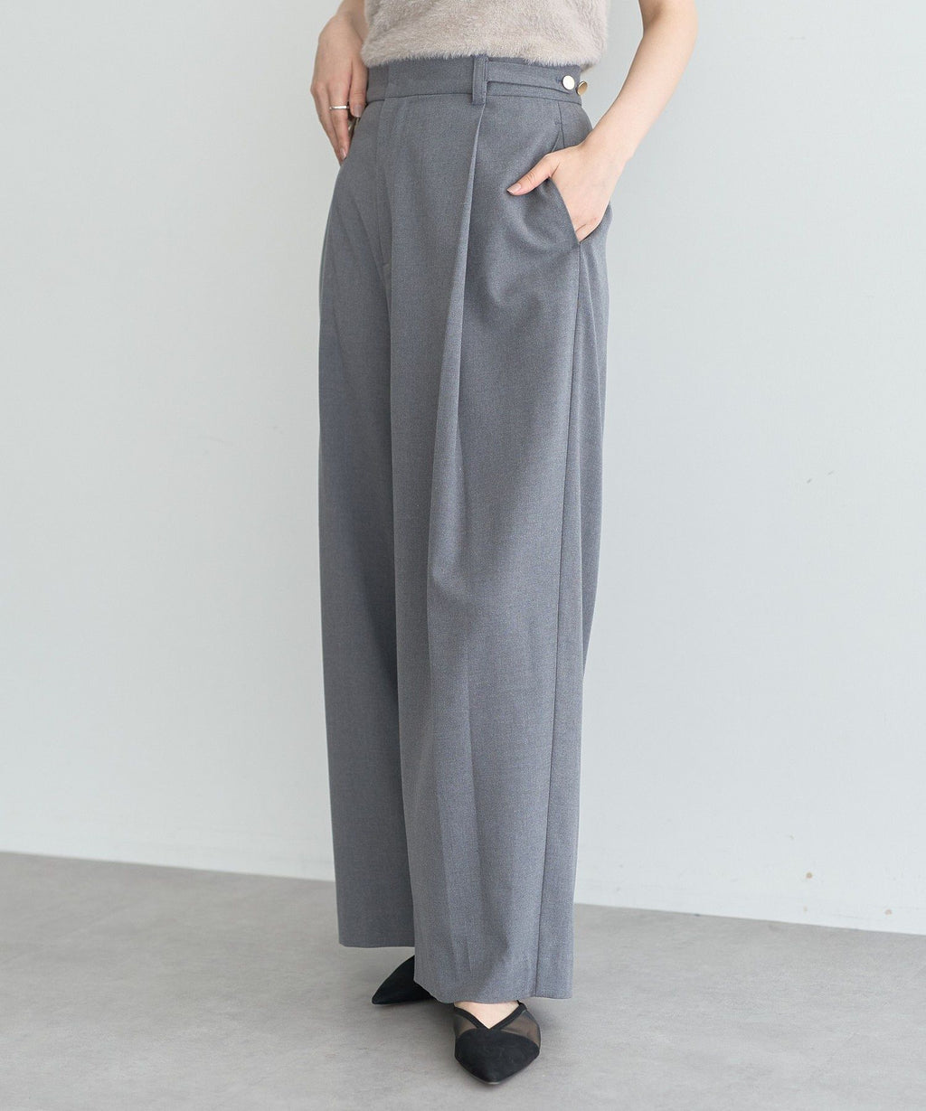 深邃的摺痕給人印象深刻的優雅寬鬆褲。後面鬆緊帶設計和深襠的設計,提供舒適的穿著感受。腰部的標籤位置可以調整,能夠以高腰的方式穿著,這也是一個令人高興的特點。無論搭配什麼上衣,都容易搭配,從休閒到優雅的各種場合都能發揮作用,是一個推薦的單品。