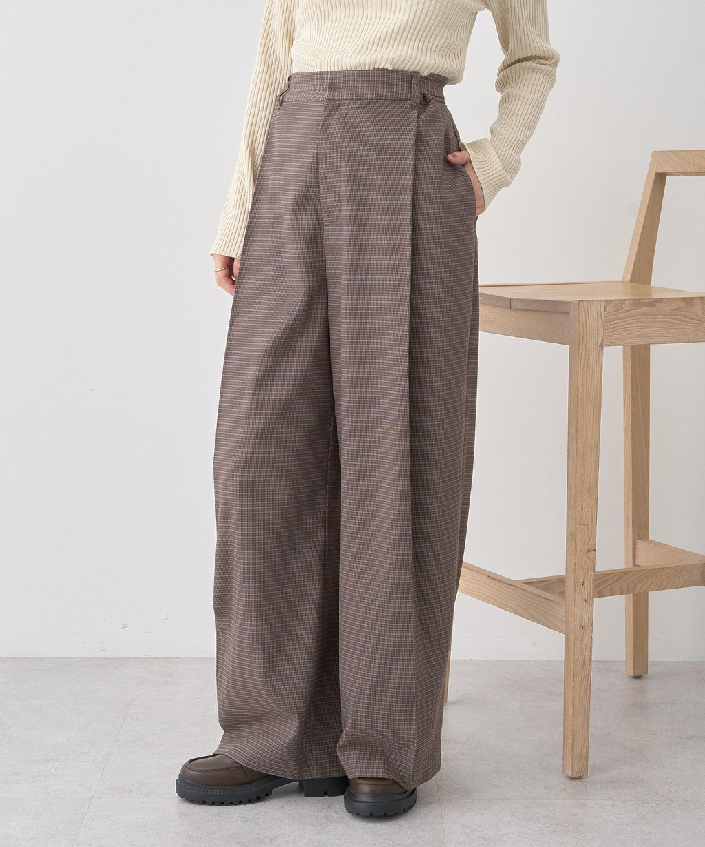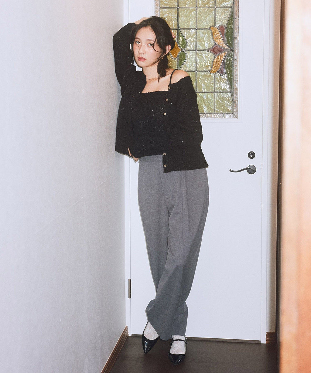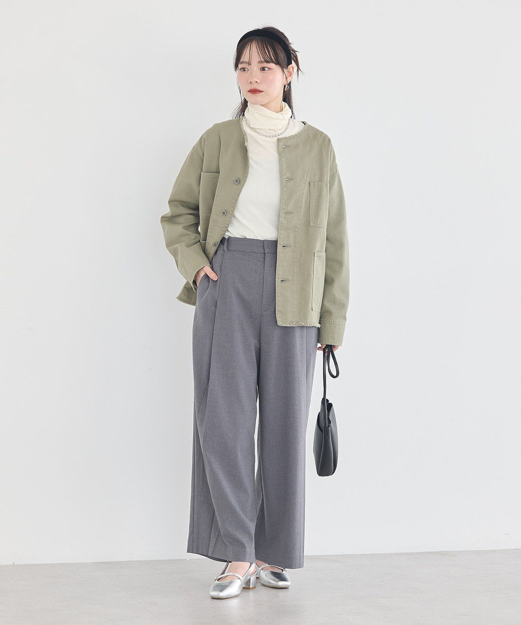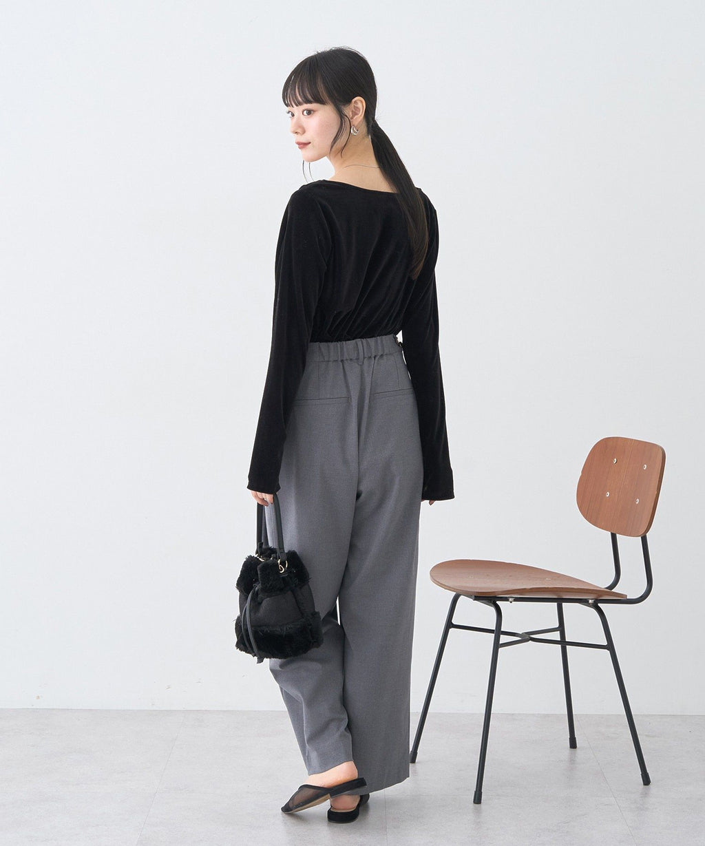 深邃的摺痕給人印象深刻的優雅寬鬆褲。後面鬆緊帶設計和深襠的設計,提供舒適的穿著感受。腰部的標籤位置可以調整,能夠以高腰的方式穿著,這也是一個令人高興的特點。無論搭配什麼上衣,都容易搭配,從休閒到優雅的各種場合都能發揮作用,是一個推薦的單品。