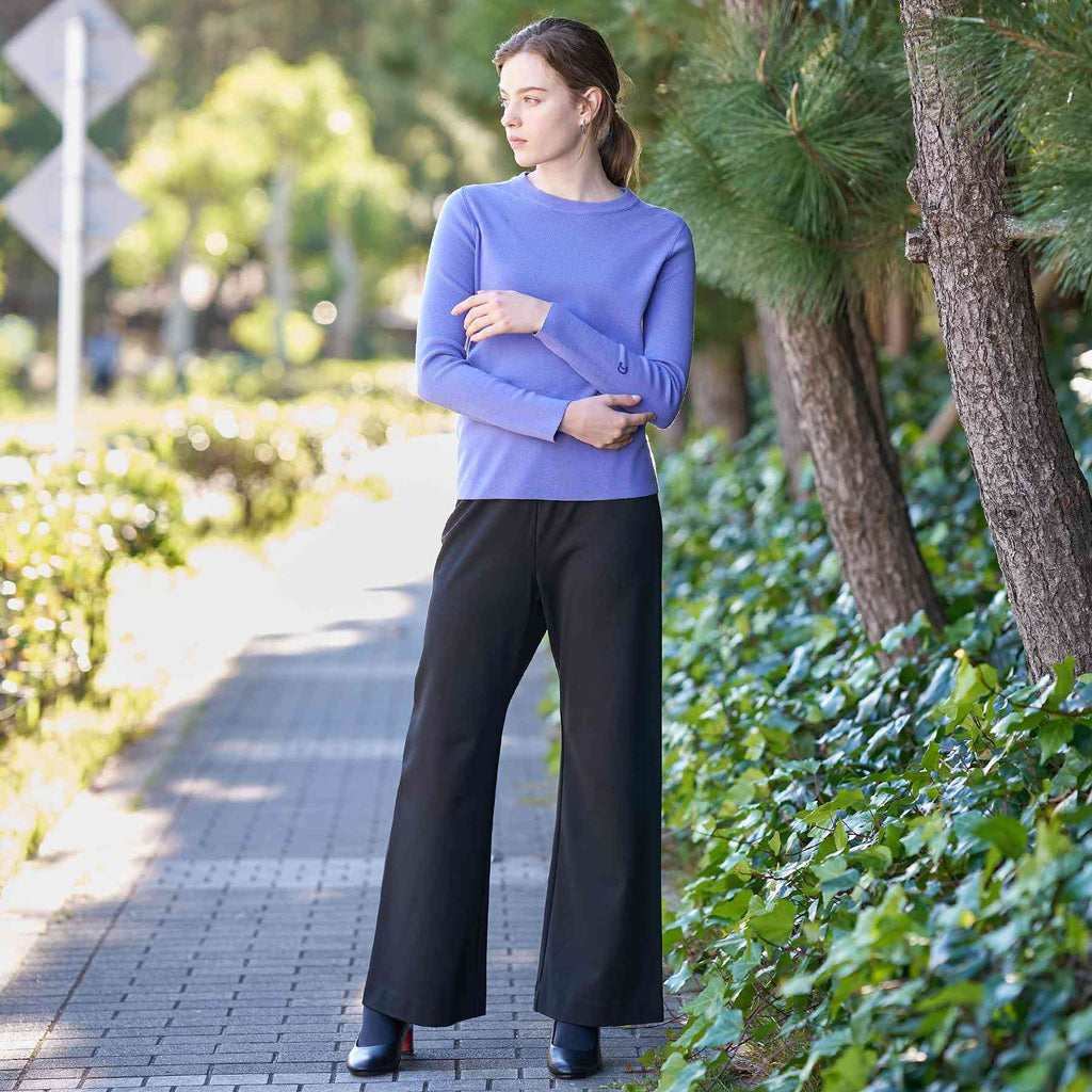 去年廣受好評的輕鬆舒適穿著感是雙層針織寬褲的魅力所在。
