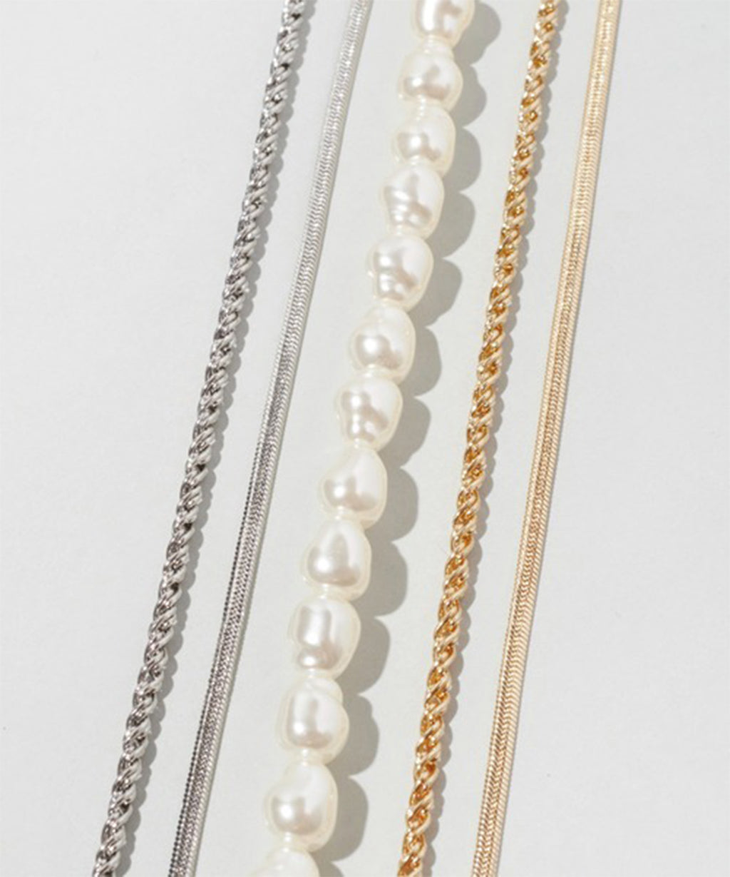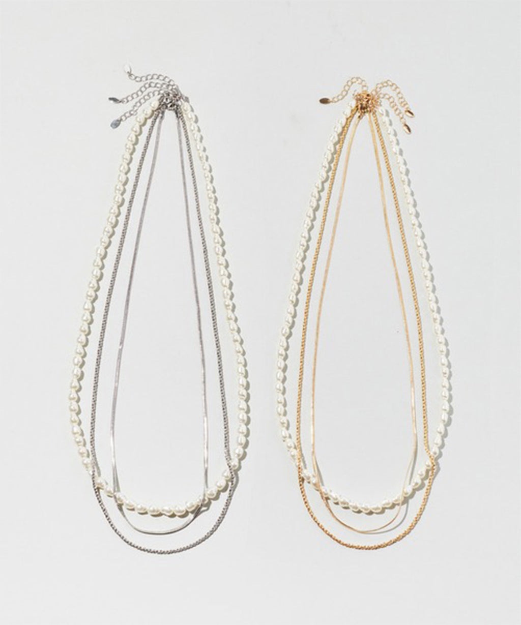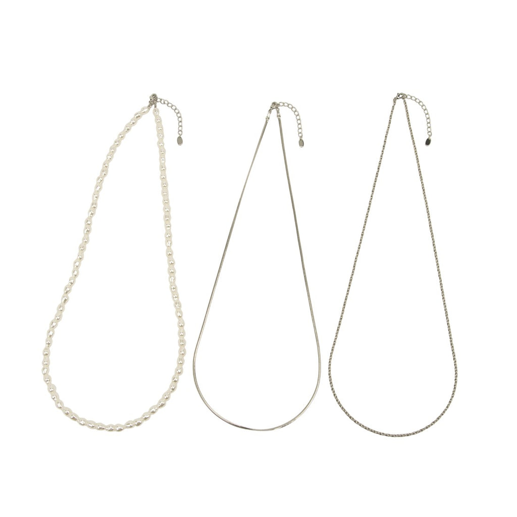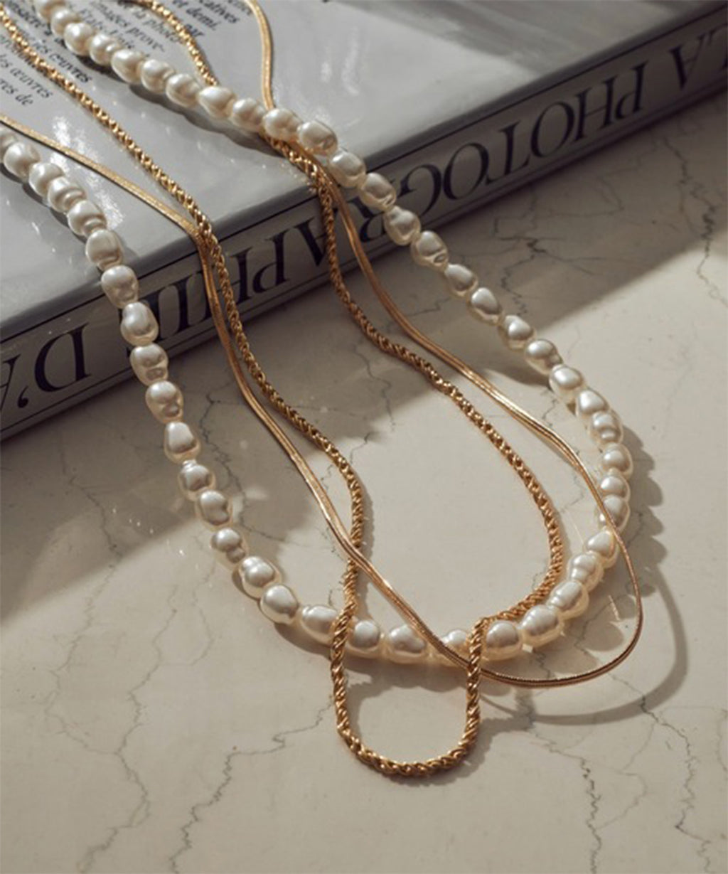 這是一套由珍珠項鍊、繩狀鏈條和蛇形鏈條三種設計和質感各異的項鍊組合而成的套裝。
