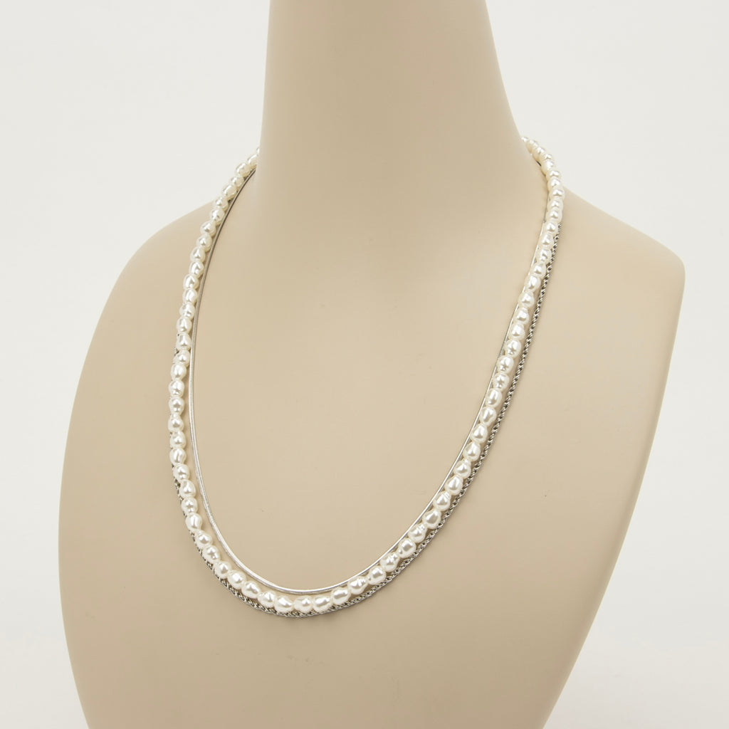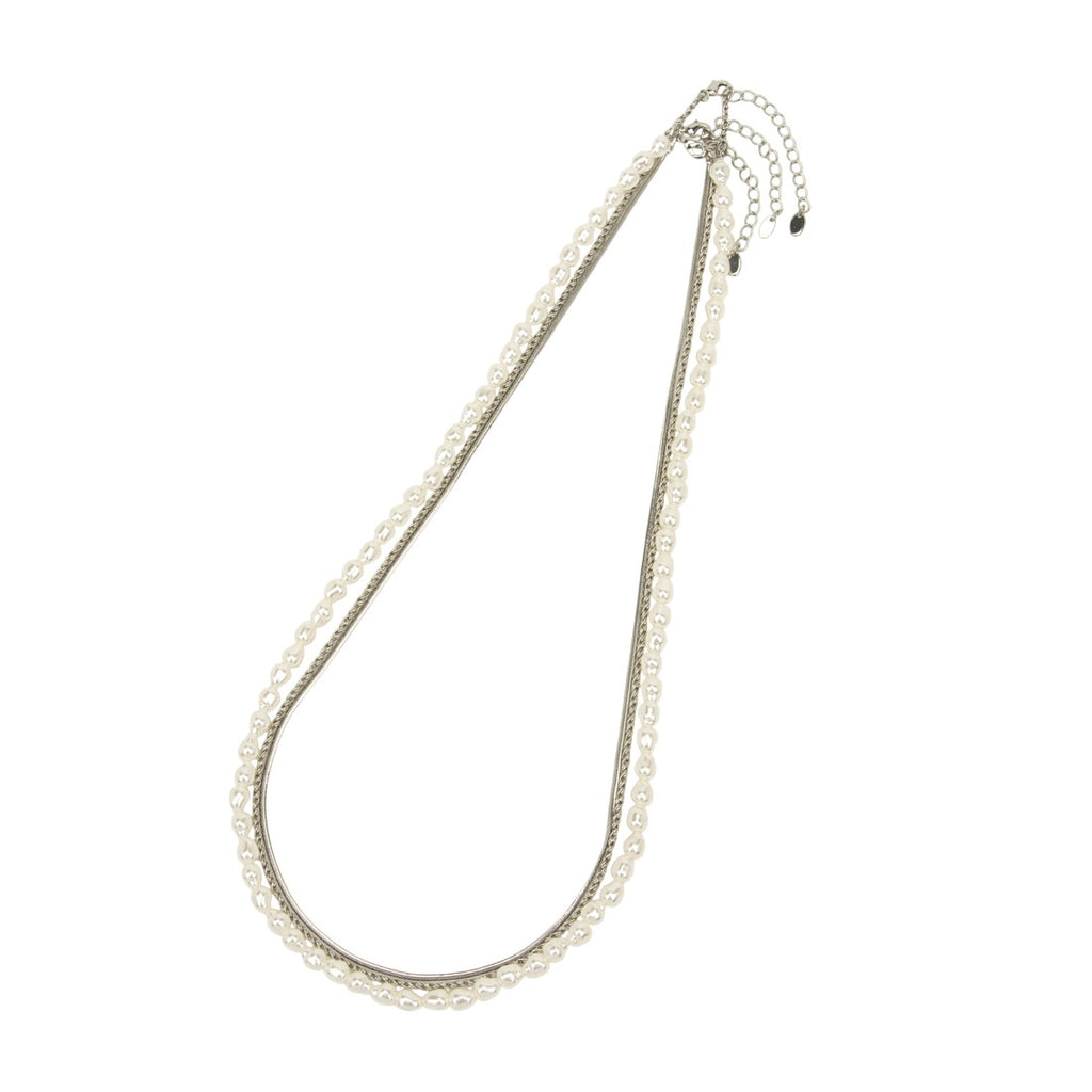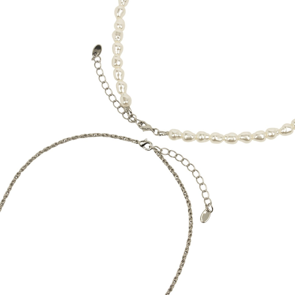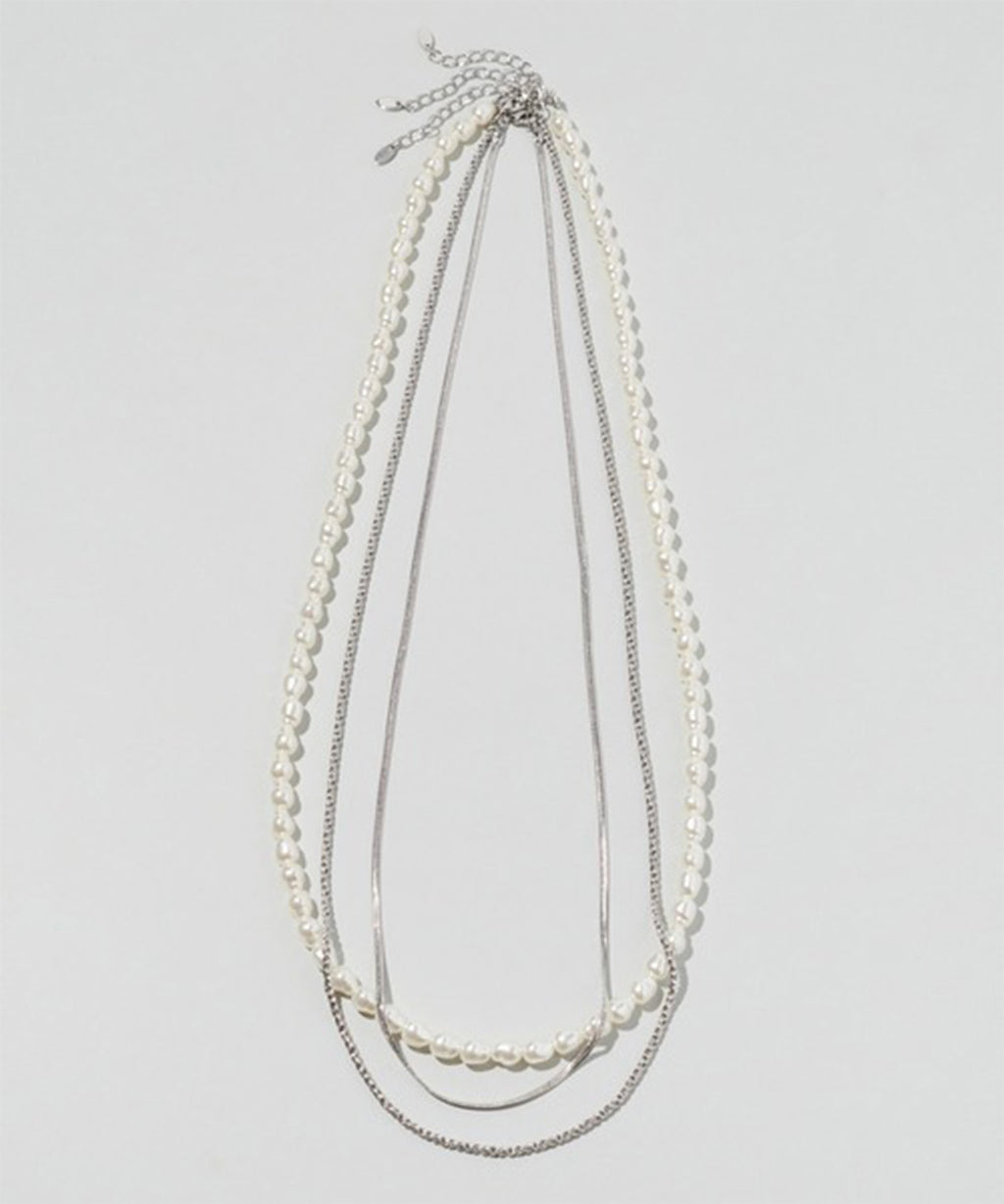 這是一套由珍珠項鍊、繩狀鏈條和蛇形鏈條三種設計和質感各異的項鍊組合而成的套裝。