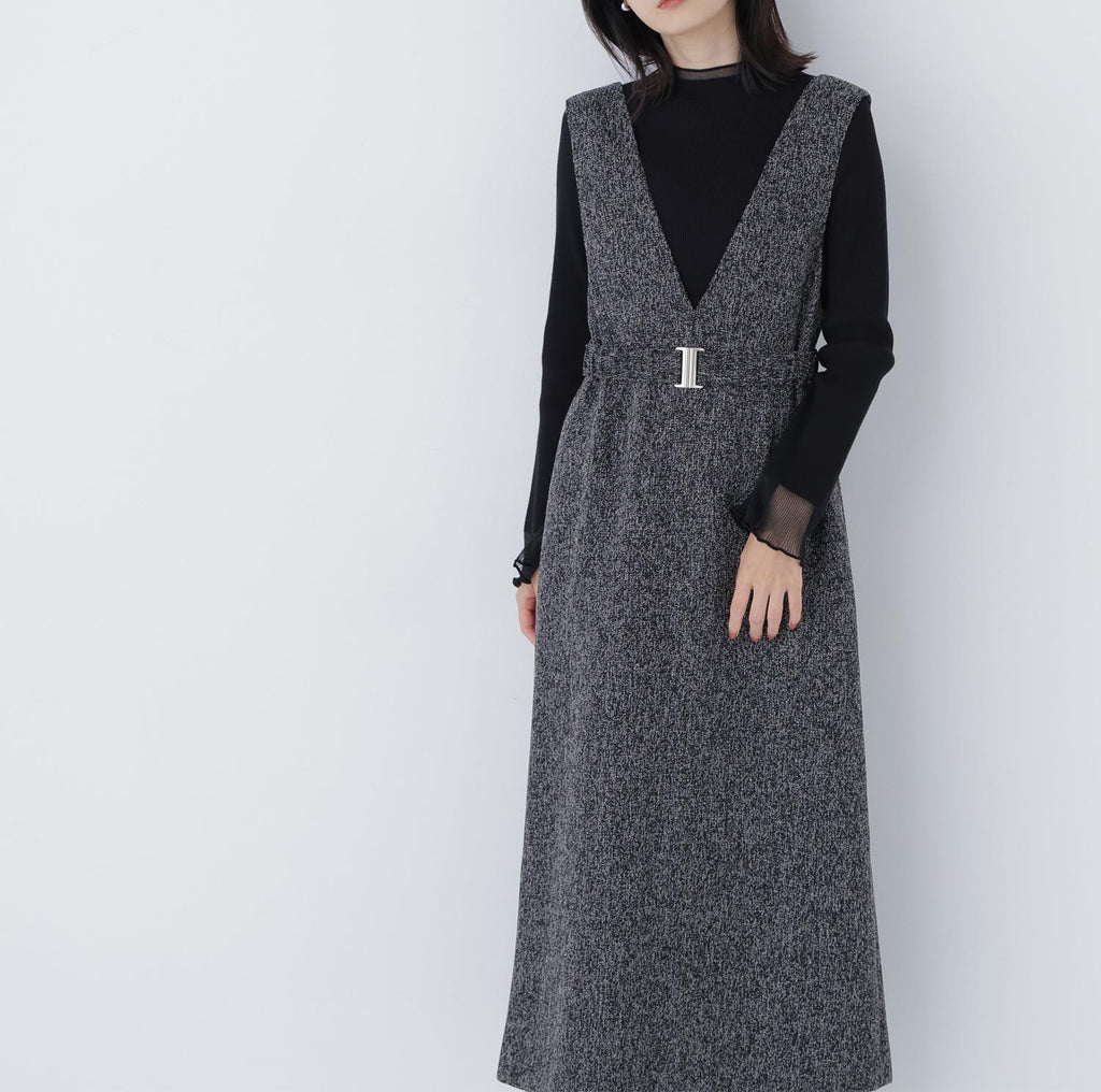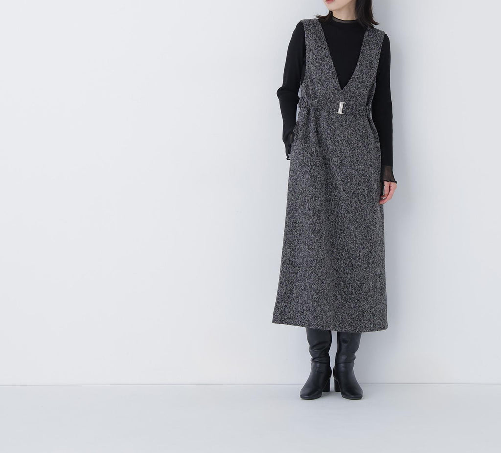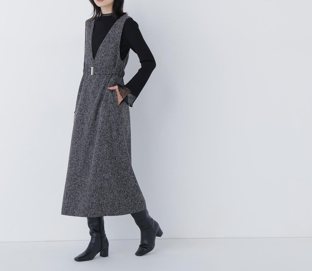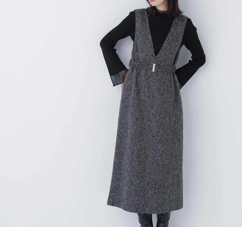 內搭容易層疊的簡潔V領,展現出大人的隨性感的連身裙。用同布料的橡膠腰帶標記腰圍,展現出美麗的輪廓。金屬扣環成為點綴,適度地增添時尚感。腰帶可拆卸,因此即使是窄版輪廓也可以穿著。優雅的呢料素材提升了秋冬風格的品味。