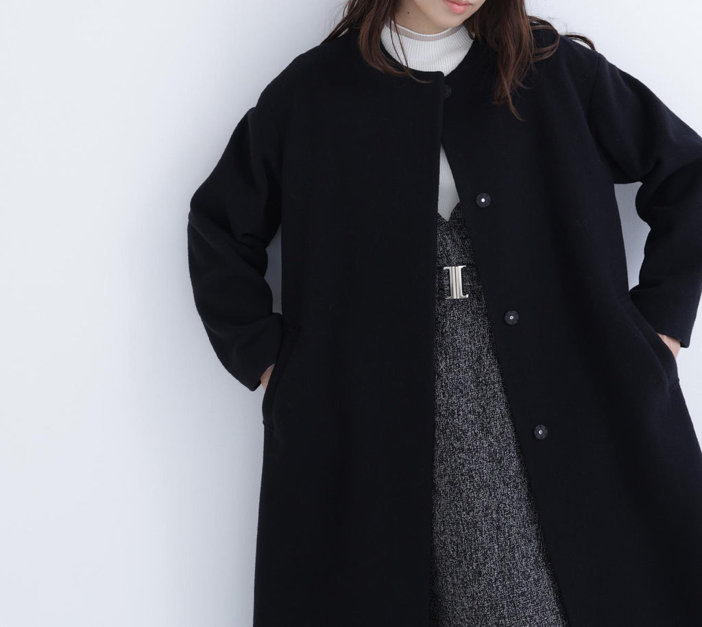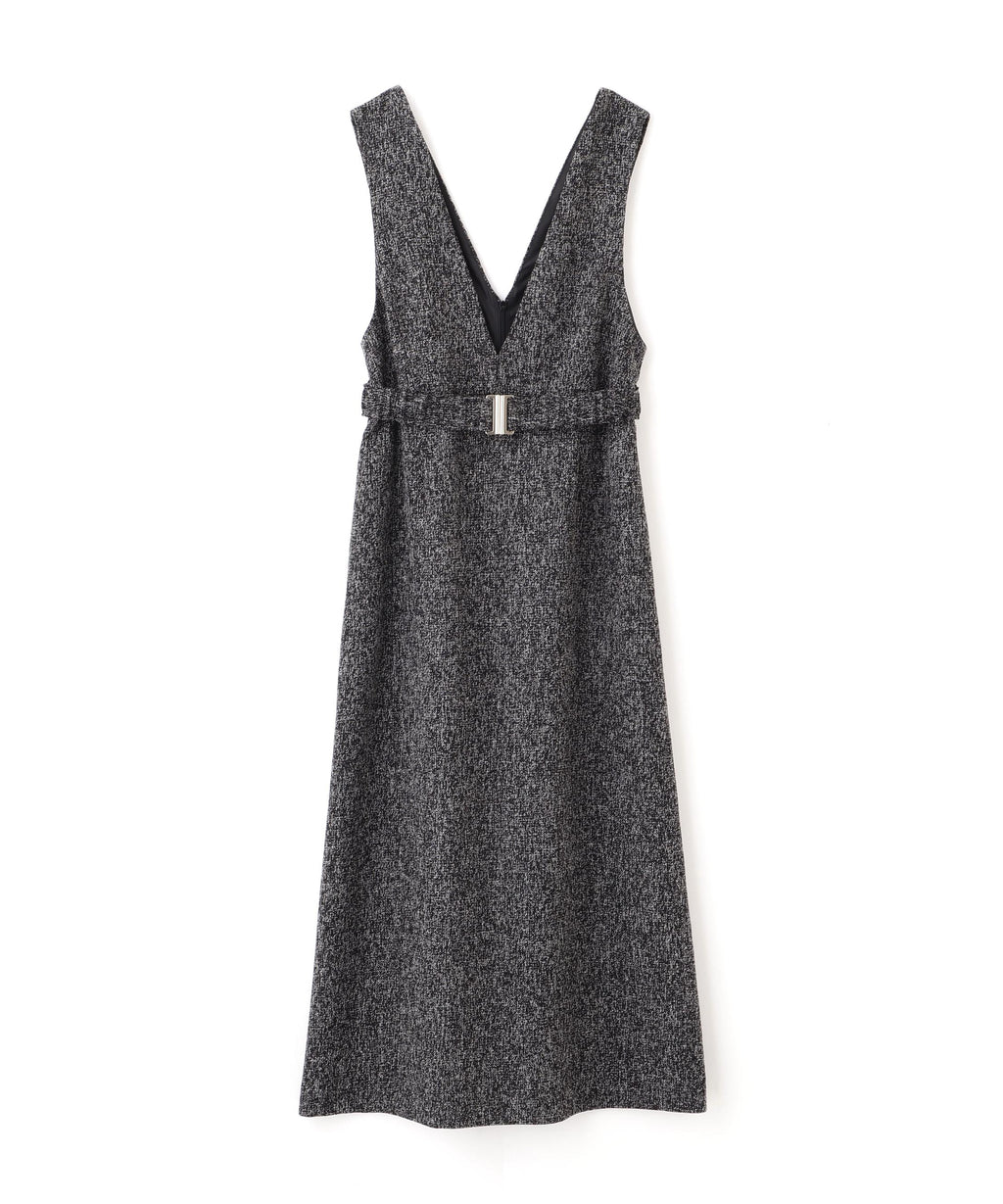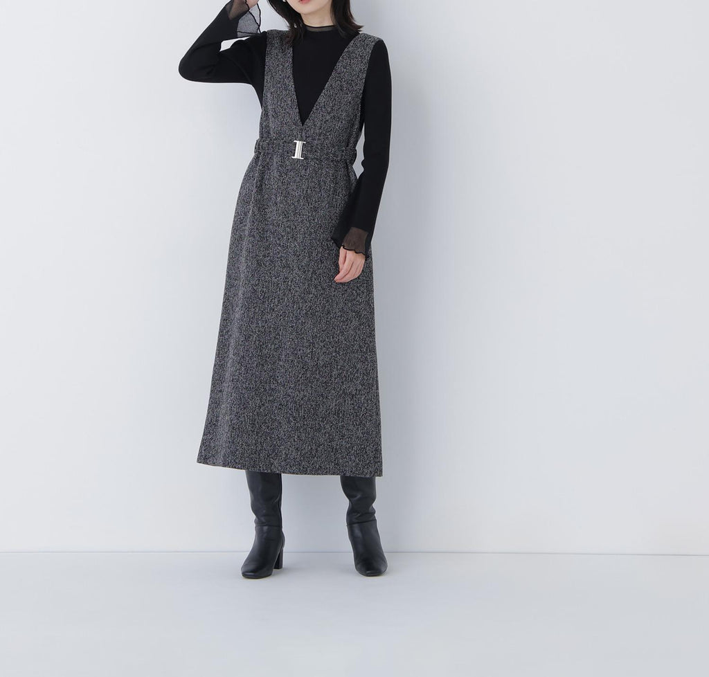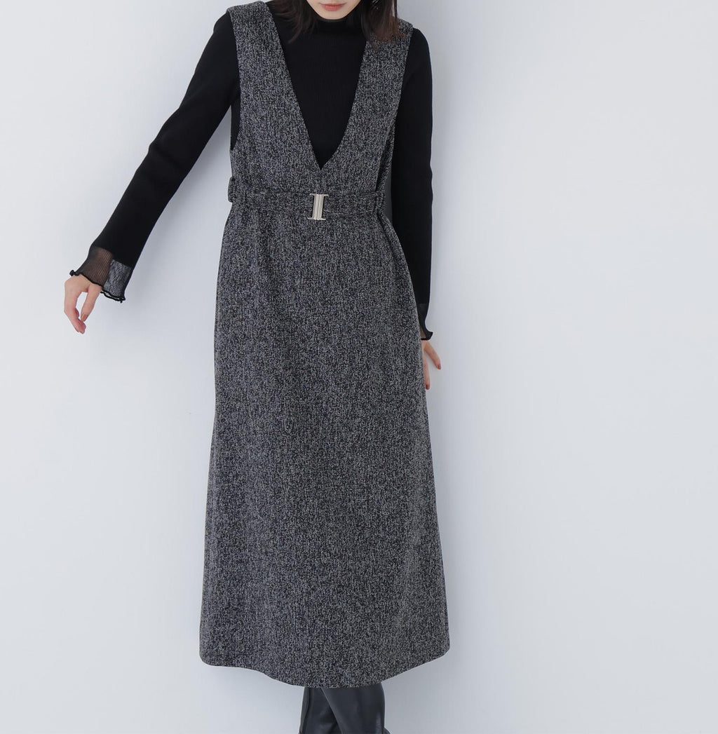 內搭容易層疊的簡潔V領,展現出大人的隨性感的連身裙。用同布料的橡膠腰帶標記腰圍,展現出美麗的輪廓。金屬扣環成為點綴,適度地增添時尚感。腰帶可拆卸,因此即使是窄版輪廓也可以穿著。優雅的呢料素材提升了秋冬風格的品味。