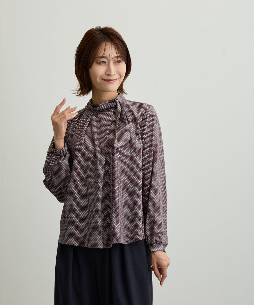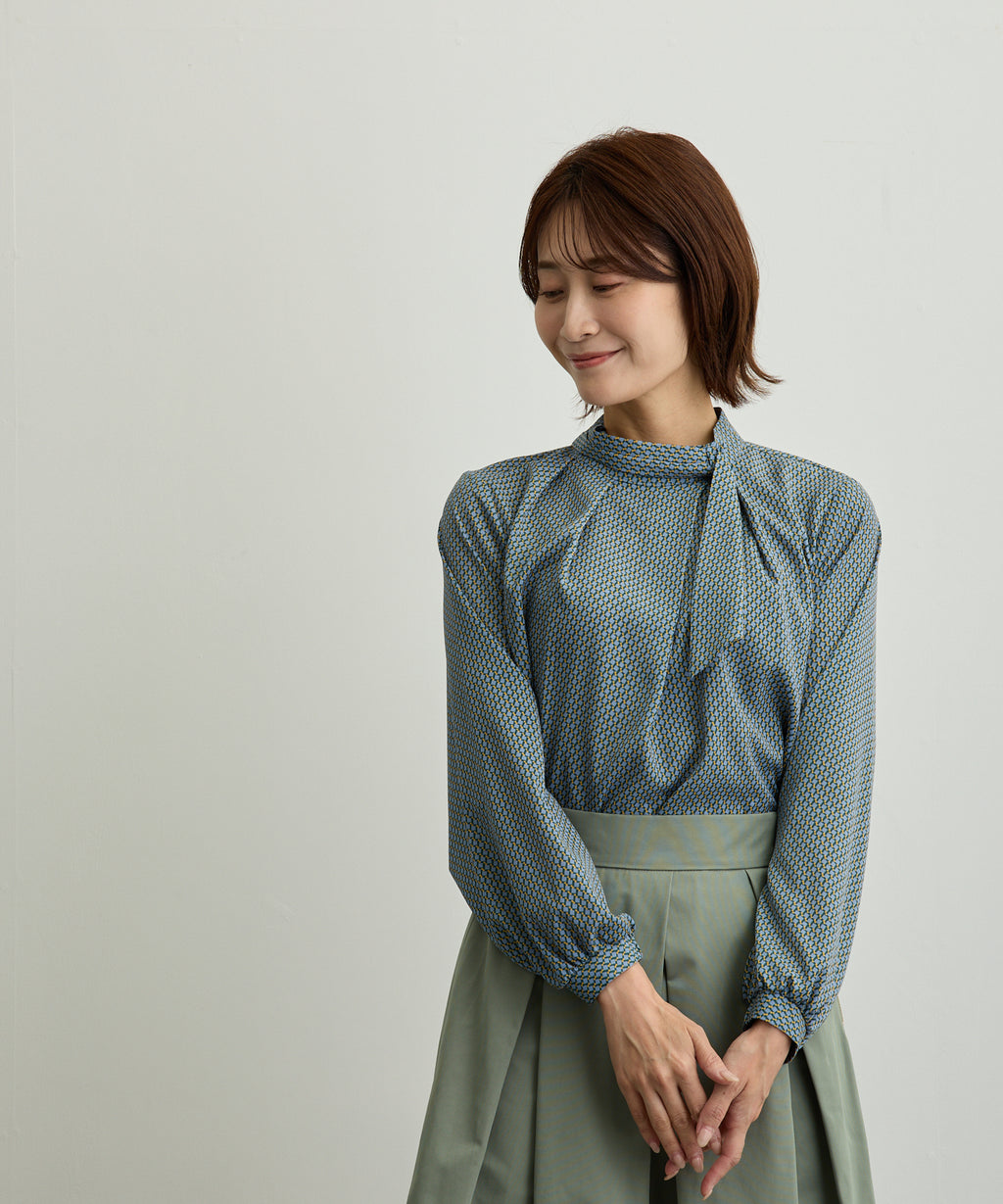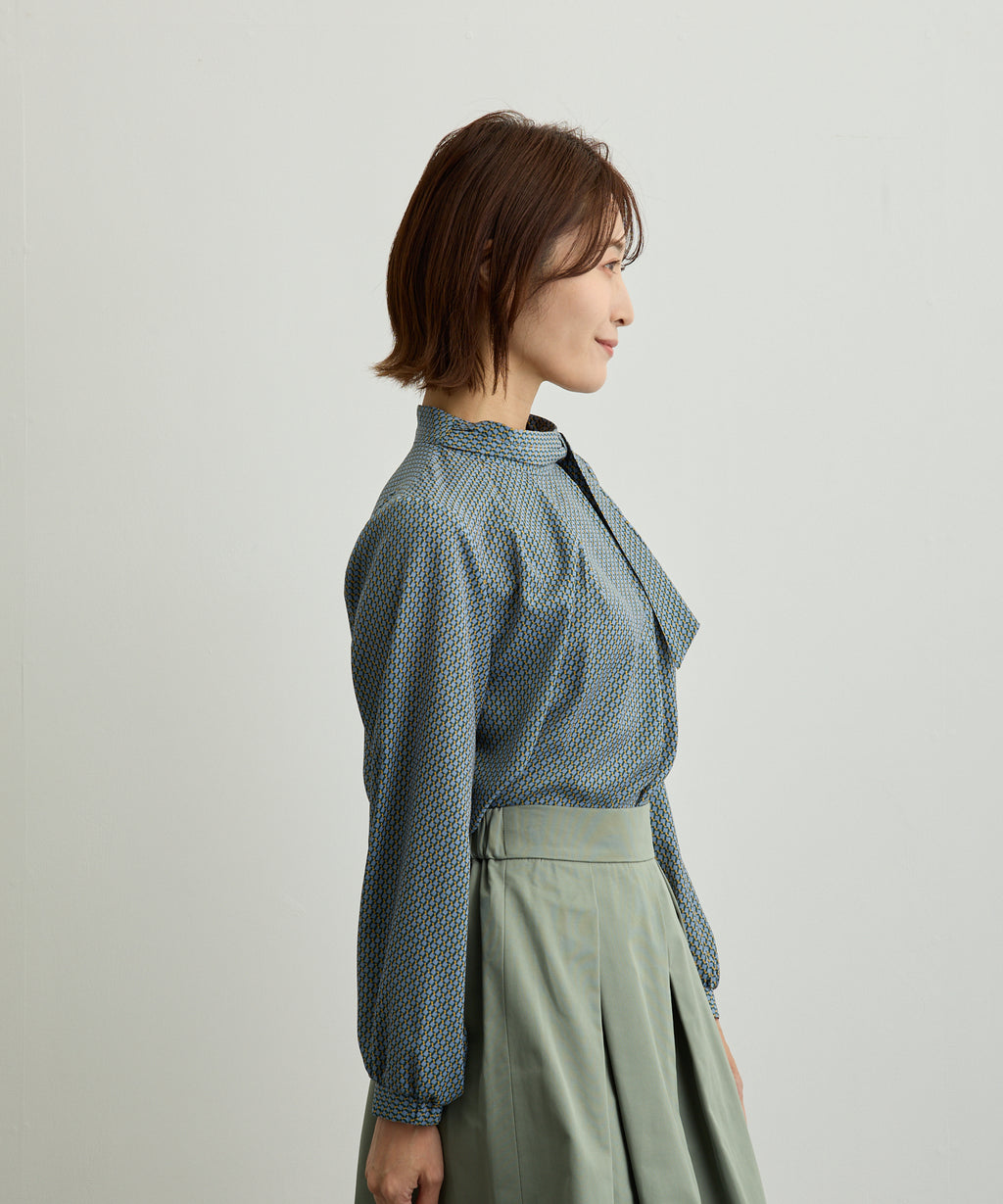 在右襯領邊夾入絲帶,並穿過左前襯領的環,設計成圍巾風格的襯衫。