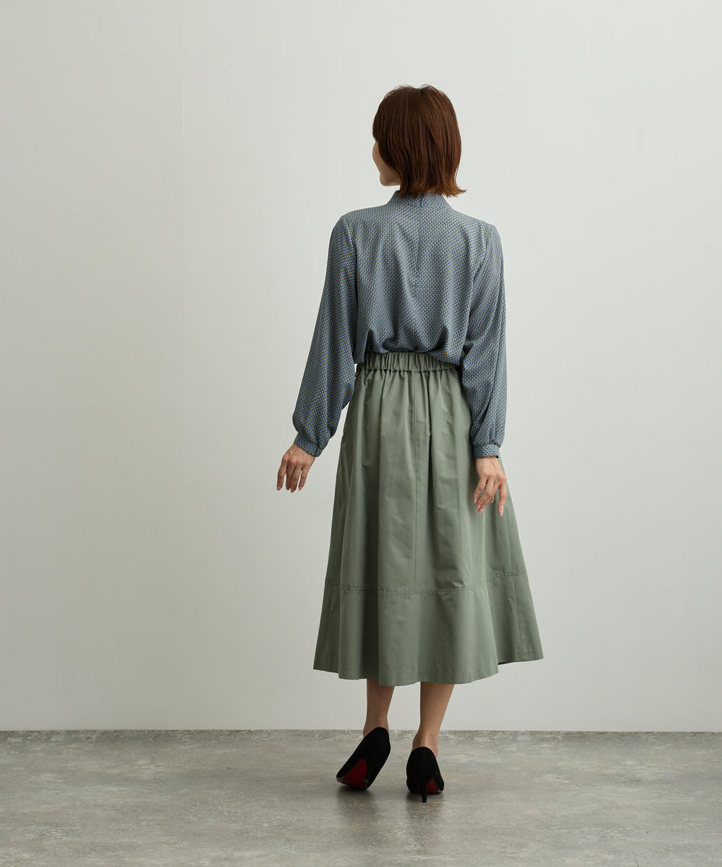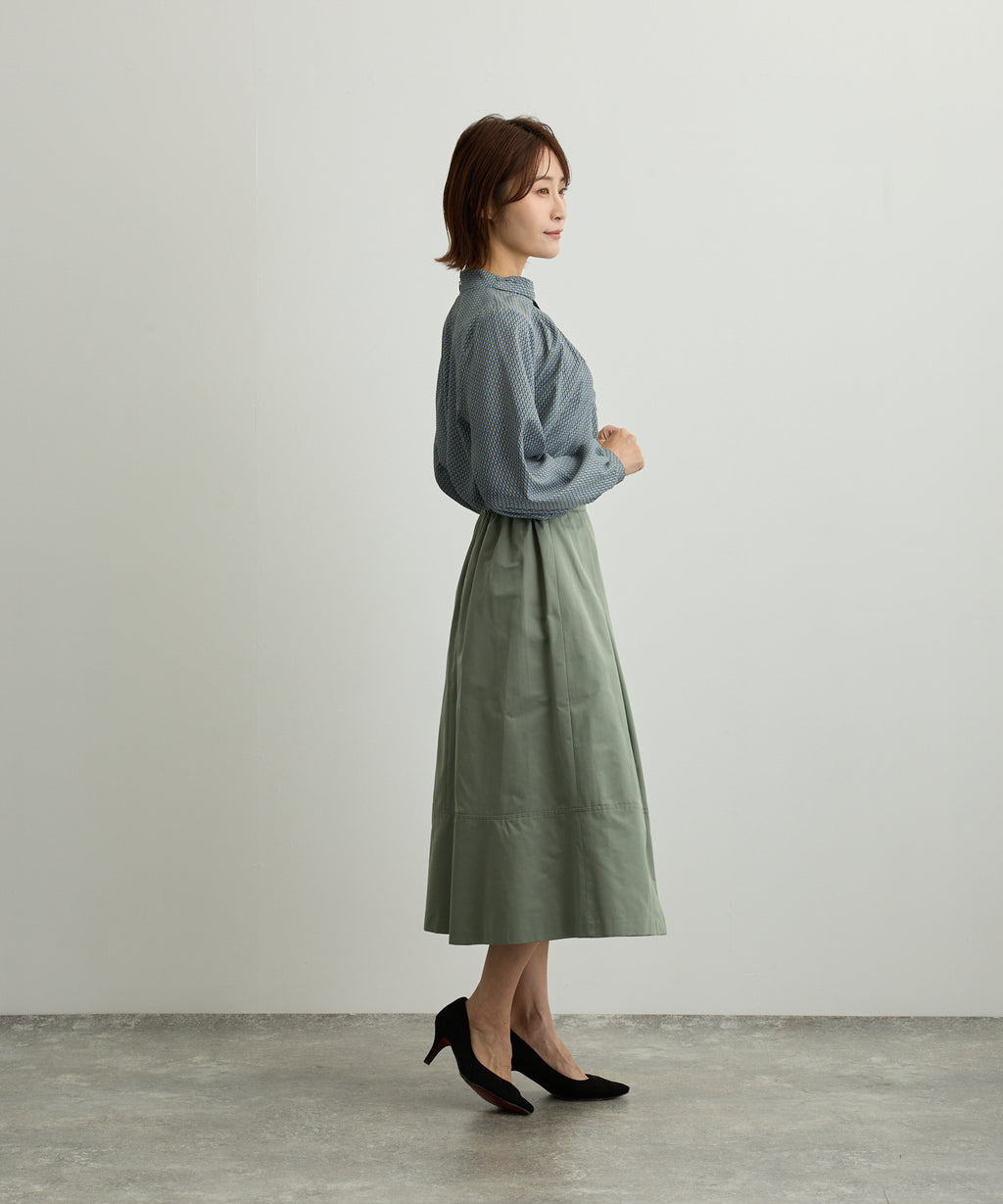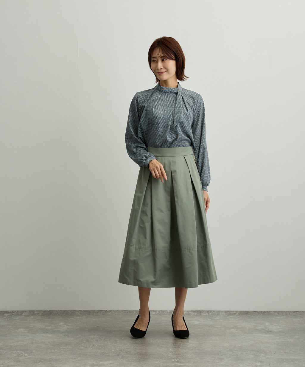 在右襯領邊夾入絲帶,並穿過左前襯領的環,設計成圍巾風格的襯衫。