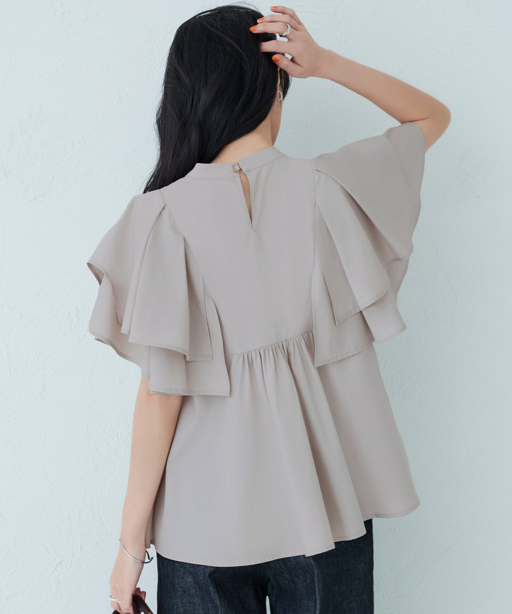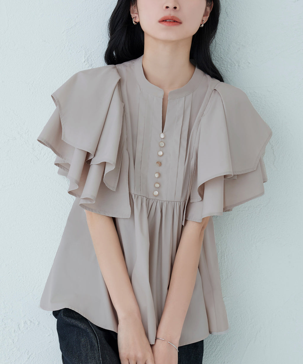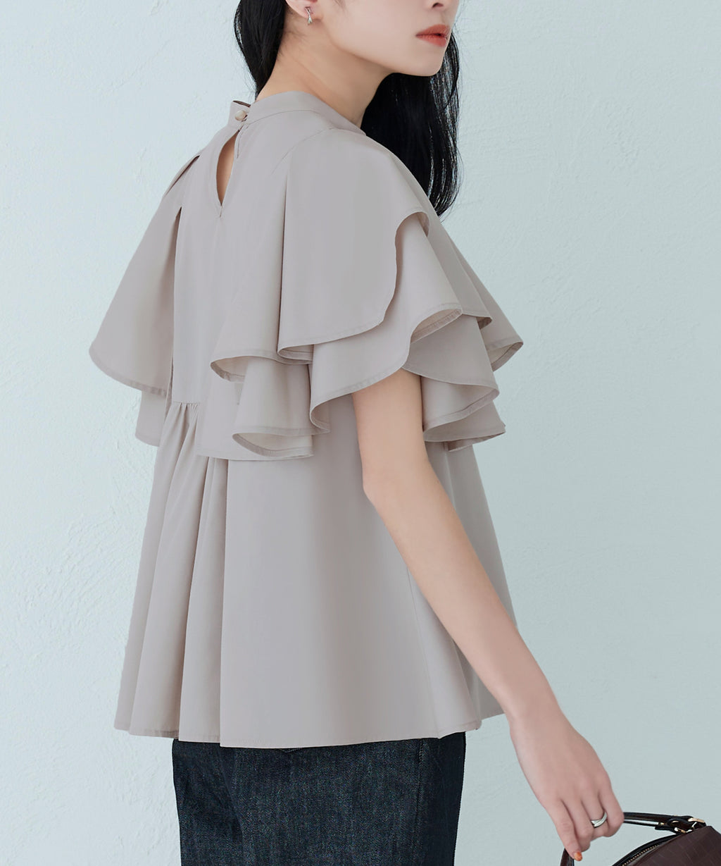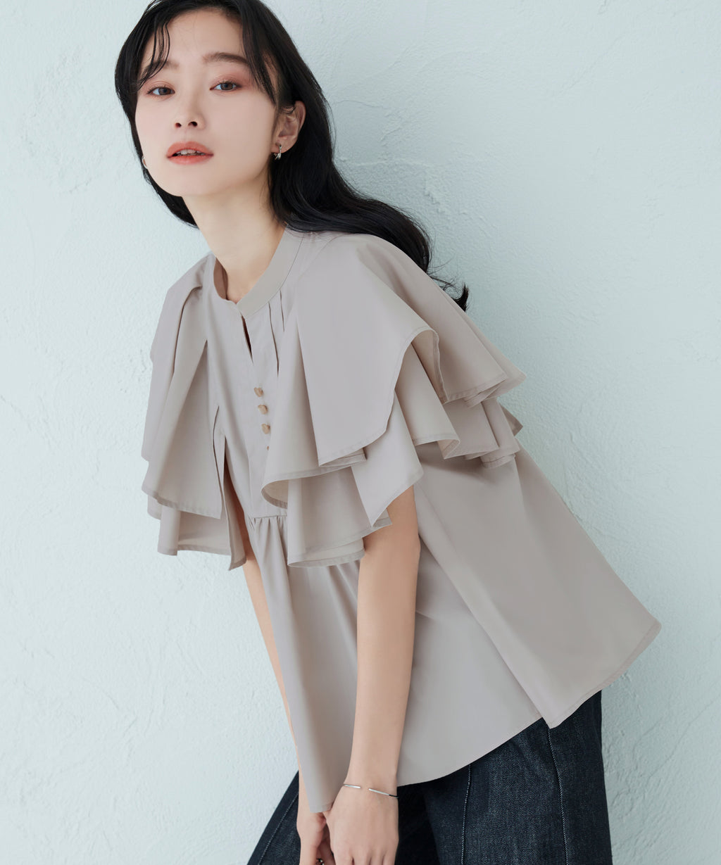 蓬鬆展開的層次披肩的寬鬆袖子,展現女性特有的輕盈感。