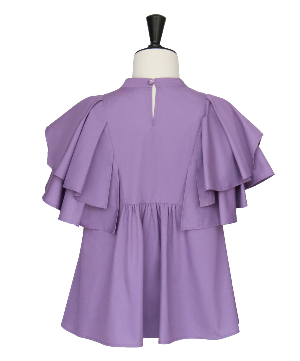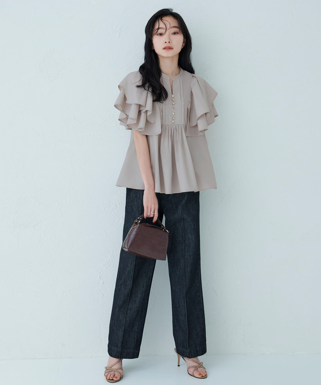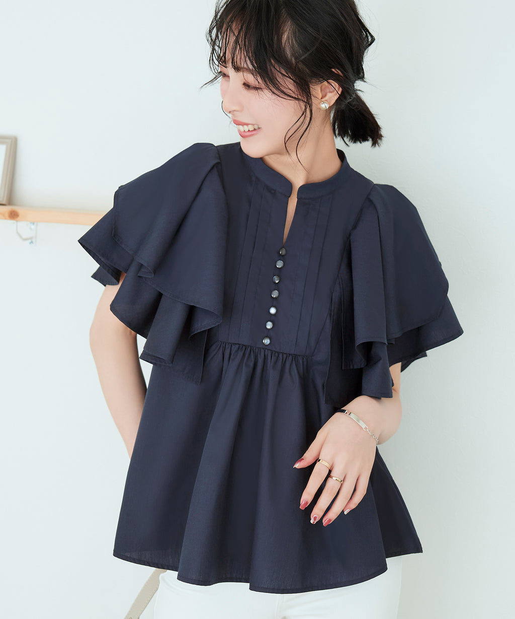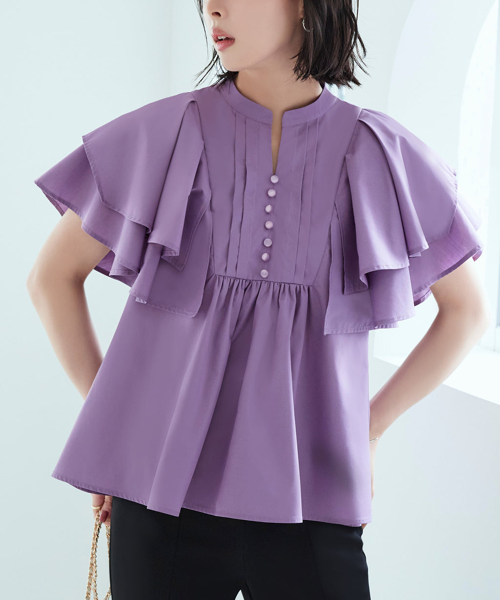 蓬鬆展開的層次披肩的寬鬆袖子,展現女性特有的輕盈感。