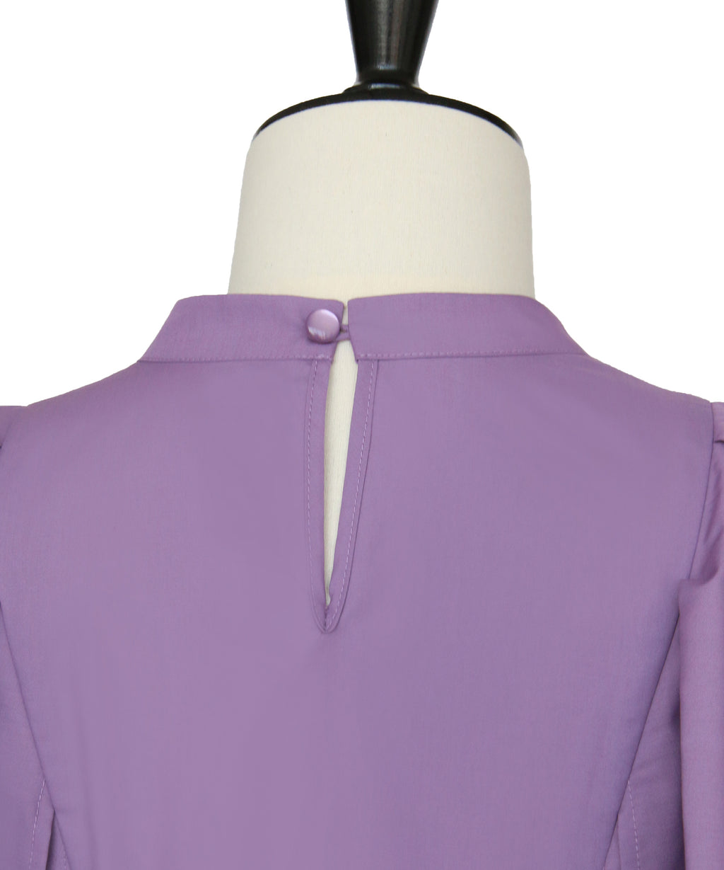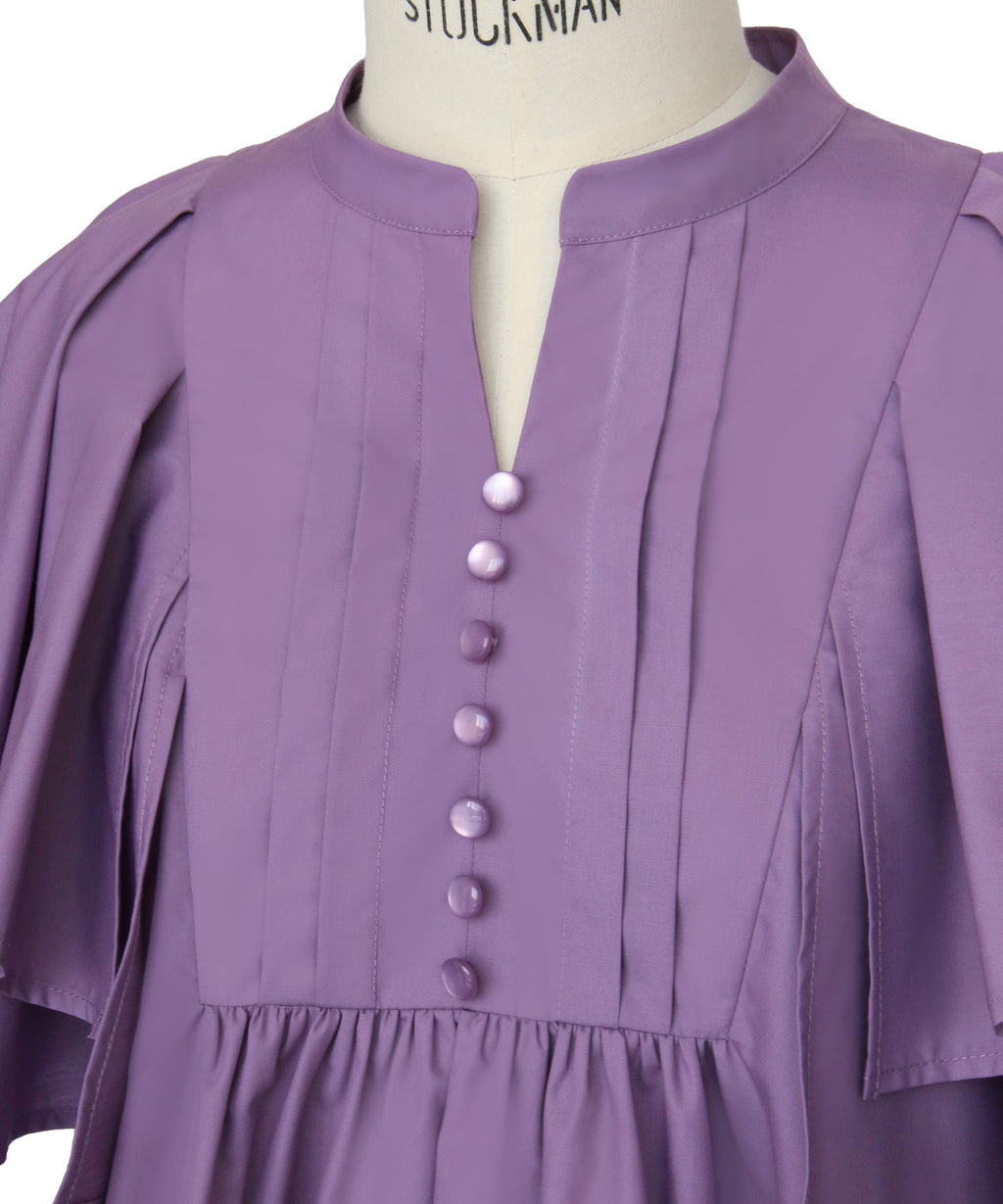 立領設計,斜切換和褶皺增添端莊印象。