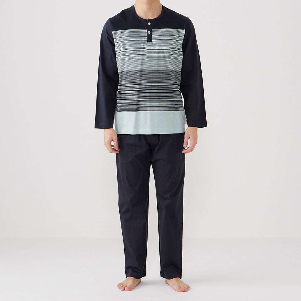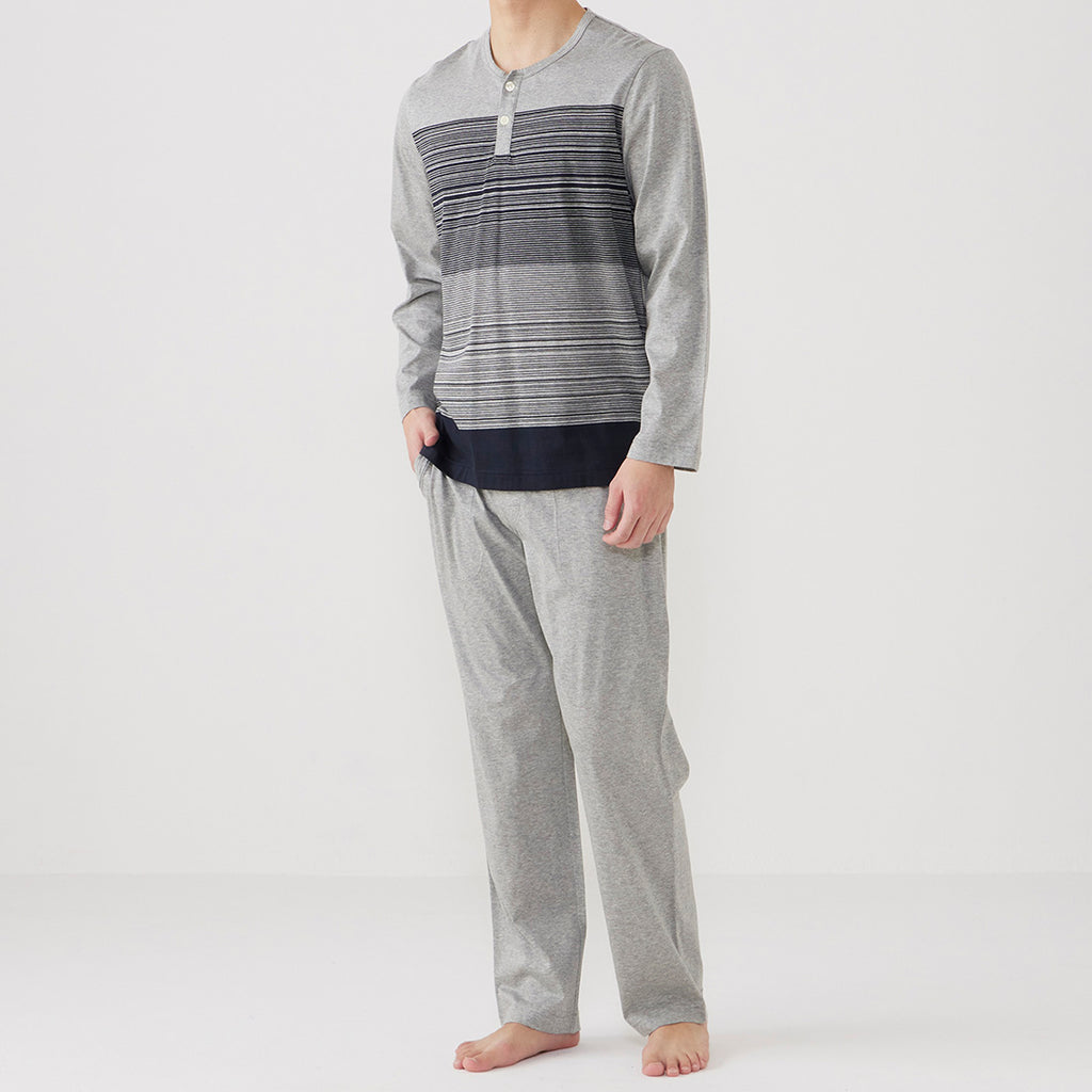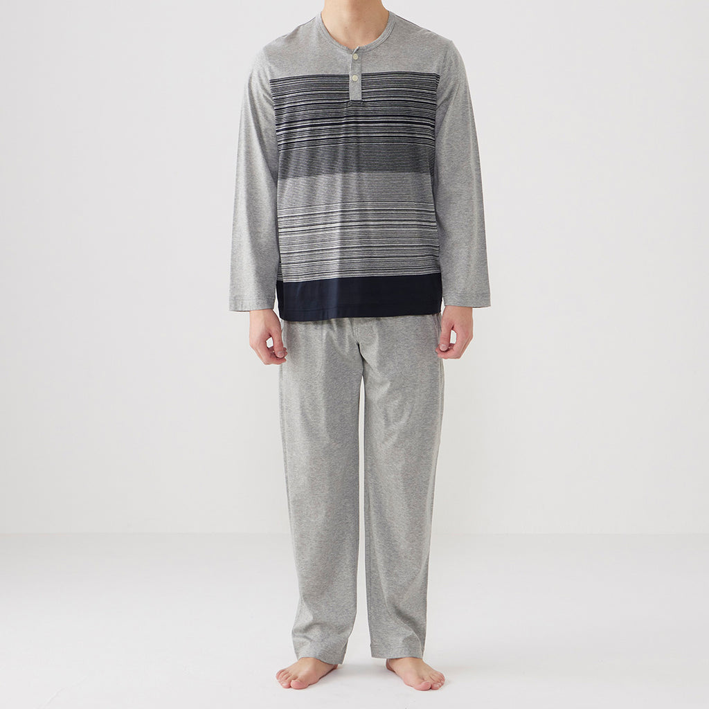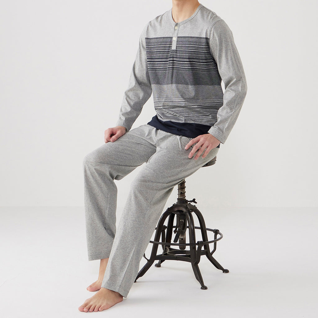 無地的褲子搭配天竺面板條紋針織睡衣。