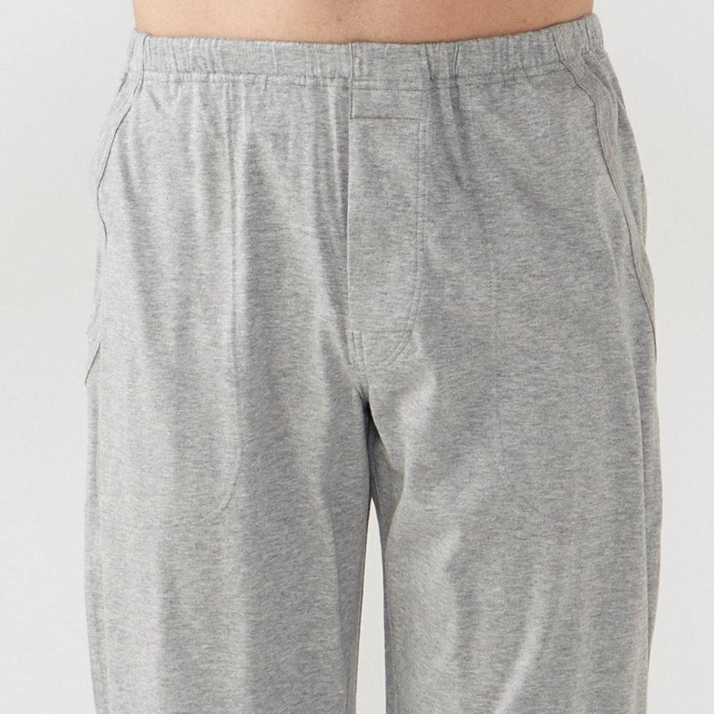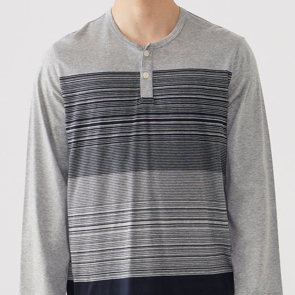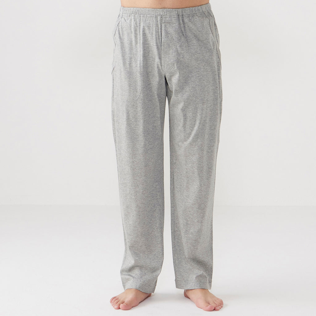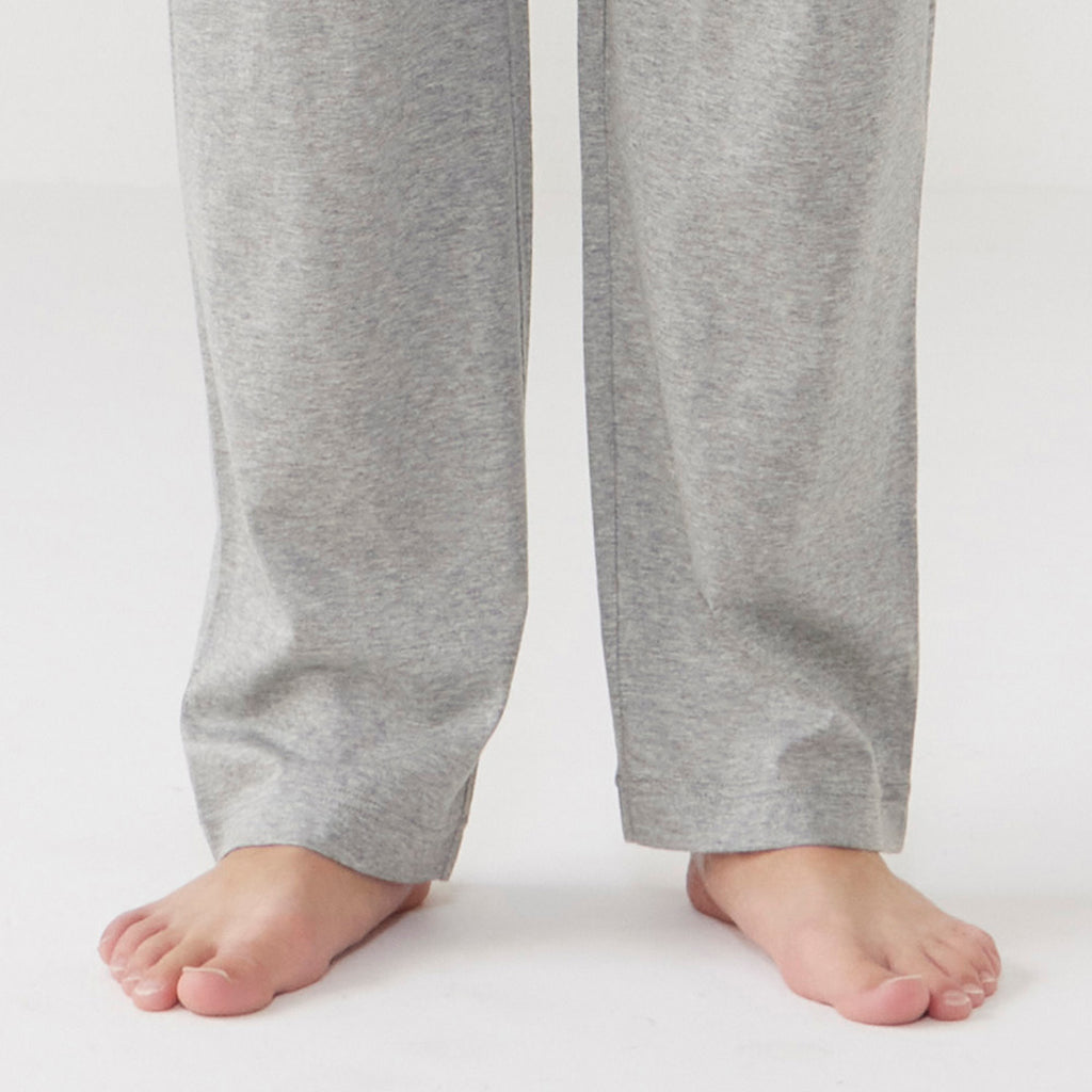 無地的褲子搭配天竺面板條紋針織睡衣。