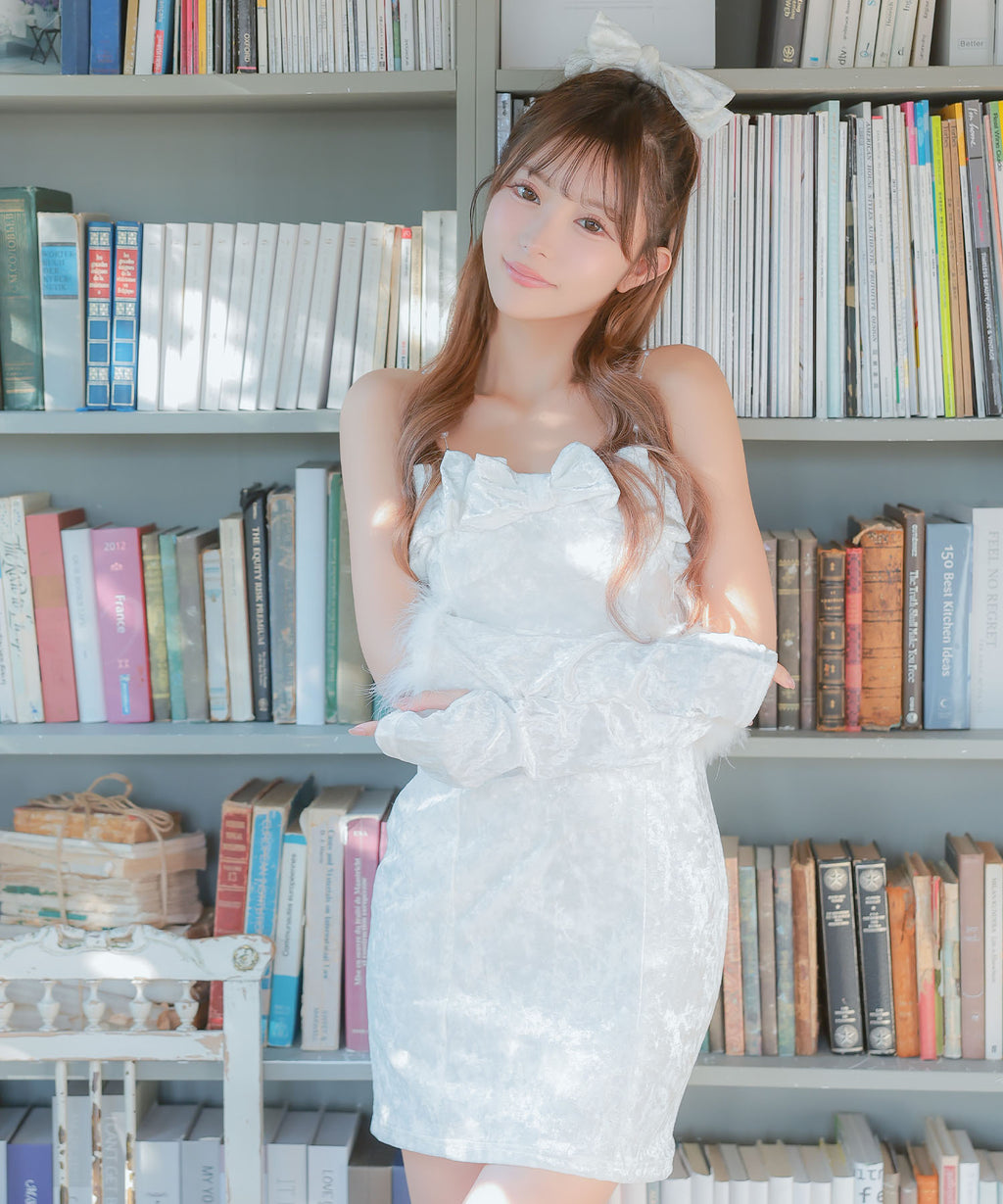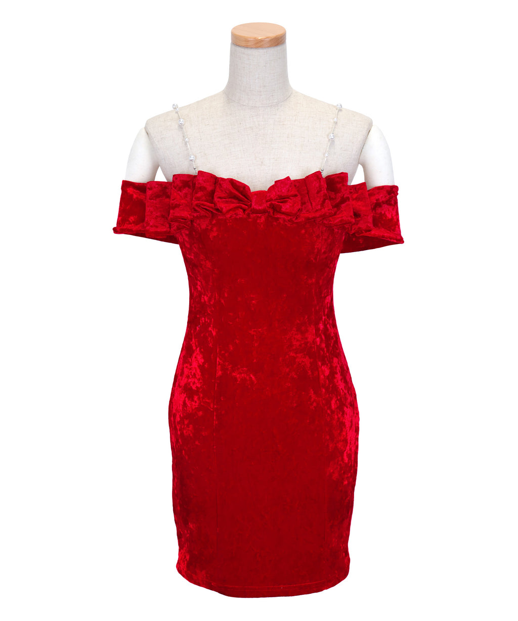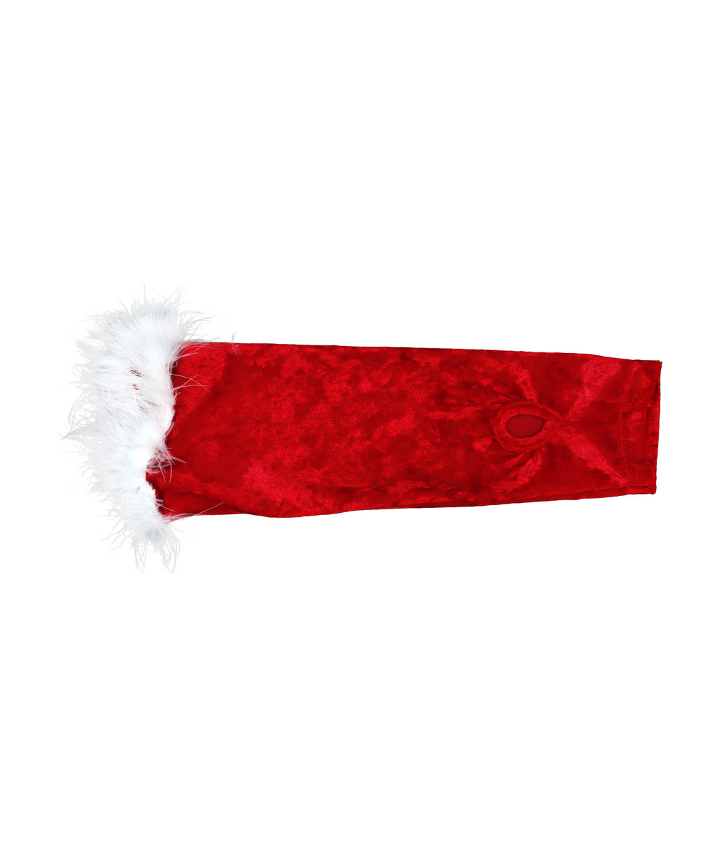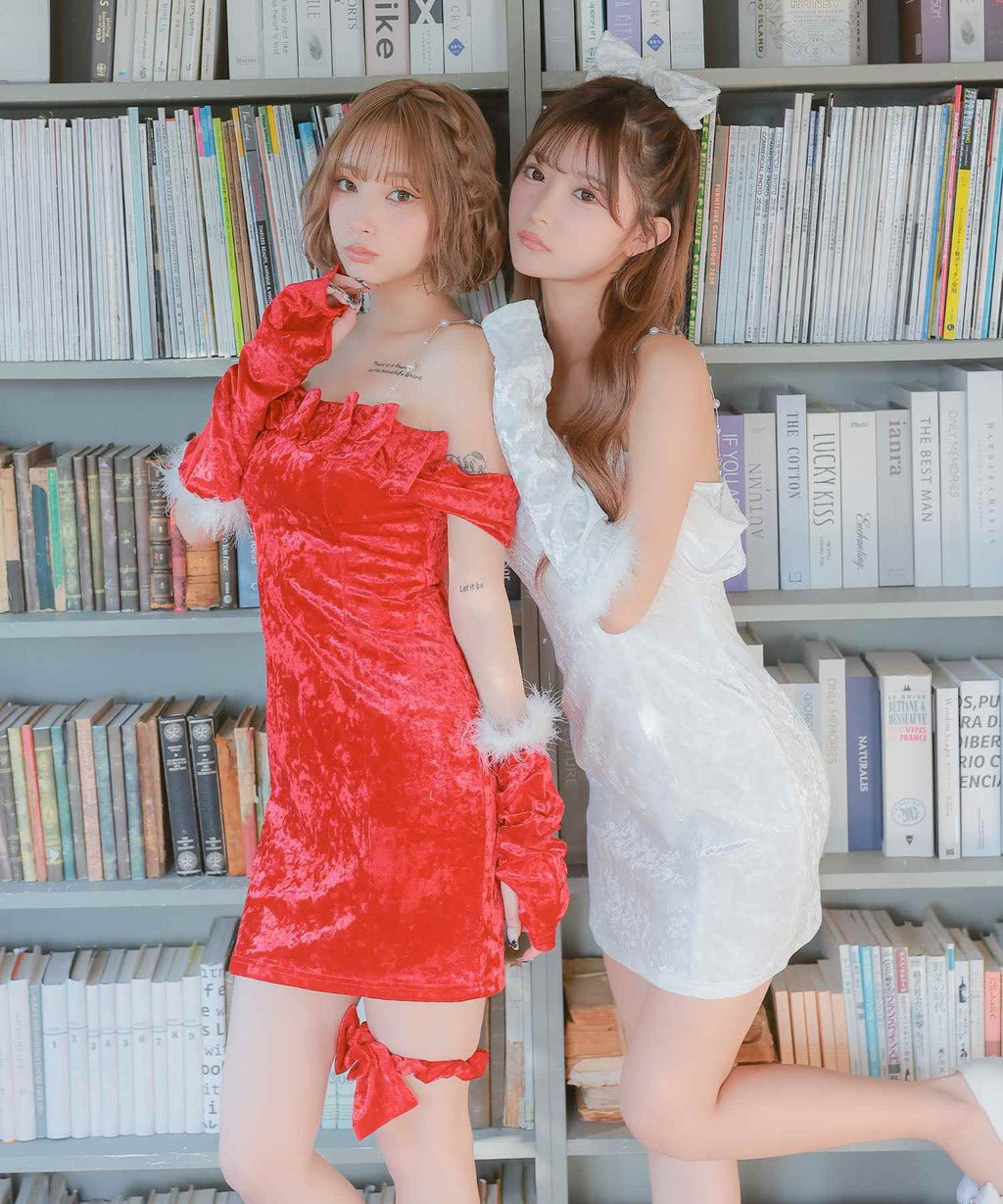 蒂卡 Tika 聖誕服 4件套 珍珠吊帶裝飾領結露肩褶皺緊身天鵝絨聖誕角色扮演裙 [肩帶+連衣裙+髮圈領結+ ]