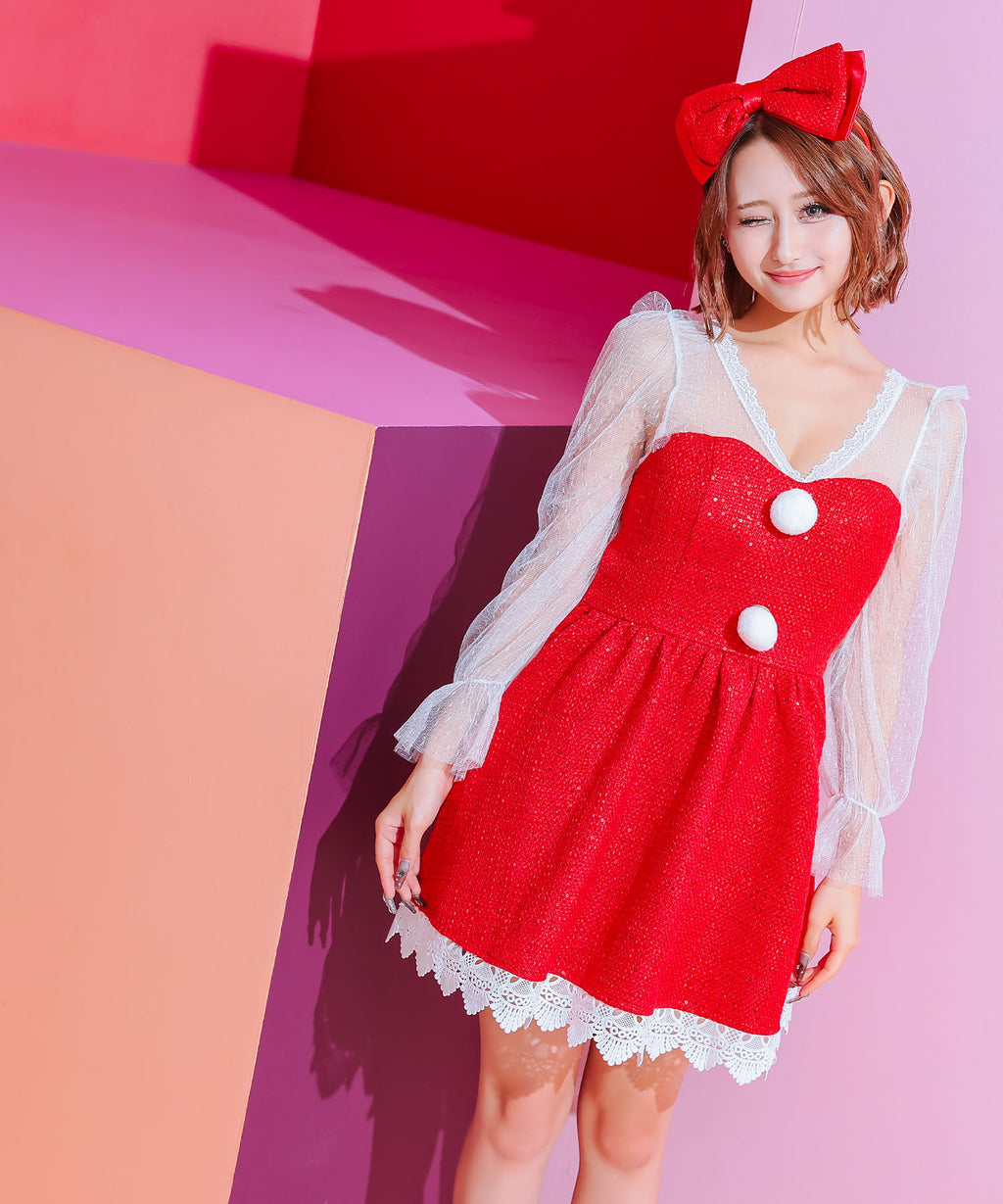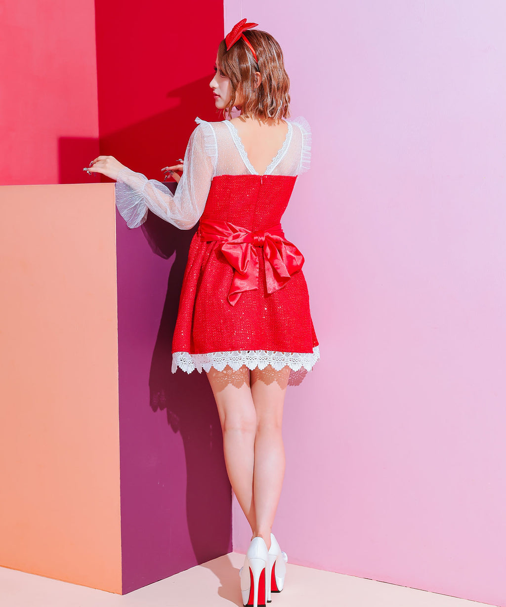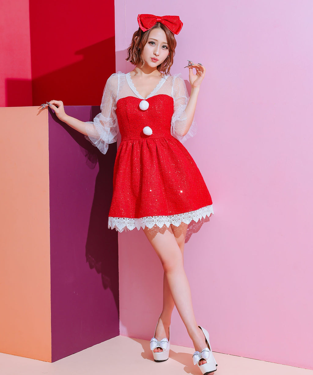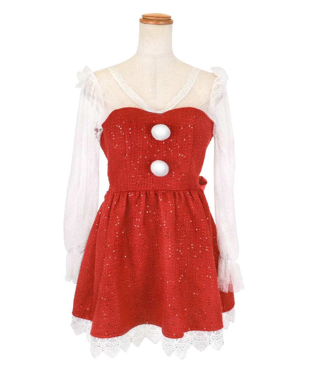 蒂卡 Tika 聖誕服 2件套 袖子透明蕾絲泡袖呢料亮片喇叭裙 甜美經典聖誕雙胞胎角色扮演