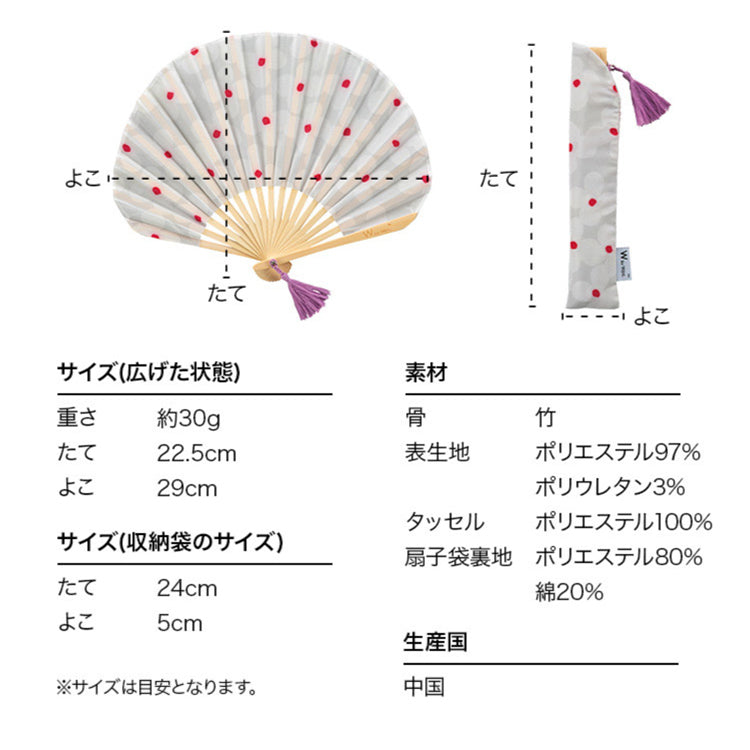 骨:竹/表生地:聚酯纖維97% 聚氨酯3%/流蘇:聚酯纖維100%/扇子袋內裡:聚酯纖維80% 棉20%
