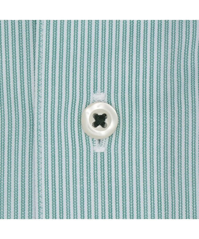 在商業場合中,簡約的設計搭配綠色的鈕扣線,展現出鮮明的領口效果。