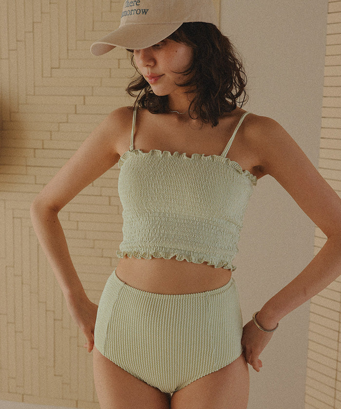 ・以提花肋紋波浪圖案為特色的聚攏帶式胸罩×高腰比基尼。