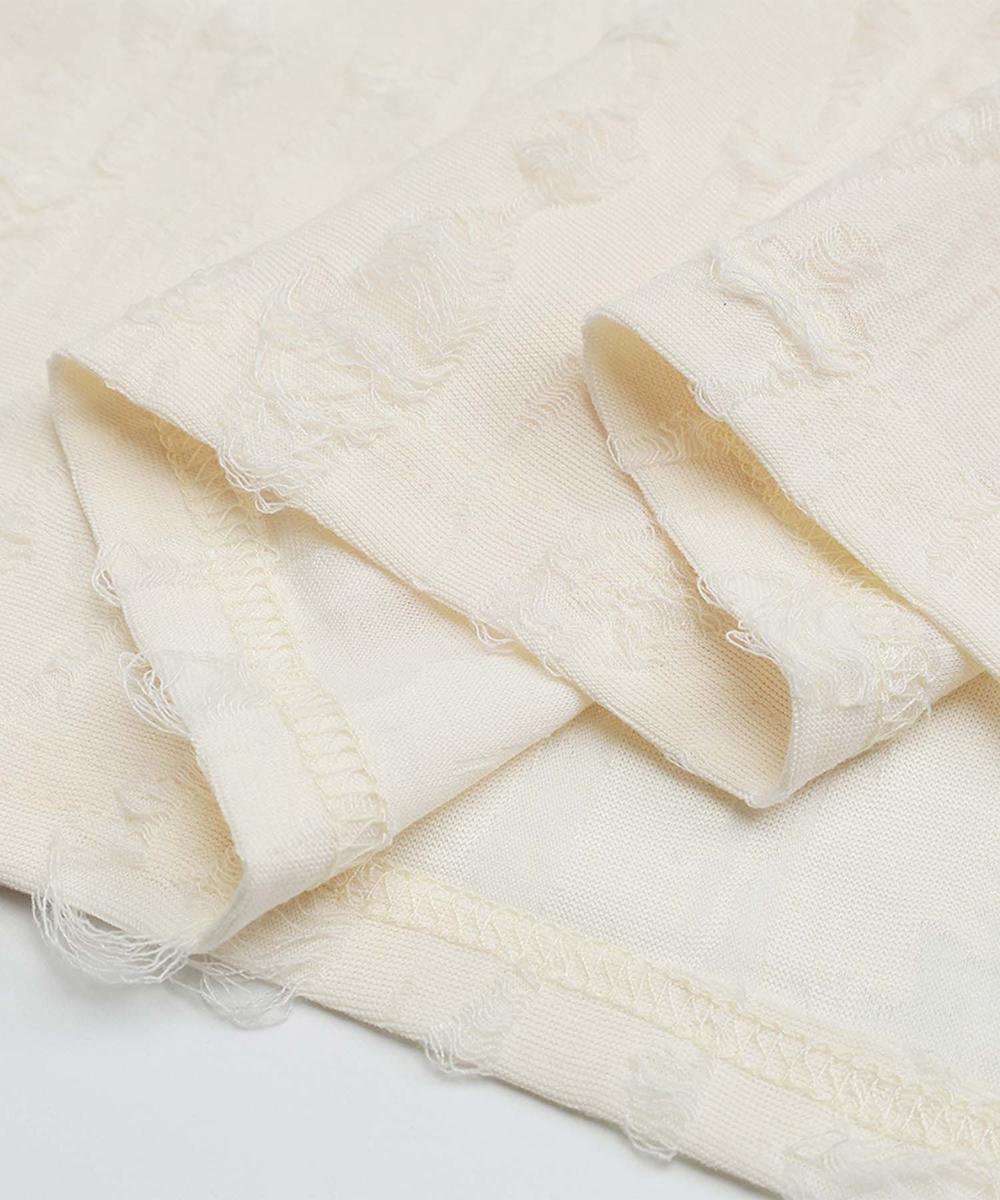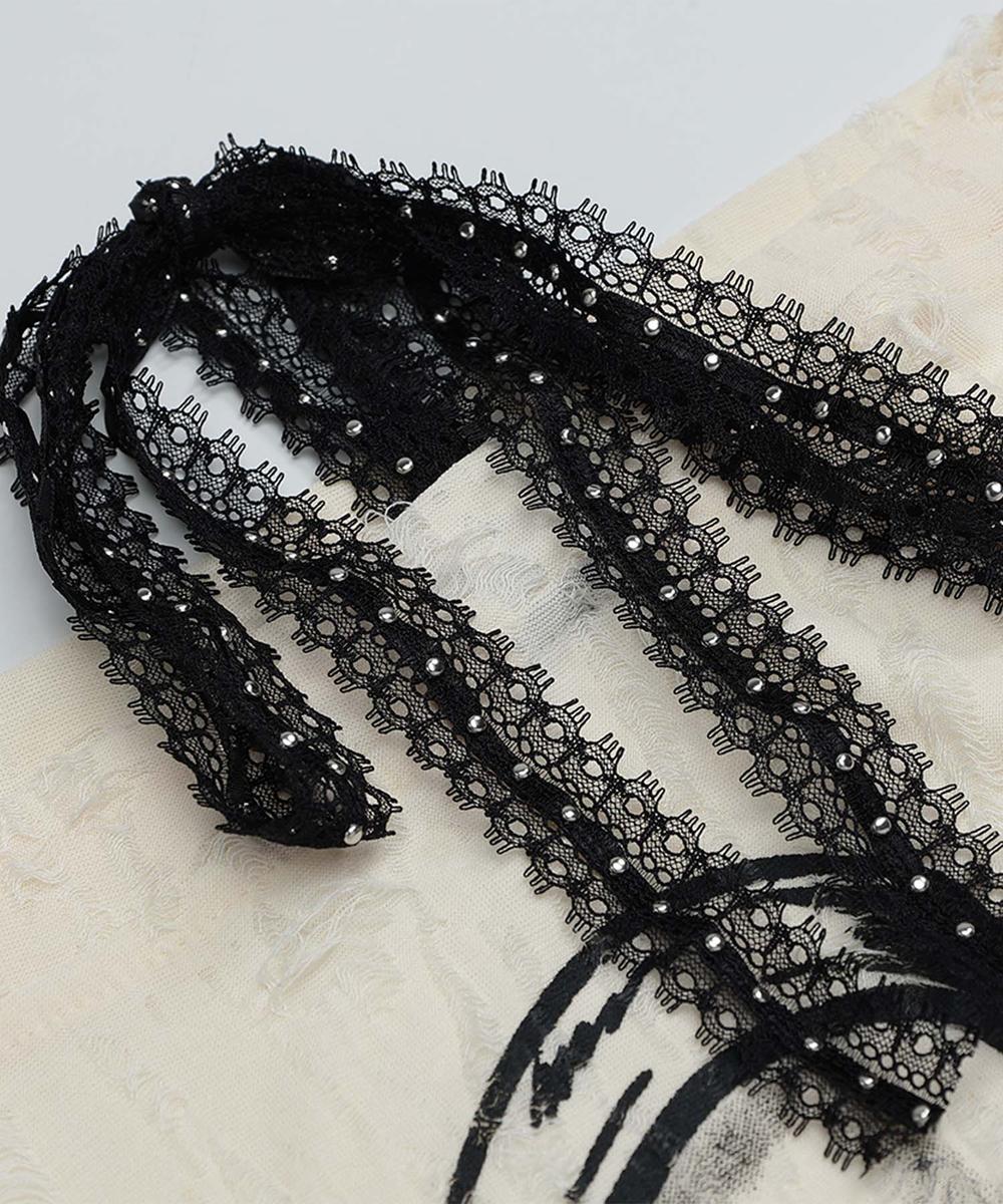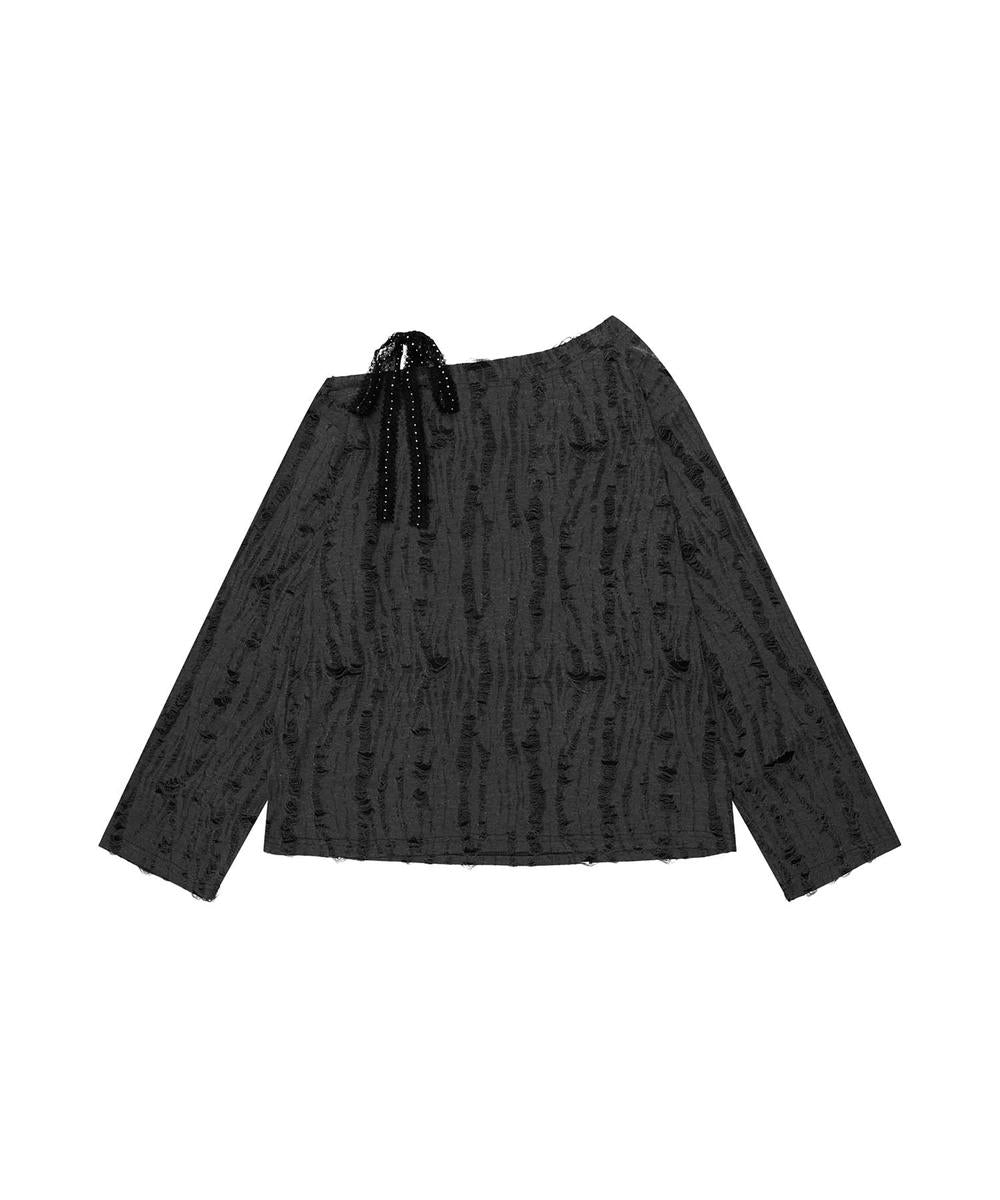 肩部的開放細節,加上全身施加的損壞加工,營造出適度的輕鬆感。肩部的緞帶裝飾更增添了女性化的點綴。