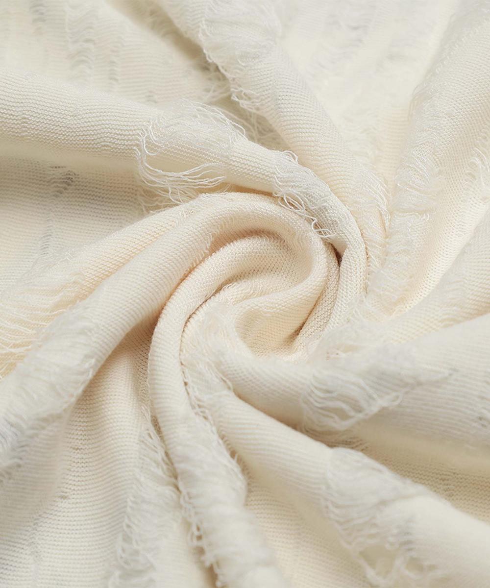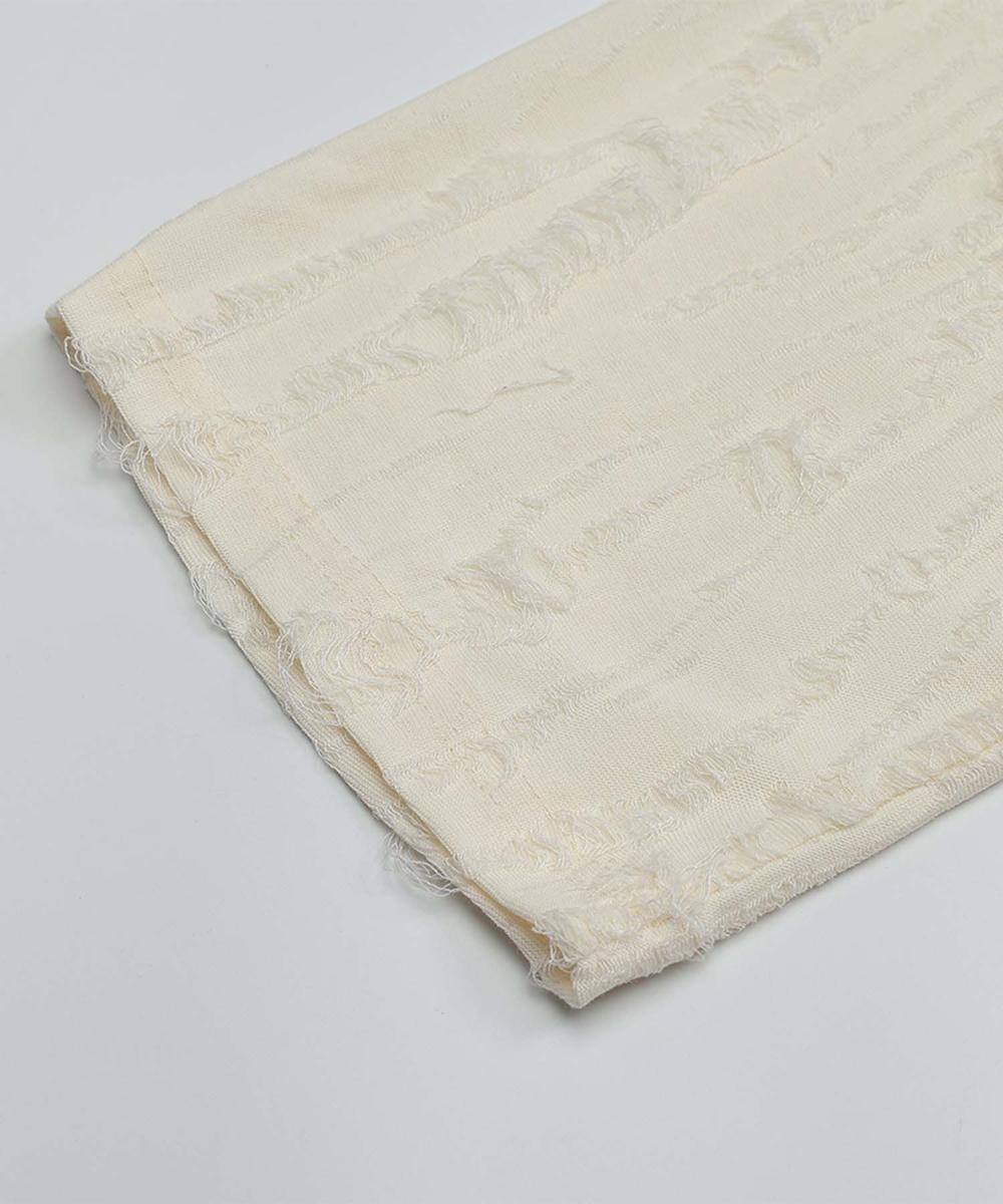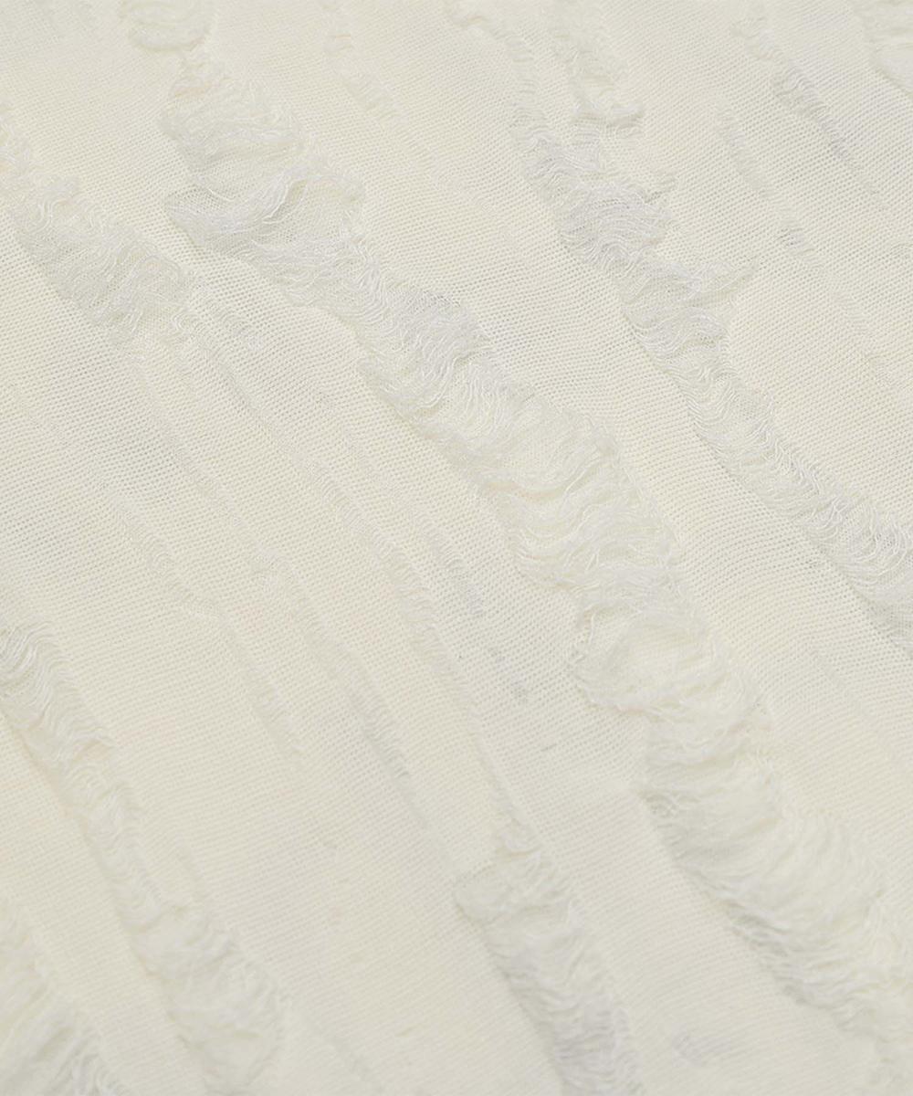 肩部的開放細節,加上全身施加的損壞加工,營造出適度的輕鬆感。肩部的緞帶裝飾更增添了女性化的點綴。