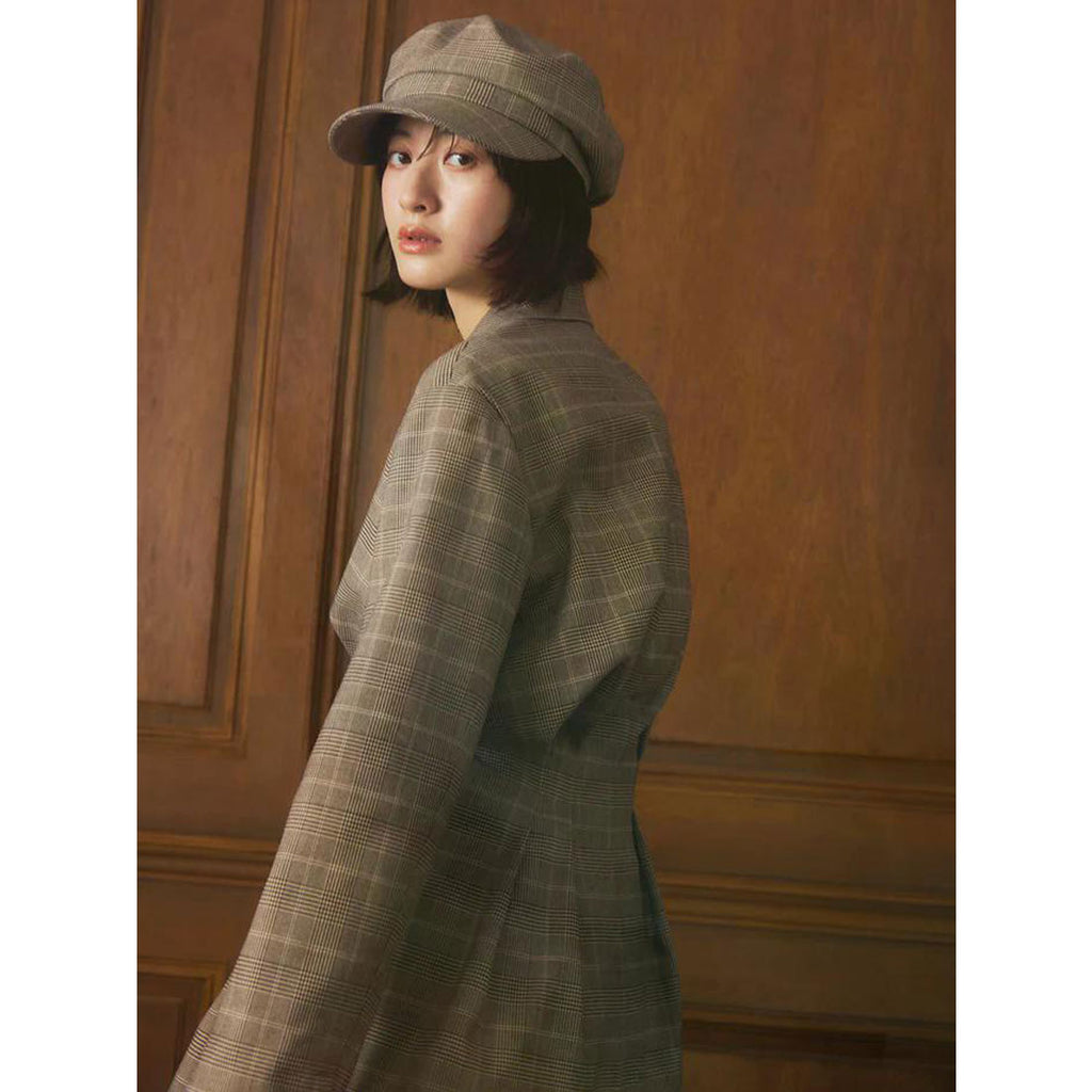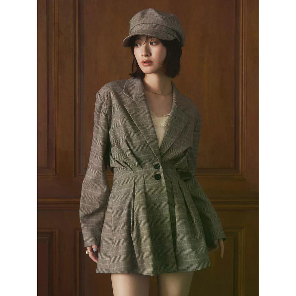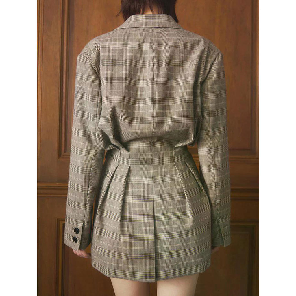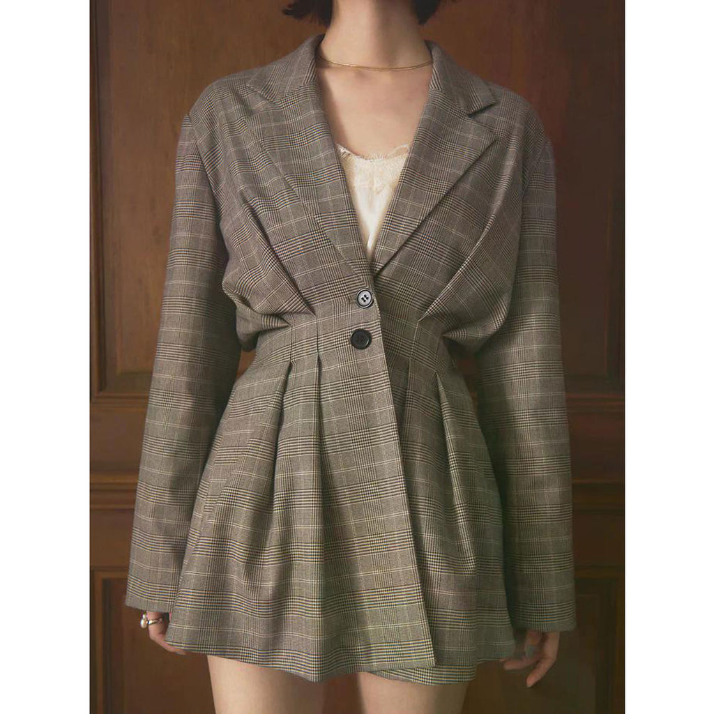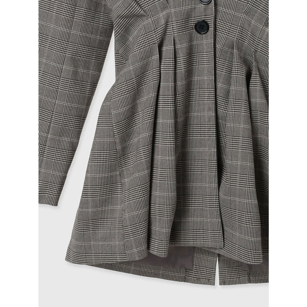 クラシカルな格紋格子に、腰圍を絞った立体的なシルエットが女性らしさを引き立てる一着。フロントにはダーツとタックを施し、ジャケットながらも美しいペプラムラインを表現。マニッシュさとフェミニンさを絶妙に融合させたデザインです。