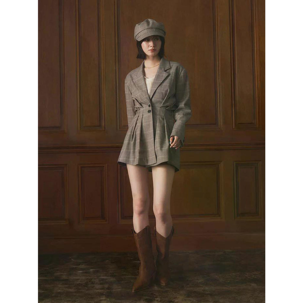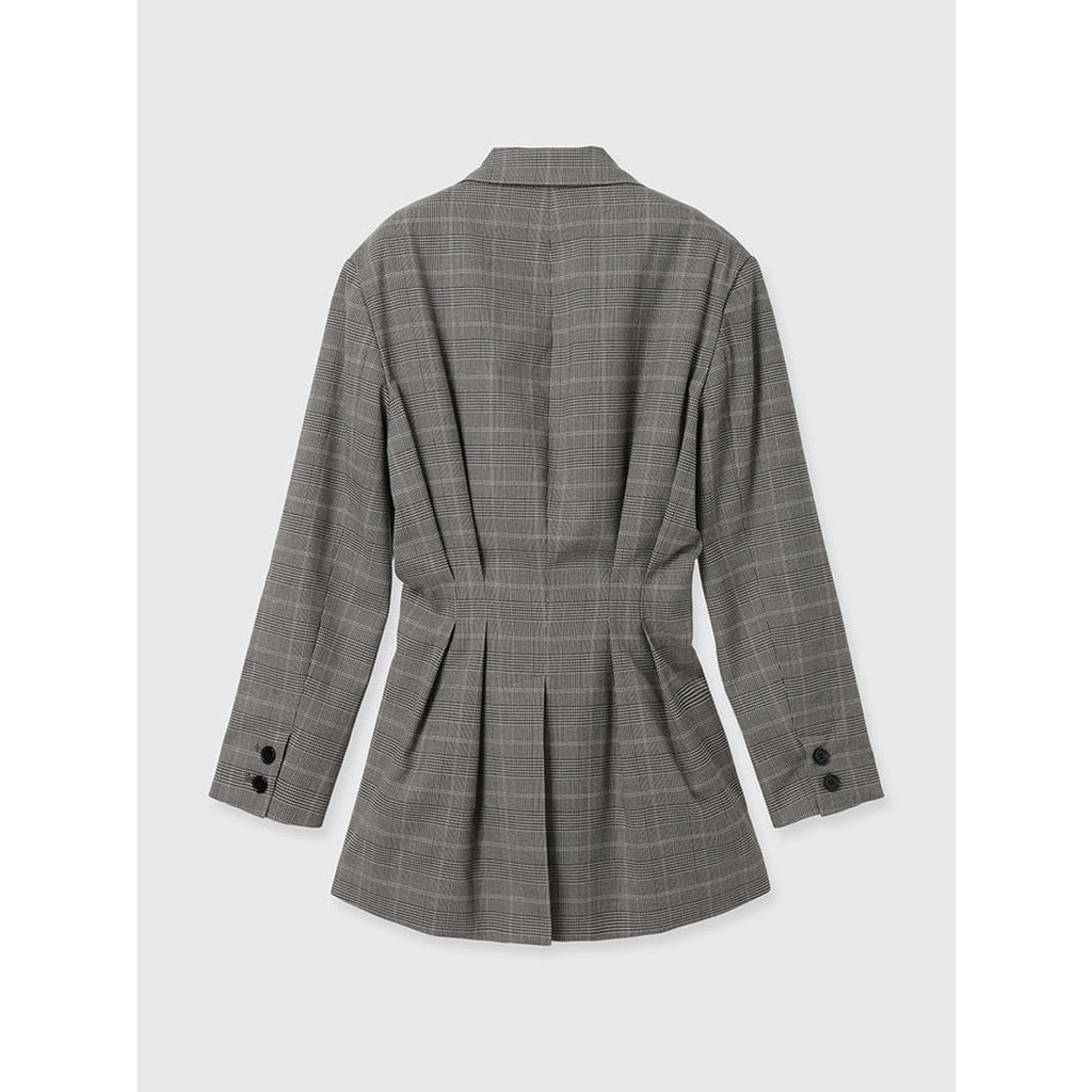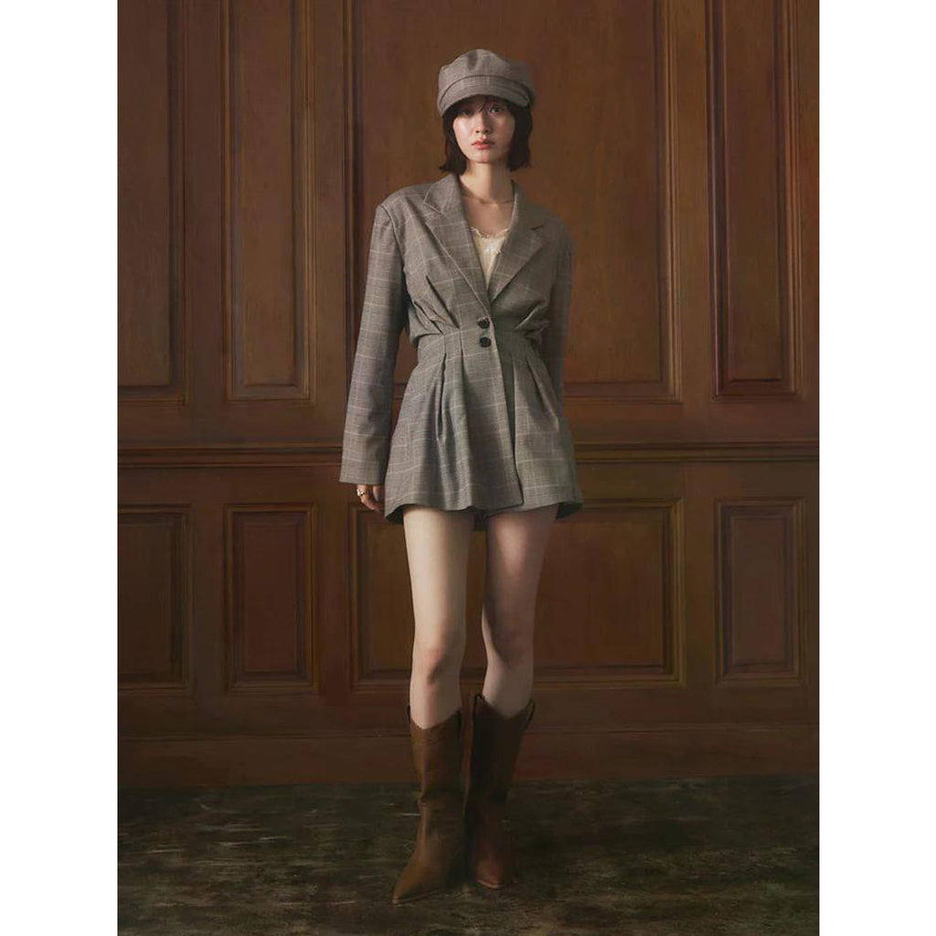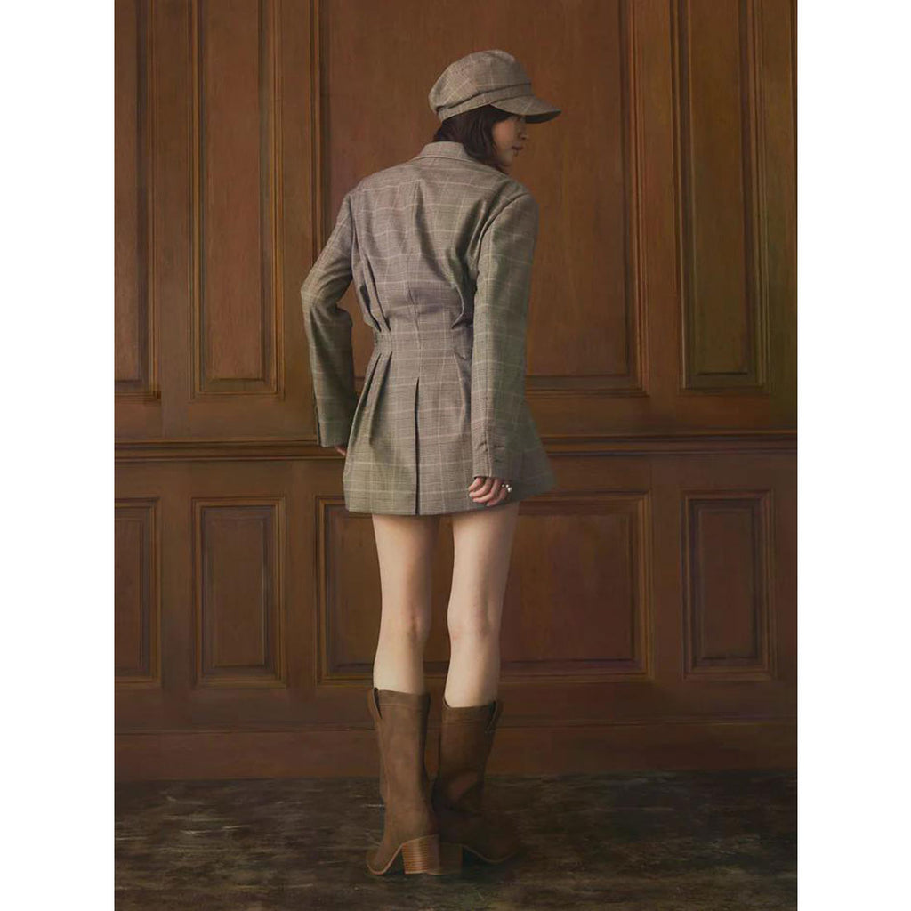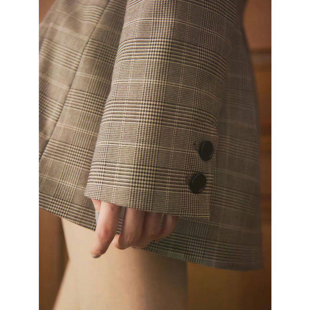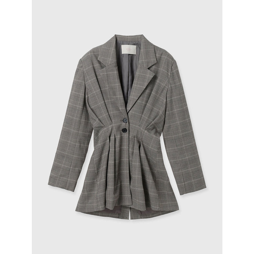 クラシカルな格紋格子に、腰圍を絞った立体的なシルエットが女性らしさを引き立てる一着。フロントにはダーツとタックを施し、ジャケットながらも美しいペプラムラインを表現。マニッシュさとフェミニンさを絶妙に融合させたデザインです。