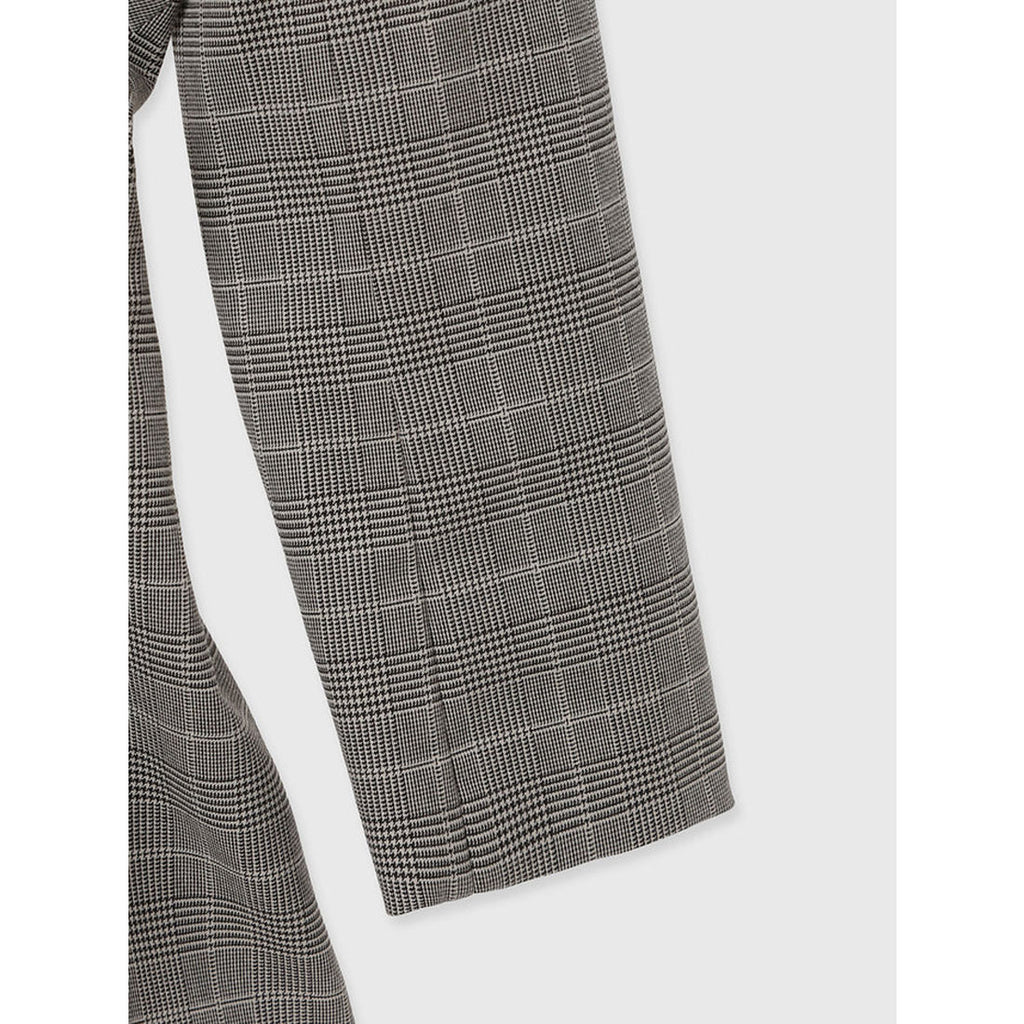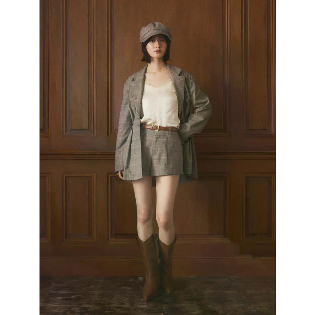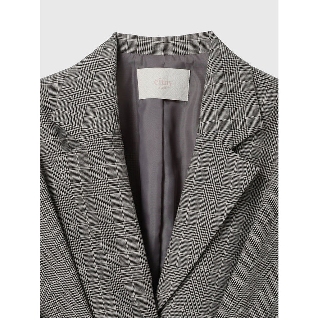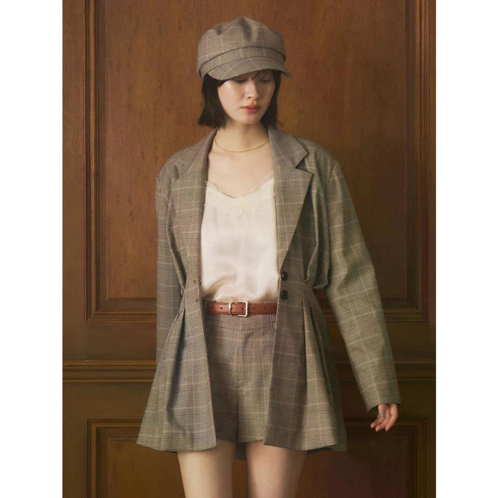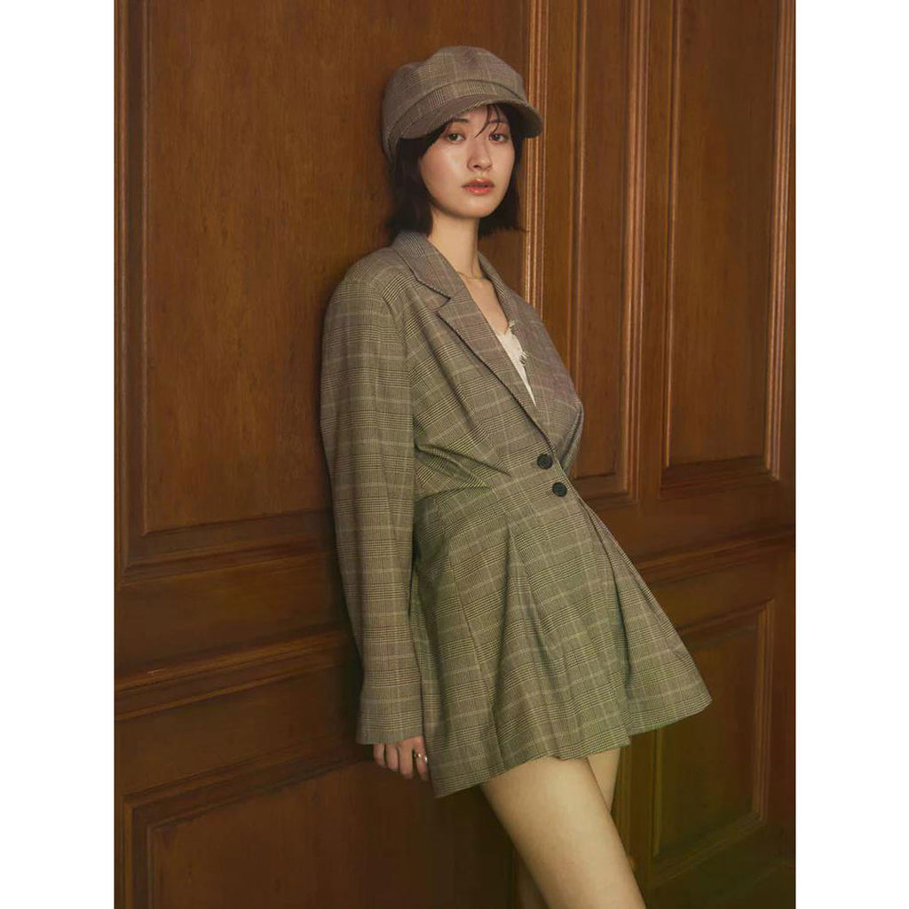 クラシカルな格紋格子に、腰圍を絞った立体的なシルエットが女性らしさを引き立てる一着。フロントにはダーツとタックを施し、ジャケットながらも美しいペプラムラインを表現。マニッシュさとフェミニンさを絶妙に融合させたデザインです。