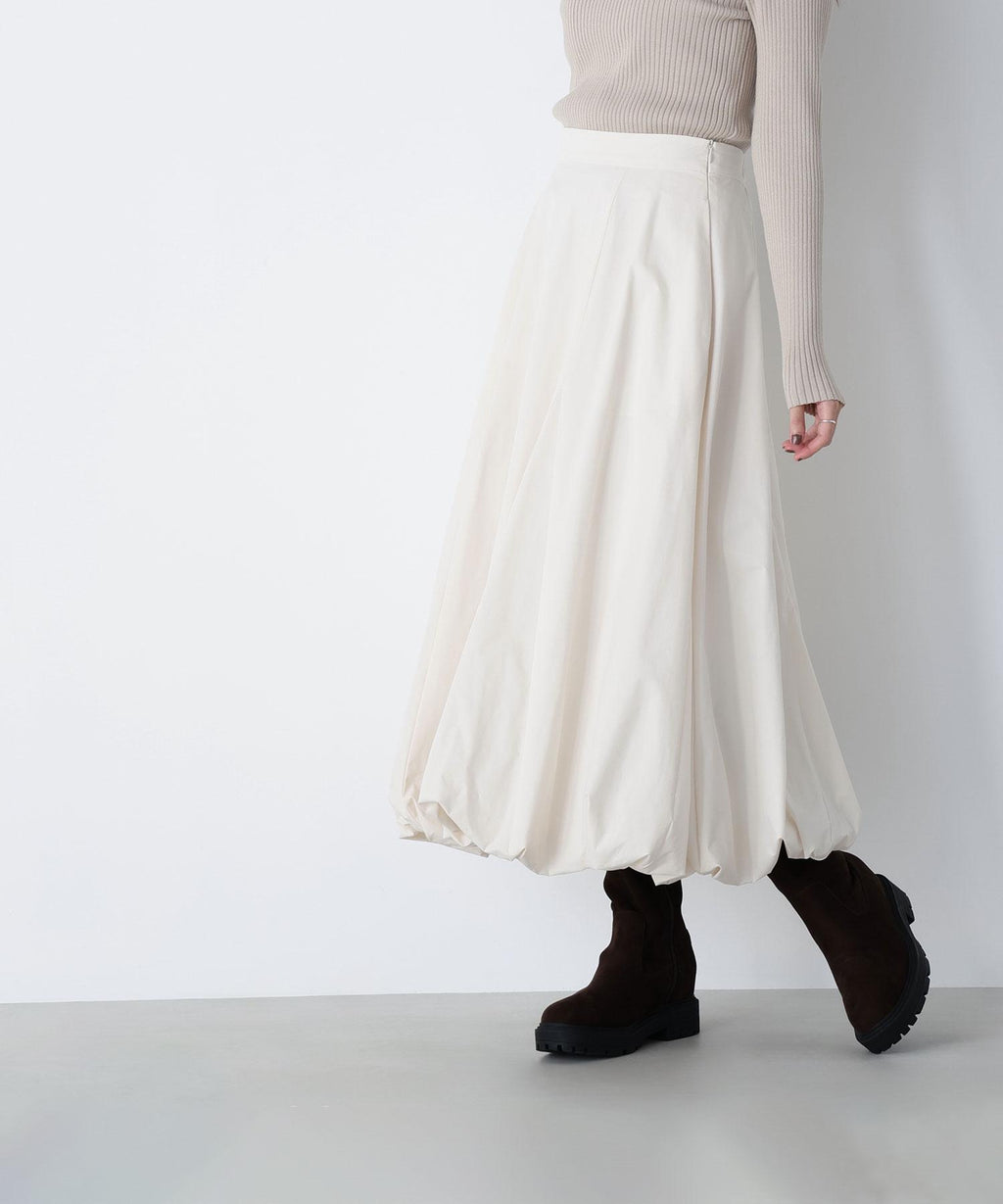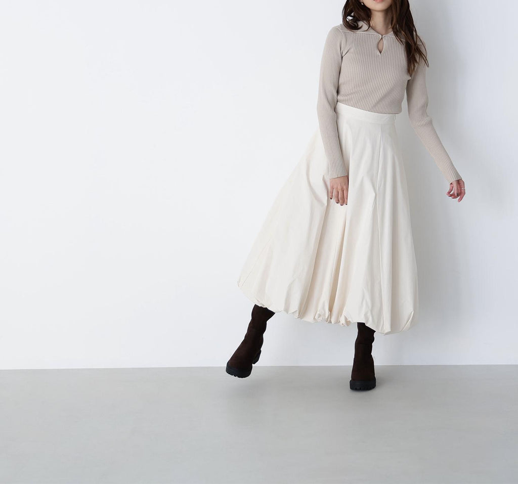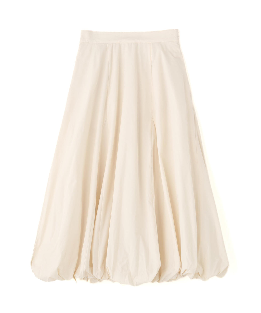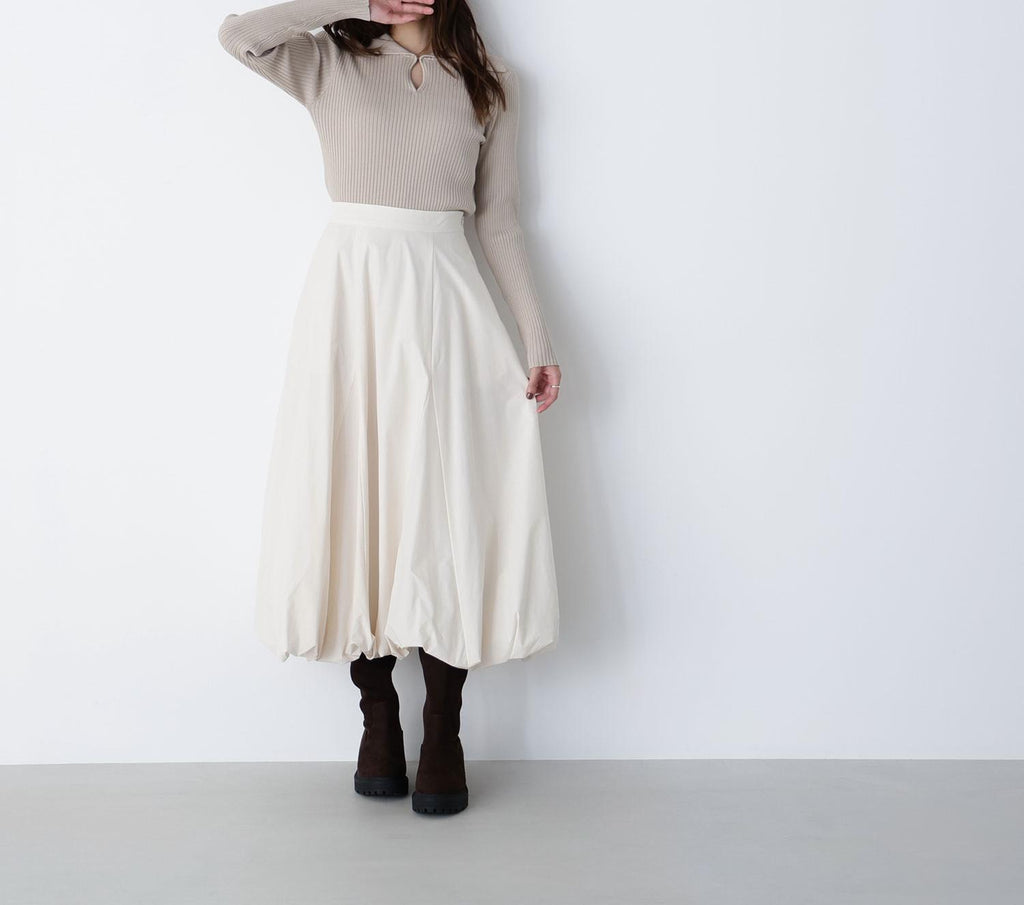 ボリューム感のあるシルエットが目を引くバルーンスカート。腰圍がすっきり見えるようハギを入れたバルーンシルエットです。裾に向かって広がるようマチをふんだんに入れたシルエットとの対比で、腰圍まわりもすっきりと見せてくれます。便利なスラッシュポケット付き。後ろ腰圍はゴム仕様なのでストレフフリーなはき心地です。