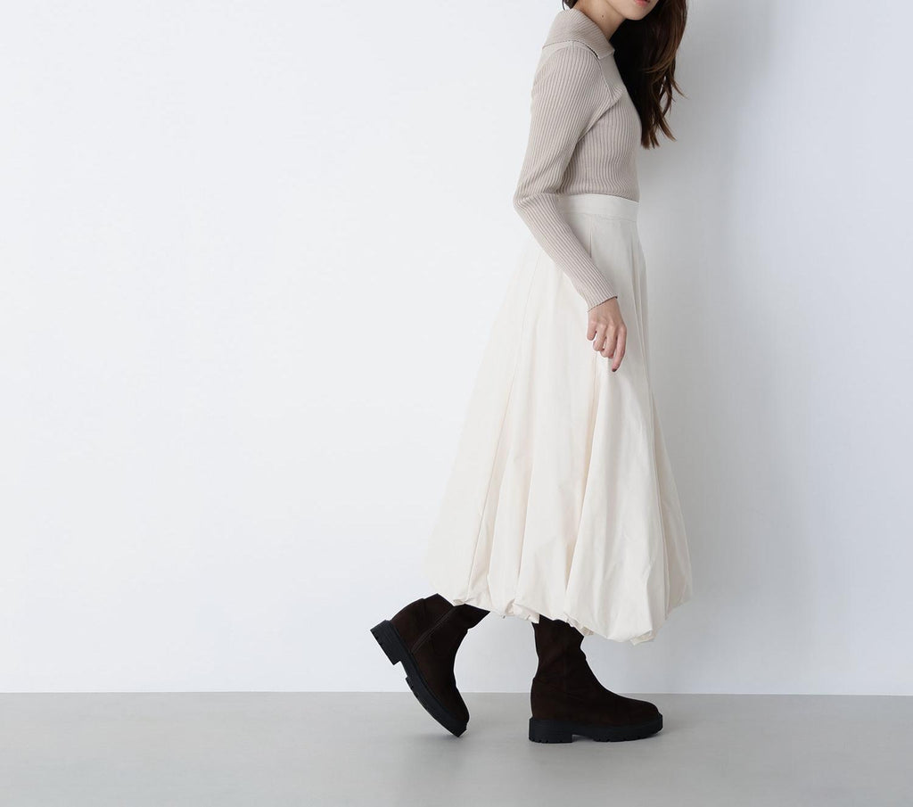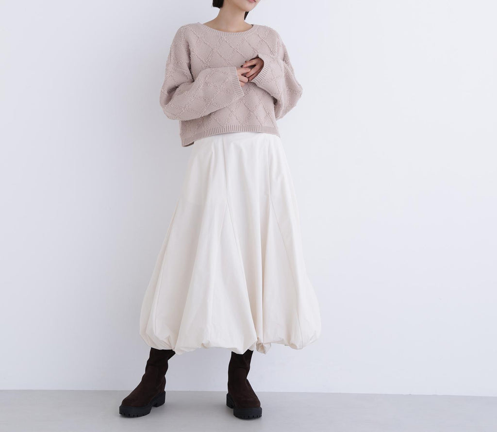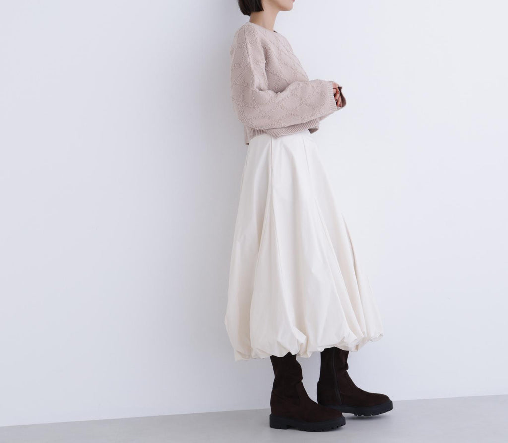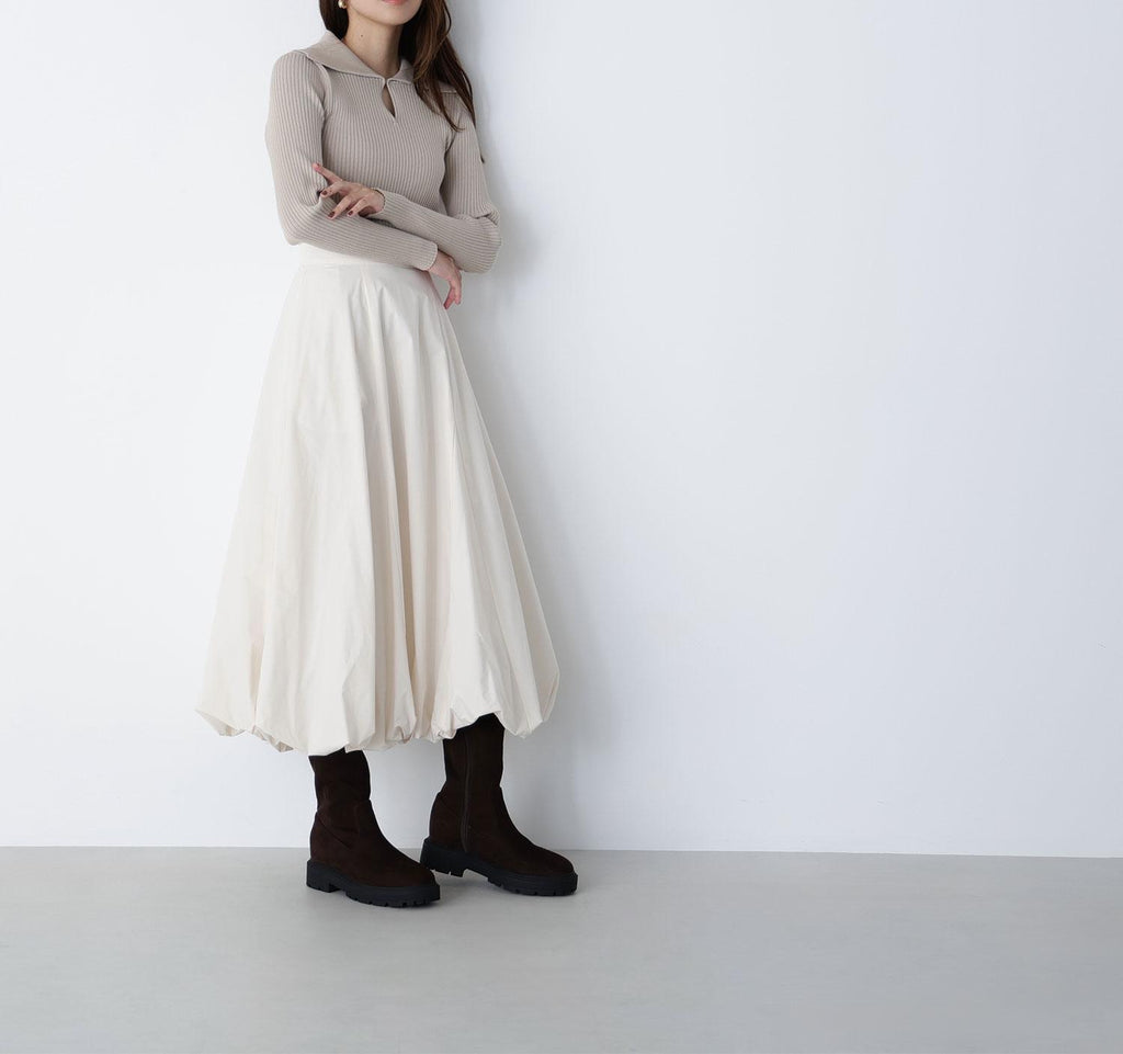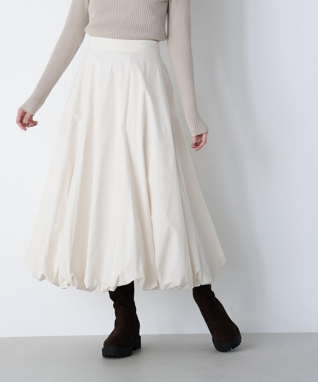 ボリューム感のあるシルエットが目を引くバルーンスカート。腰圍がすっきり見えるようハギを入れたバルーンシルエットです。裾に向かって広がるようマチをふんだんに入れたシルエットとの対比で、腰圍まわりもすっきりと見せてくれます。便利なスラッシュポケット付き。後ろ腰圍はゴム仕様なのでストレフフリーなはき心地です。