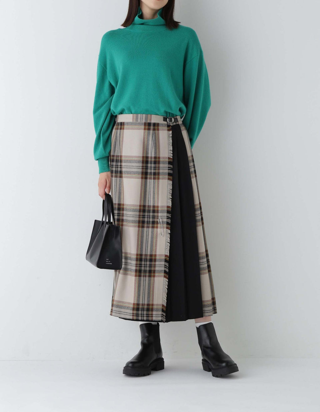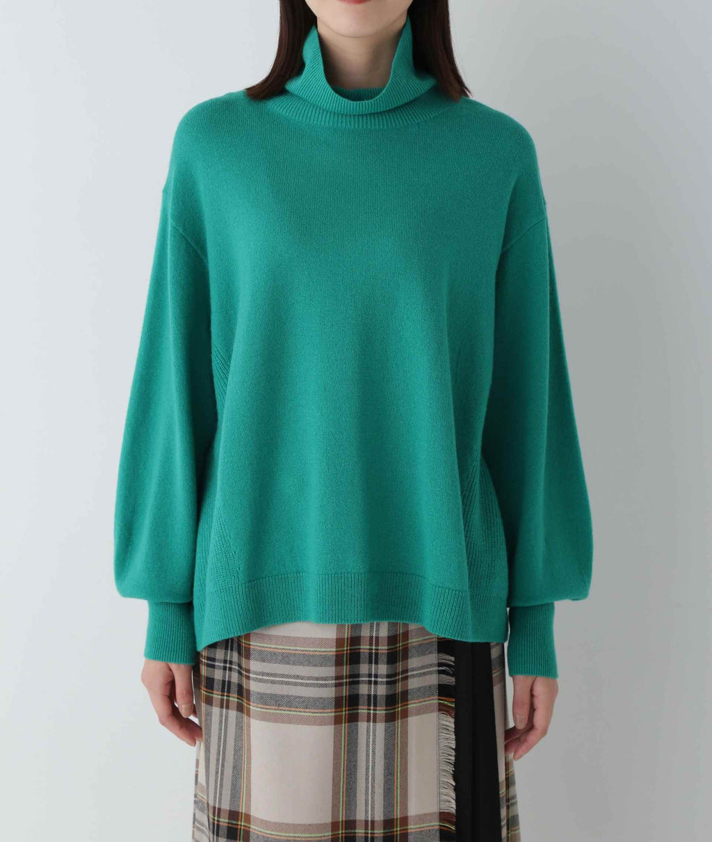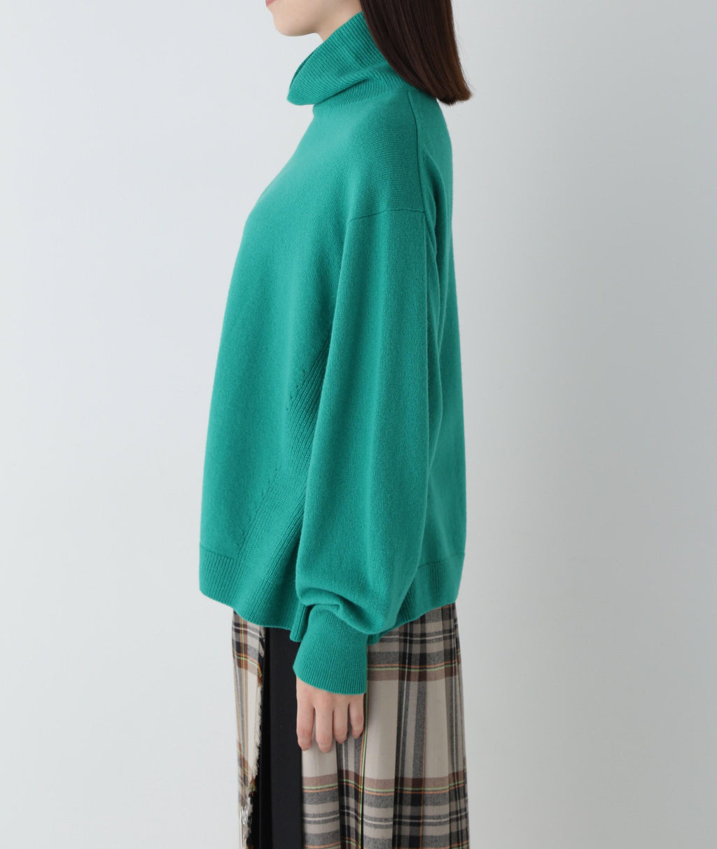 側面加入片段編織,形成低調的A字輪廓高領套頭衫。領子不過高,適度地離開脖子,穿著不會感到拘束。