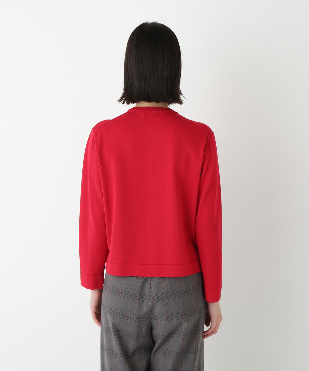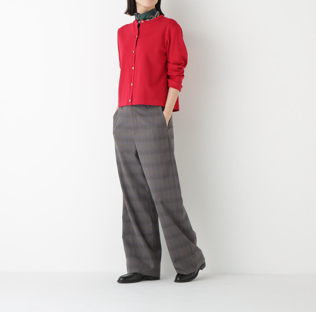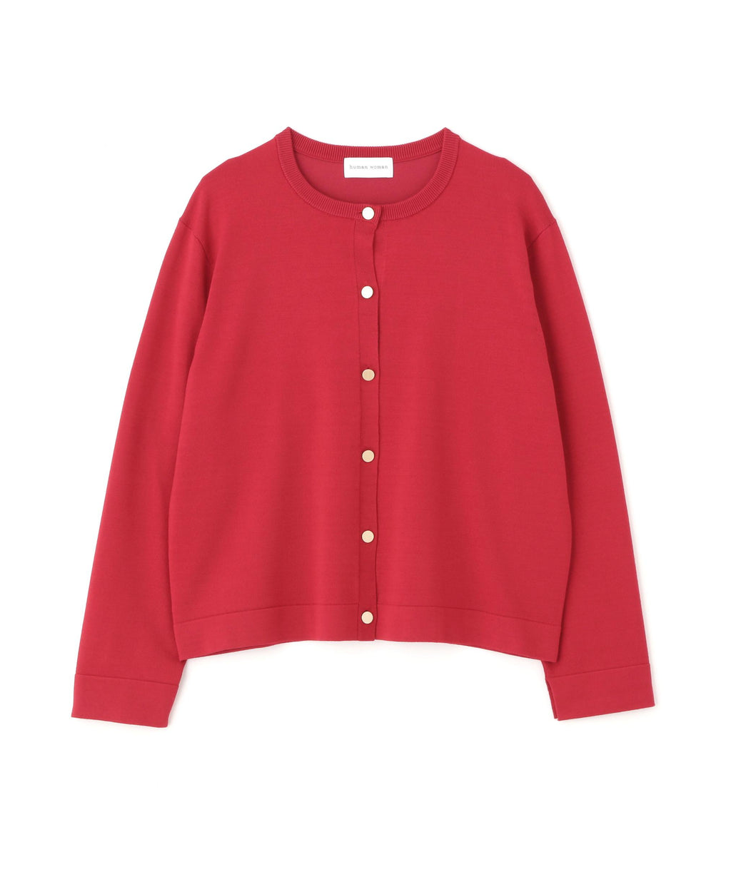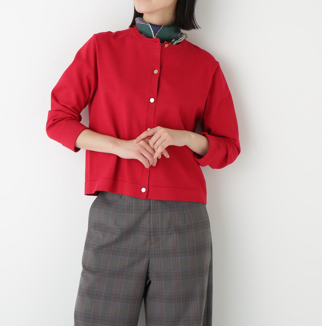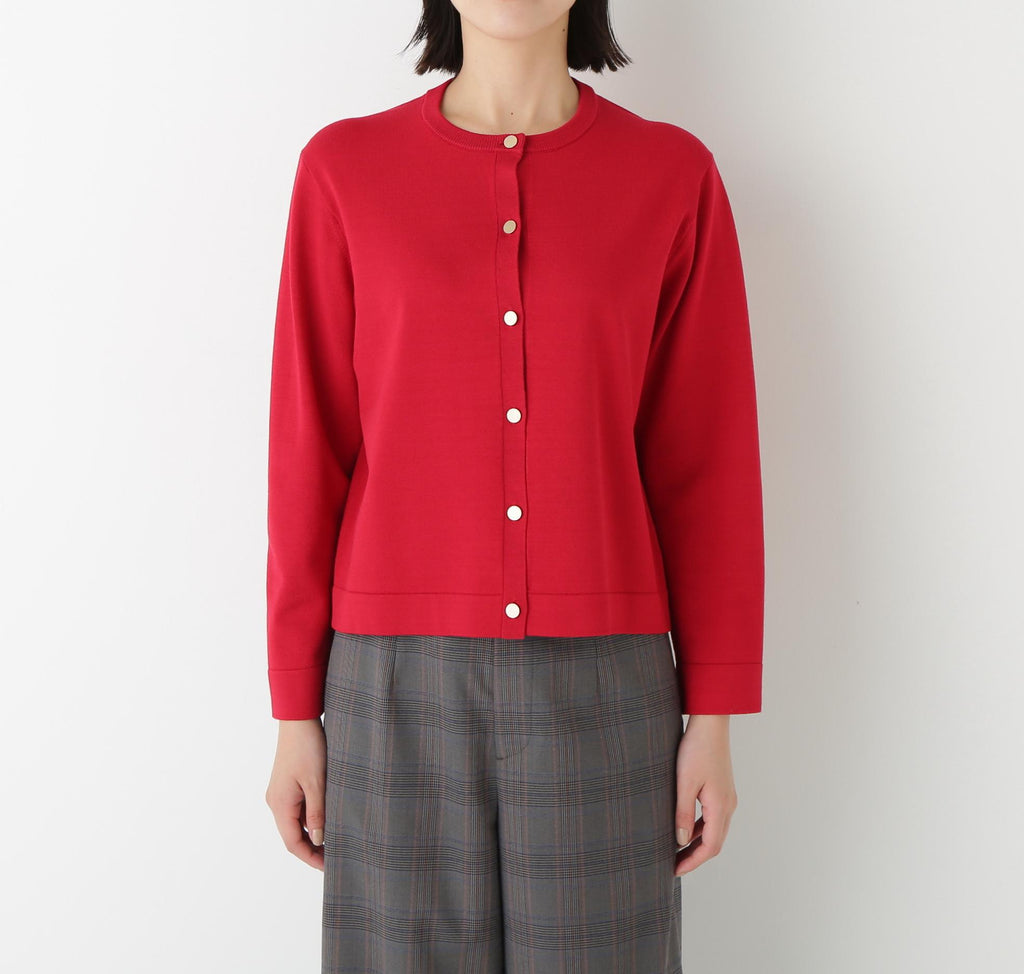 這款圓領開衫採用14G編織天竺,展現彈力感。金屬鈕扣讓整體更像西裝外套。袖長不過長,給人輕盈的印象,也可以折返穿著,展現不同風格。