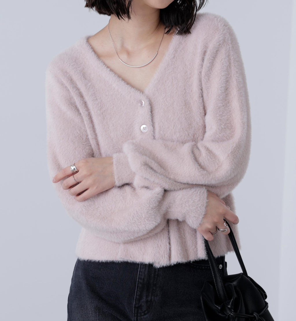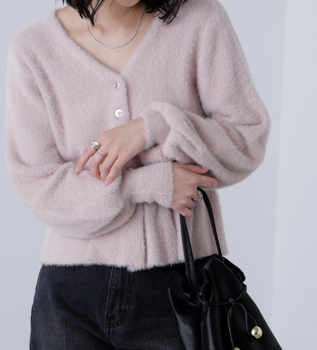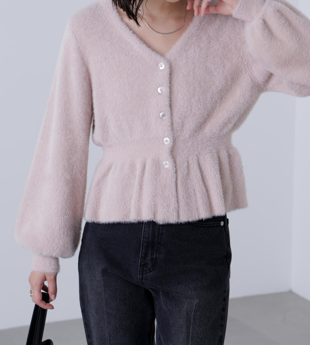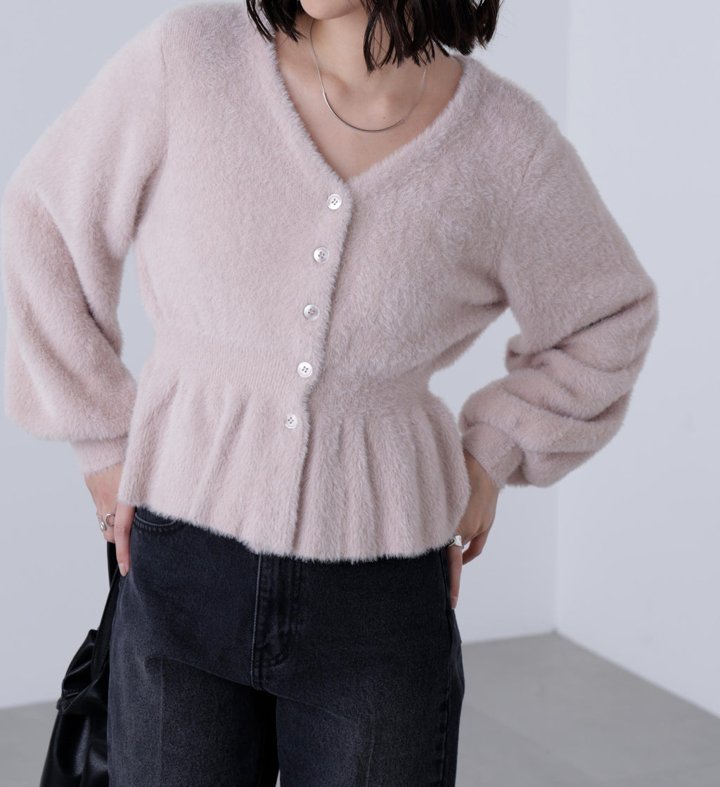 每年廣受好評的針織衫今年也登場!既可作為上衣,也可作為外套穿著,輕盈舒適的毛絨針織開衫。採用短毛足、不易刺癢肌膚的材料,並以柔軟光滑的線材製成。毛絨部分不易脫落,密度緊實。將「腰圍」做成羅紋編織以塑造身形,裙擺則採用佩普拉姆設計,打造修飾身形的輪廓。袖口採用褶皺設計,形成蓬鬆的袖子。單穿時像毛衣套頭衫,也可以搭配襯衫或高領上衣作內搭,或打開前扣作為外套搭配連衣裙等多種穿法。