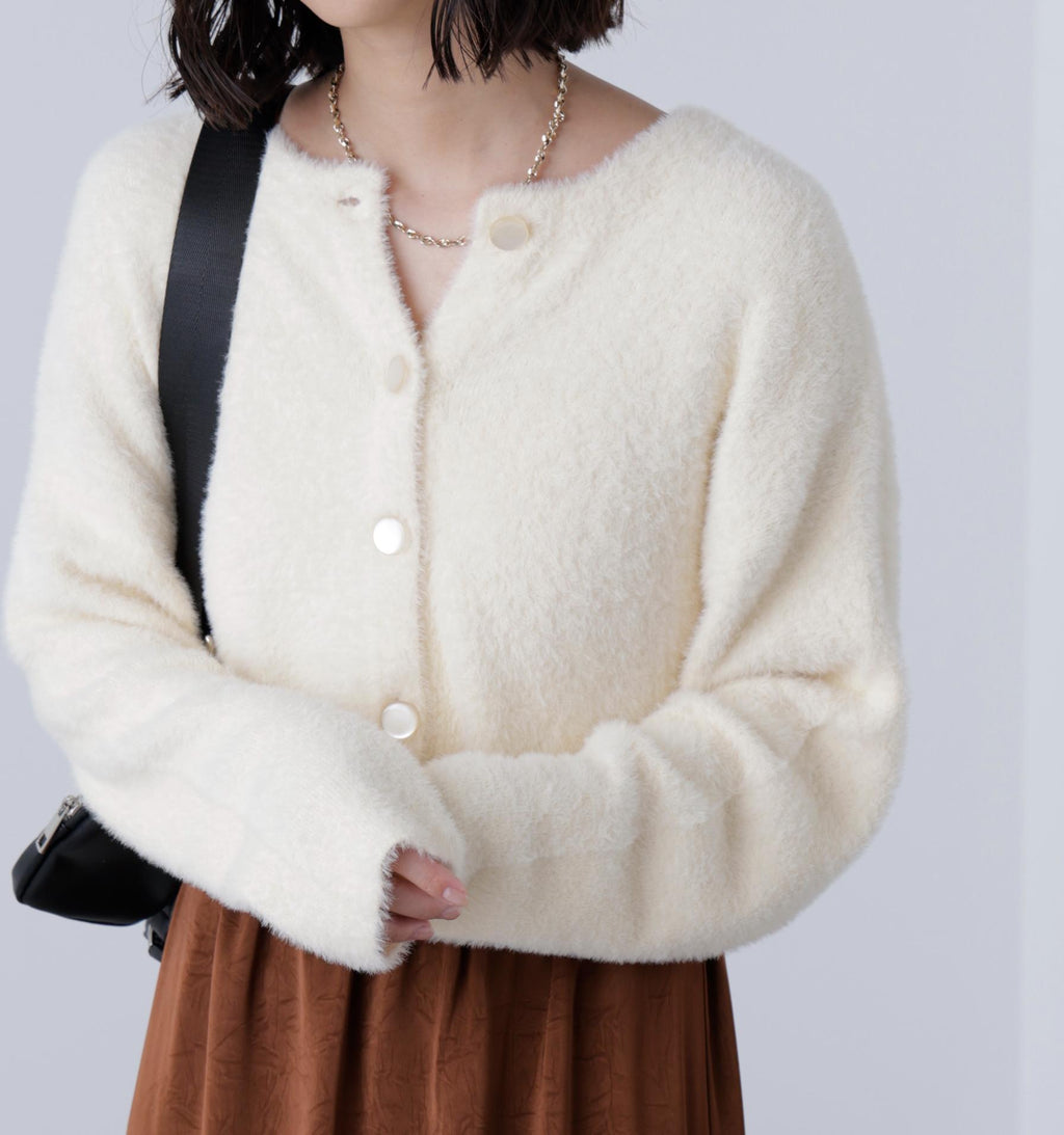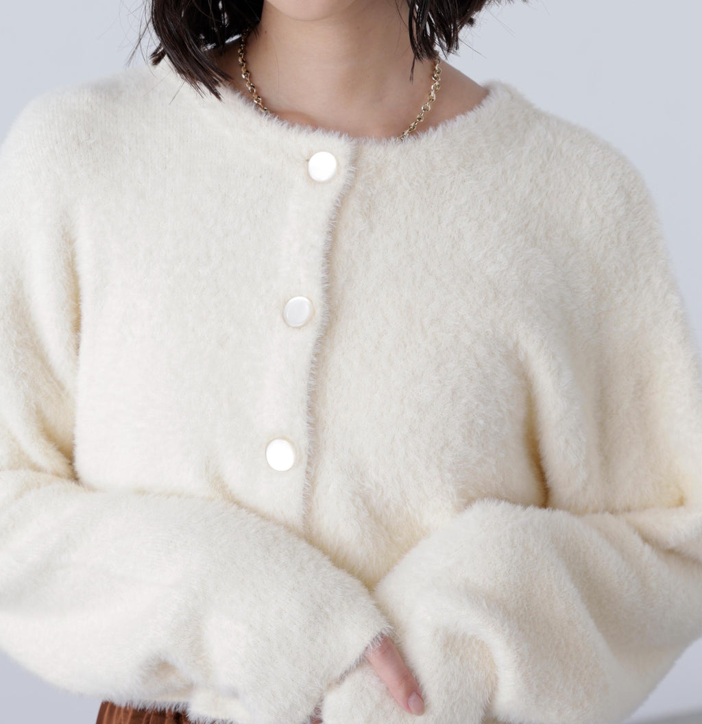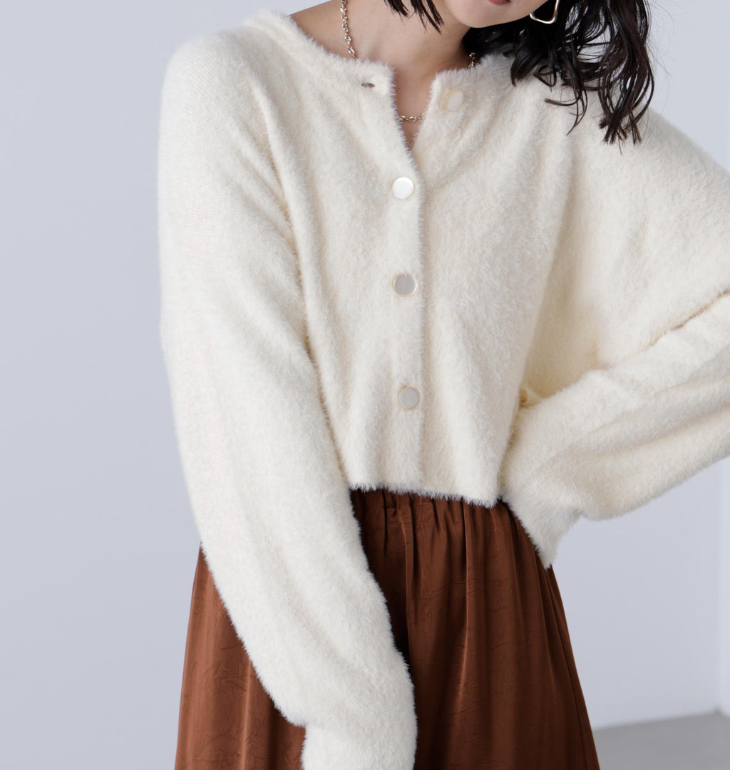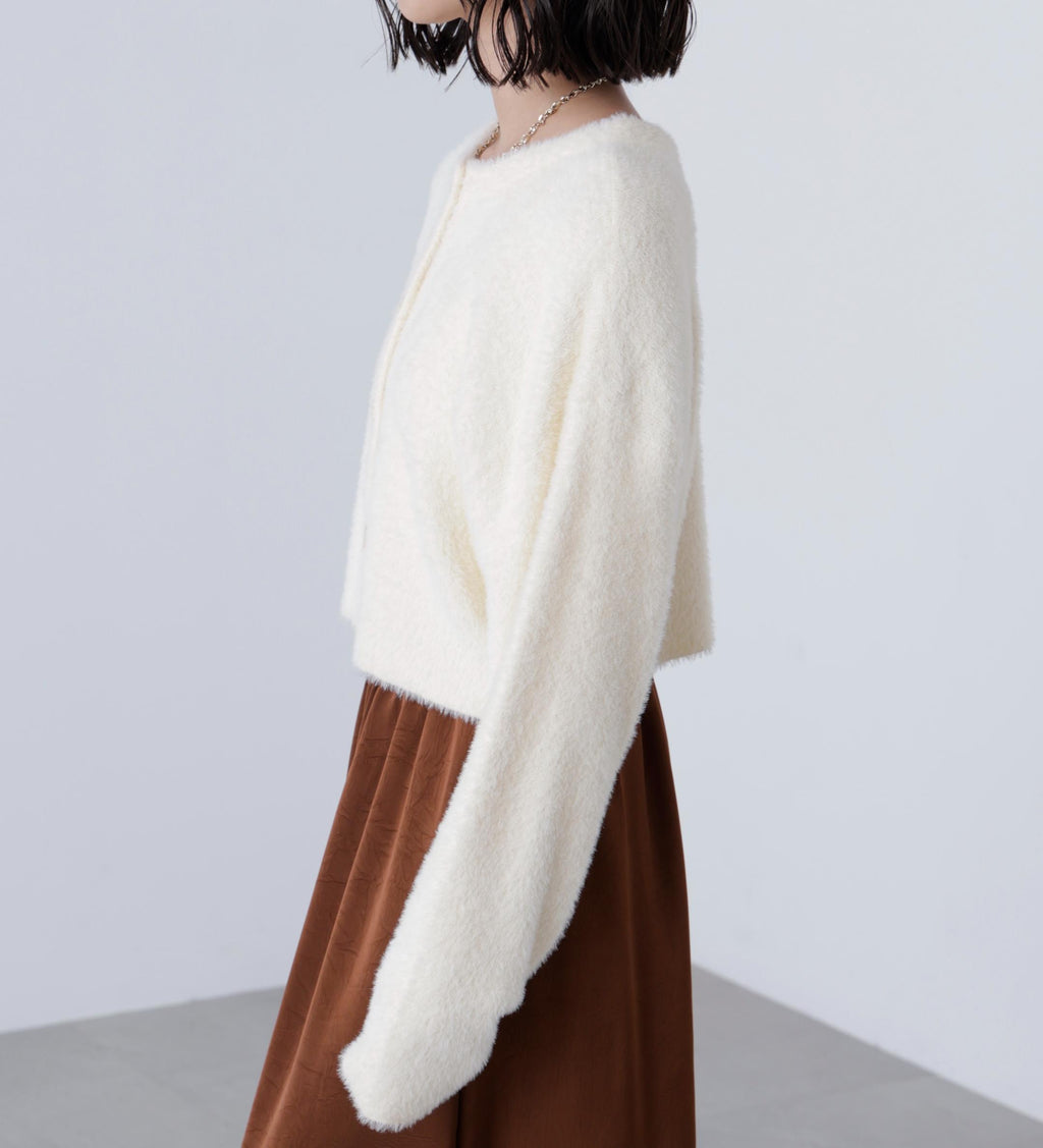 每年都受到好評的短款針織衫今季也登場!前後兩用的穿著方式,亦可作為開襟衫穿著的短款針織衫。毛絨的毛髮不易脫落,即使接觸肌膚也較少刺癢感,使用柔軟且光滑的纖維線。毛長較短,即使穿在大衣內也不易顯得笨重。胸圍較大,呈寬鬆的超大尺碼,但由於是短款,容易達到平衡感。與素材的顏色相配的前面大號鈕扣也是一大亮點。