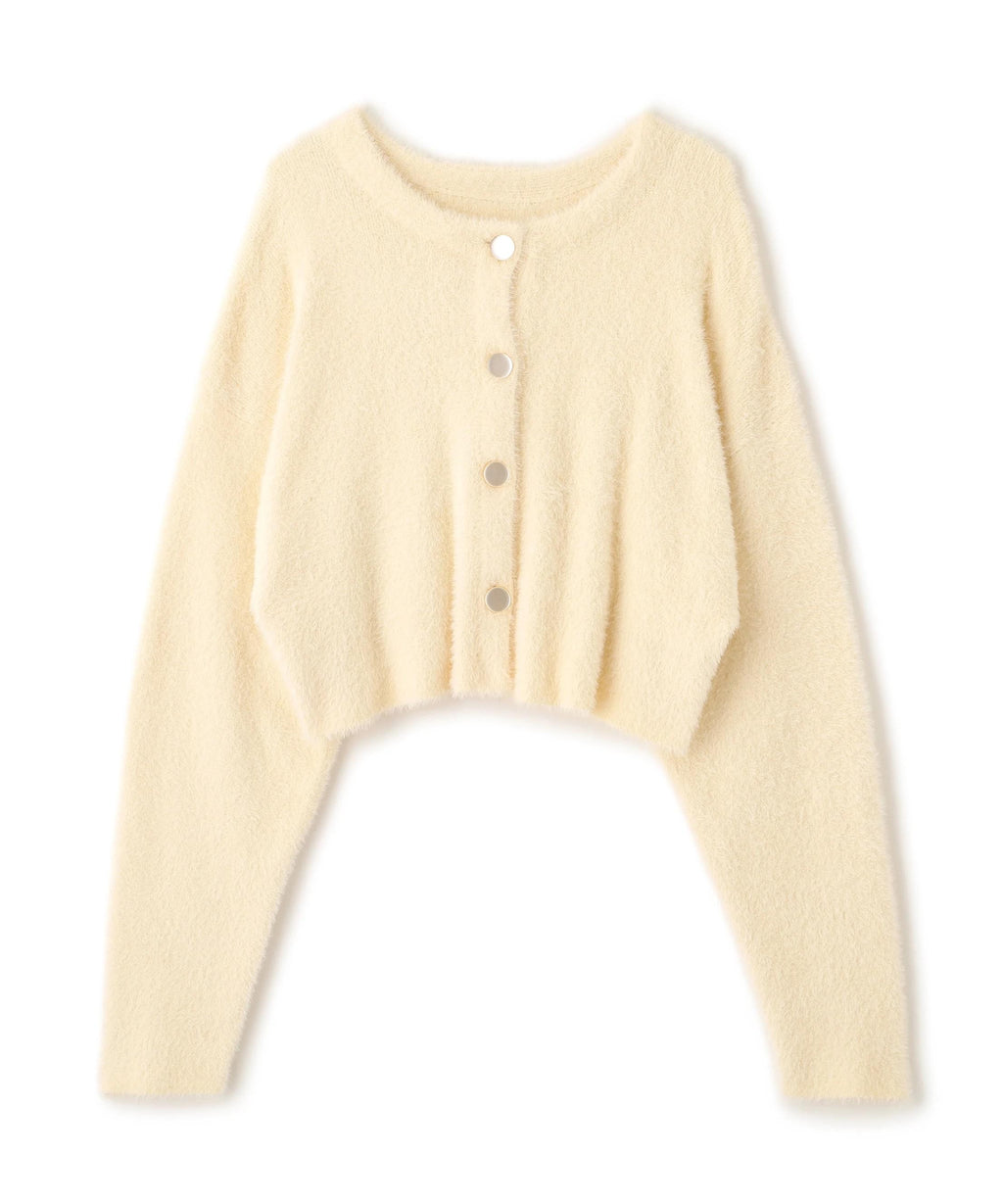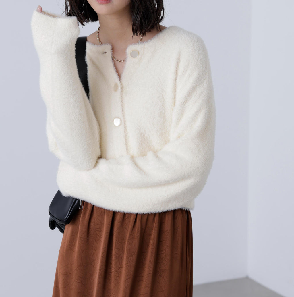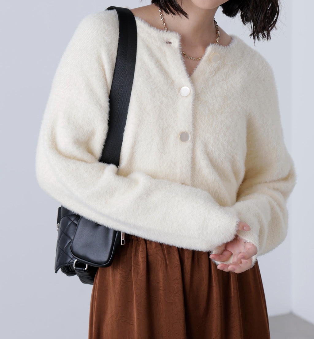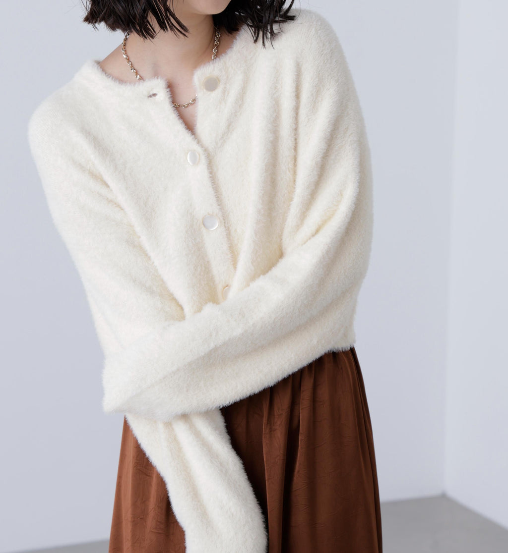 每年都受到好評的短款針織衫今季也登場!前後兩用的穿著方式,亦可作為開襟衫穿著的短款針織衫。毛絨的毛髮不易脫落,即使接觸肌膚也較少刺癢感,使用柔軟且光滑的纖維線。毛長較短,即使穿在大衣內也不易顯得笨重。胸圍較大,呈寬鬆的超大尺碼,但由於是短款,容易達到平衡感。與素材的顏色相配的前面大號鈕扣也是一大亮點。