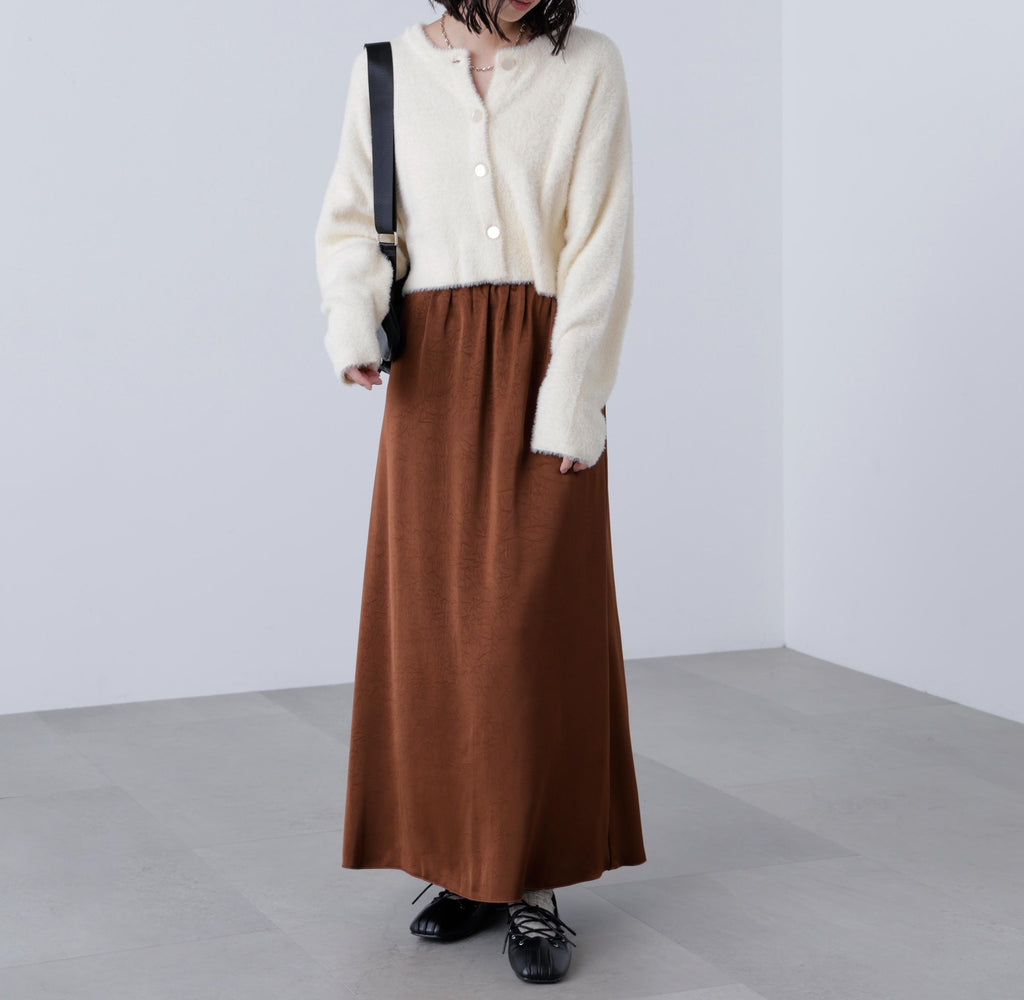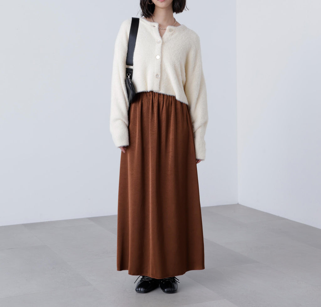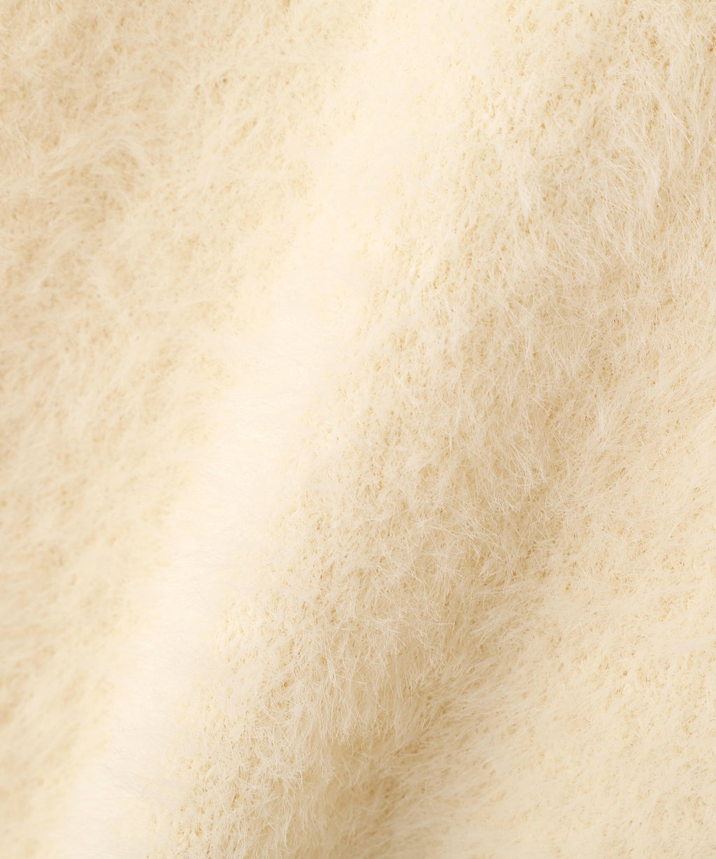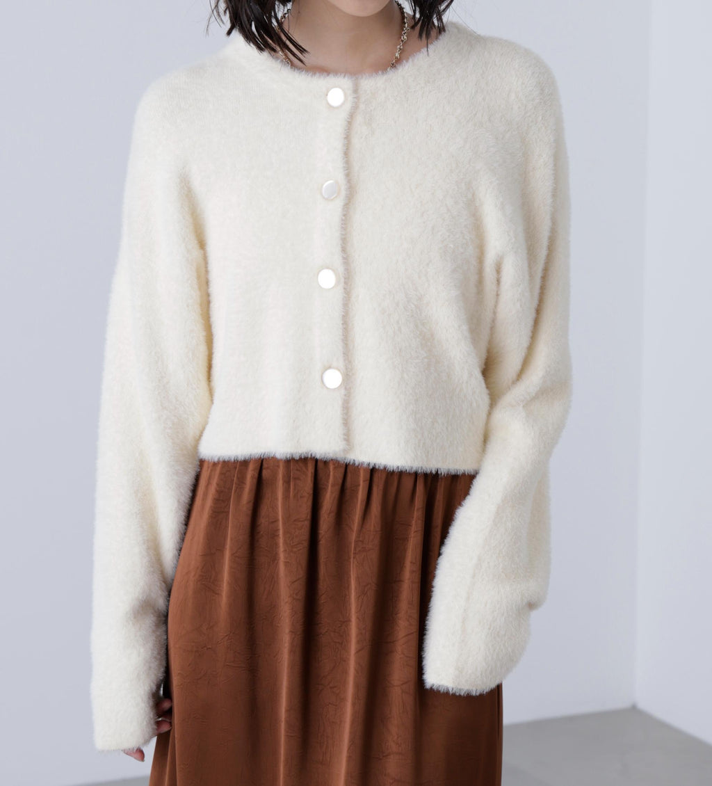 每年都受到好評的短款針織衫今季也登場!前後兩用的穿著方式,亦可作為開襟衫穿著的短款針織衫。毛絨的毛髮不易脫落,即使接觸肌膚也較少刺癢感,使用柔軟且光滑的纖維線。毛長較短,即使穿在大衣內也不易顯得笨重。胸圍較大,呈寬鬆的超大尺碼,但由於是短款,容易達到平衡感。與素材的顏色相配的前面大號鈕扣也是一大亮點。