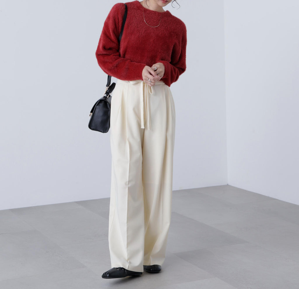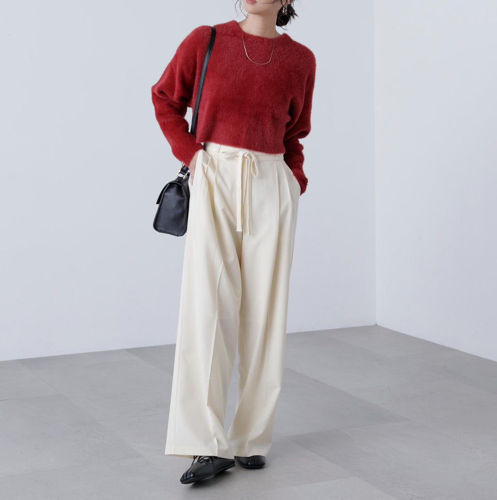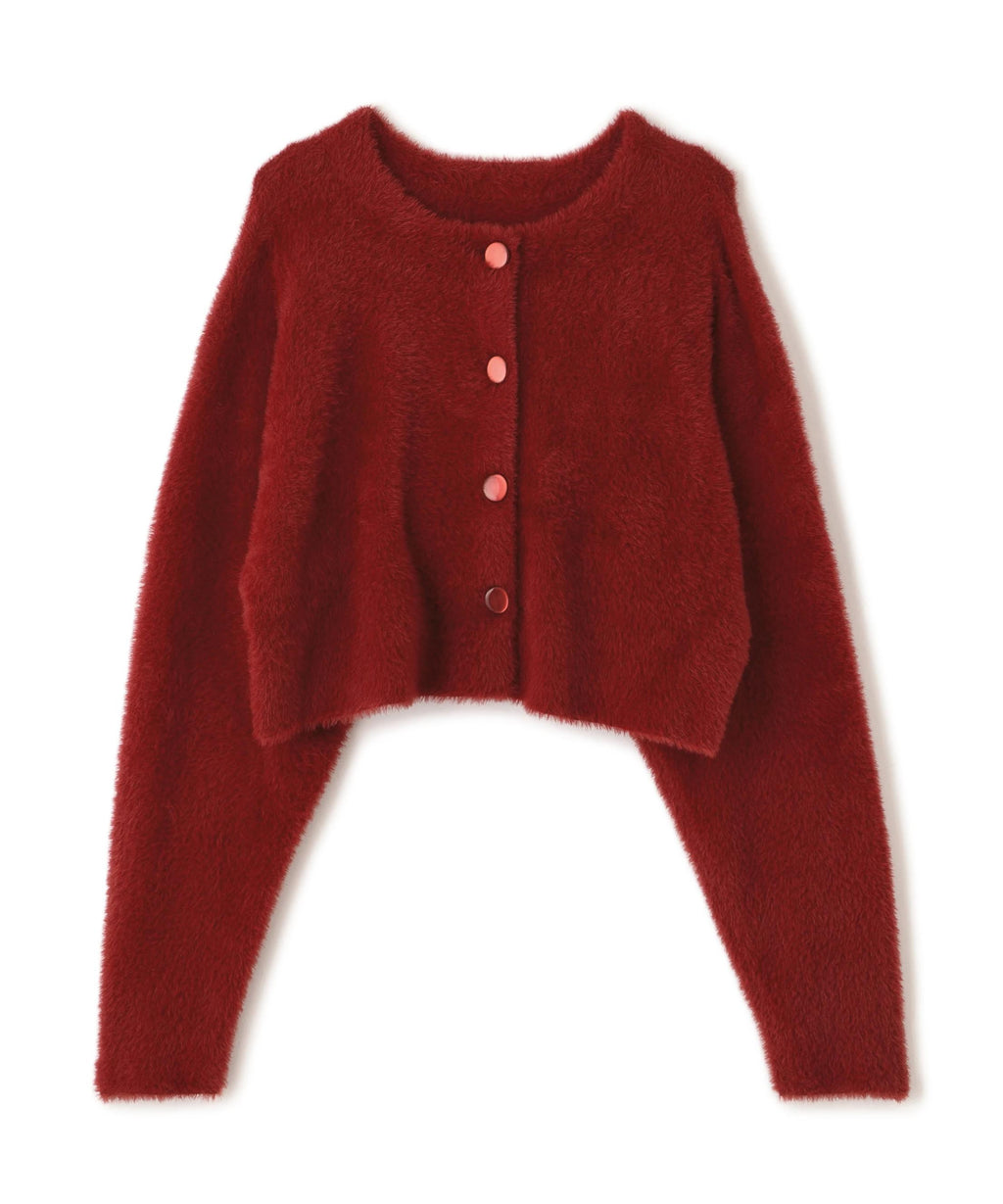 每年都受到好評的短款針織衫今季也登場!前後兩用的穿著方式,既可以作為開襟外套,也可以作為針織衫穿著。毛絨的毛髮不易脫落,即使接觸肌膚也較少刺癢感,使用柔軟且光滑的纖維線。毛長較短,即使穿在大衣內也不易顯得笨重。胸圍較大,呈現寬鬆的超大尺碼,但由於是短款,能夠輕鬆取得平衡感。與素材的顏色相配的前面大號鈕扣也是一個亮點。