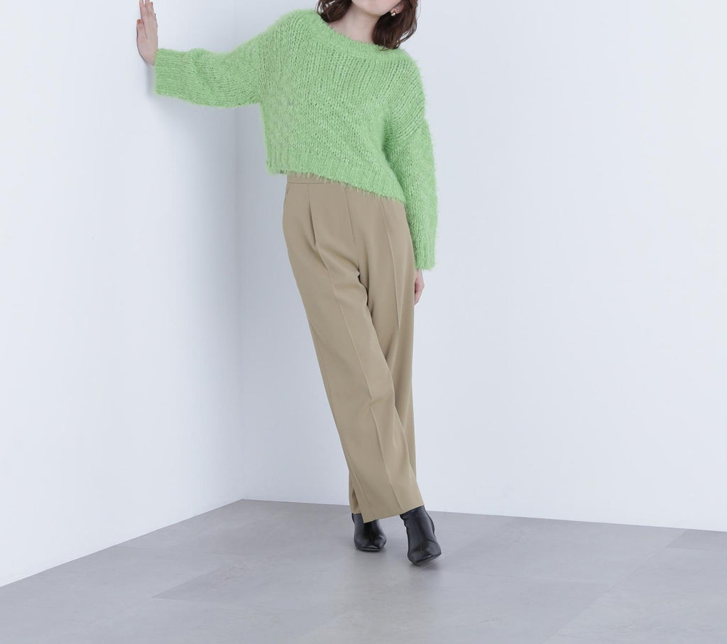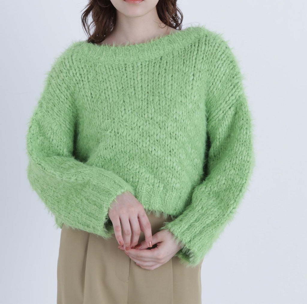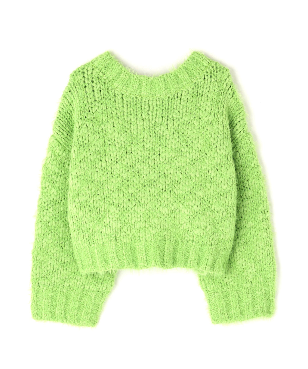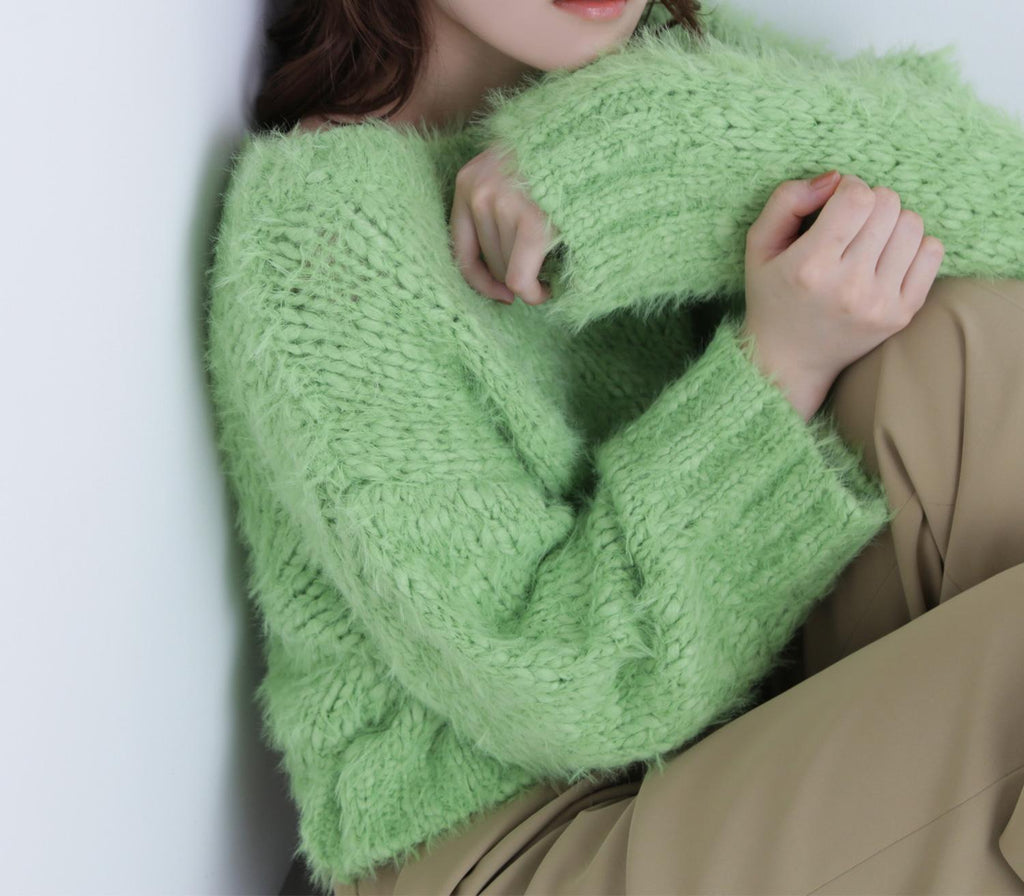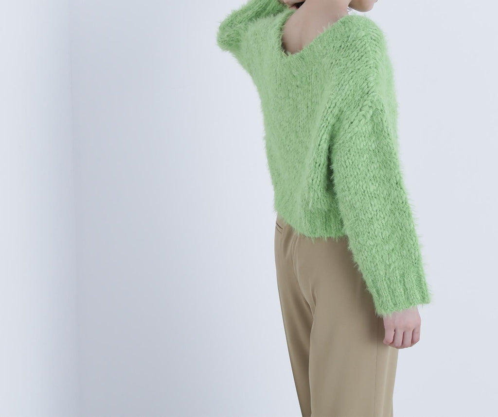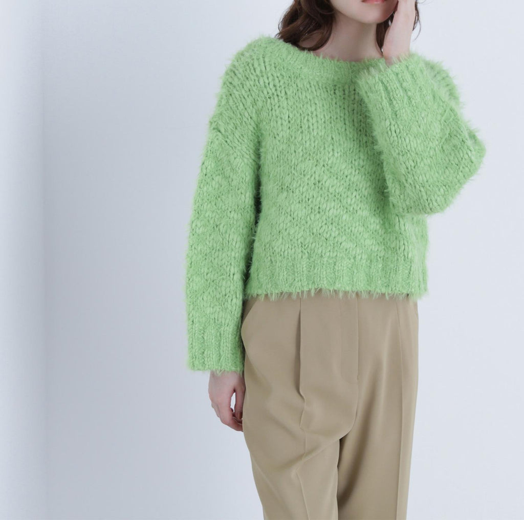 這款針織衫可作為船領或V領穿著,前後兩用設計。採用粗號麻花紗與毛絨羽毛混紡的高品質材質。寬寬的領口羅紋增添隨性感。即使不塞進褲子或裙子也能穿出合適的長度,搭配方便。