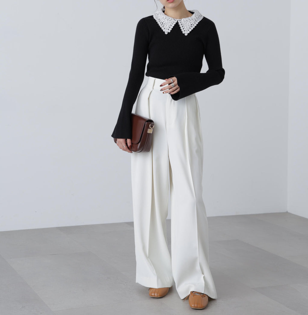 【用蕾絲領提升造型】這款蕾絲領設計是你今秋想要加入的。高雅的蕾絲領非常吸引注意力。採用柔軟的針織素材,觸感細膩。由於使用了肌膚觸感良好的針織素材,雖然是緊身款,但不易勾勒出身形。袖口的喇叭袖也是設計亮點。適中長度的短款設計,能與各種下著搭配。與短褲或迷你裙搭配效果極佳。也推薦搭配寬鬆牛仔褲或高腰西裝褲的造型。