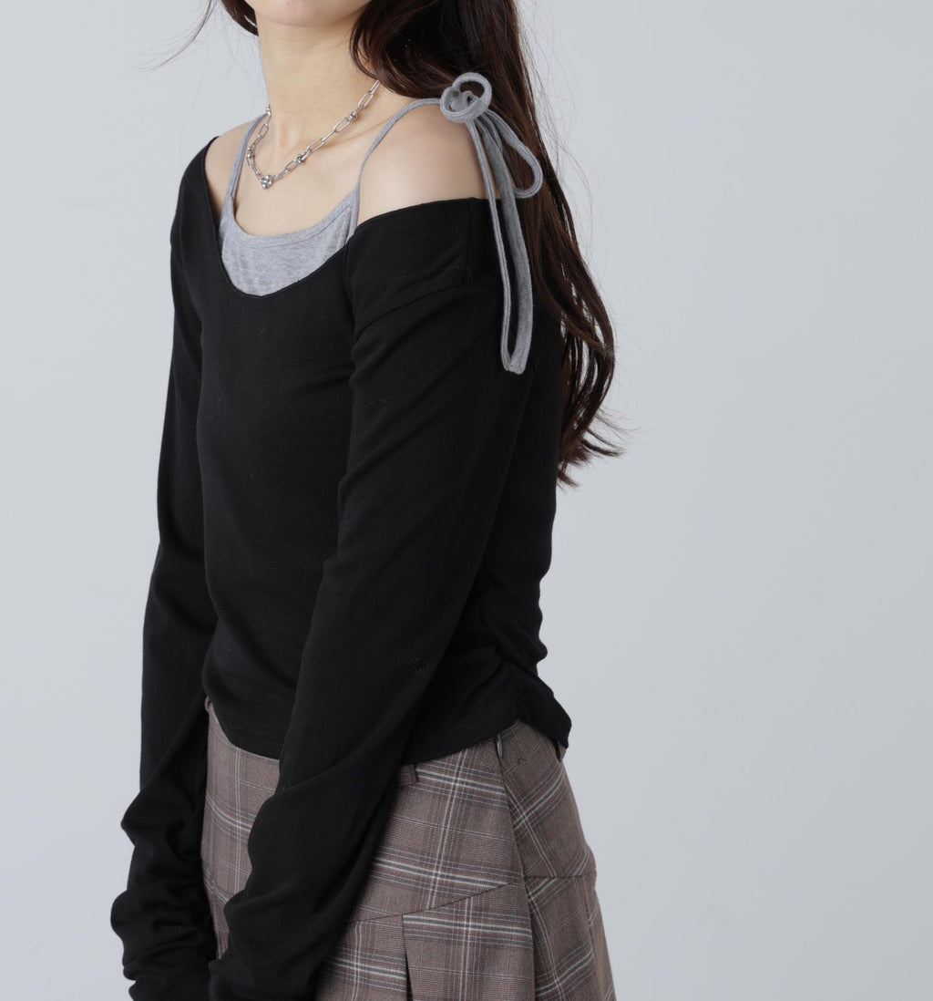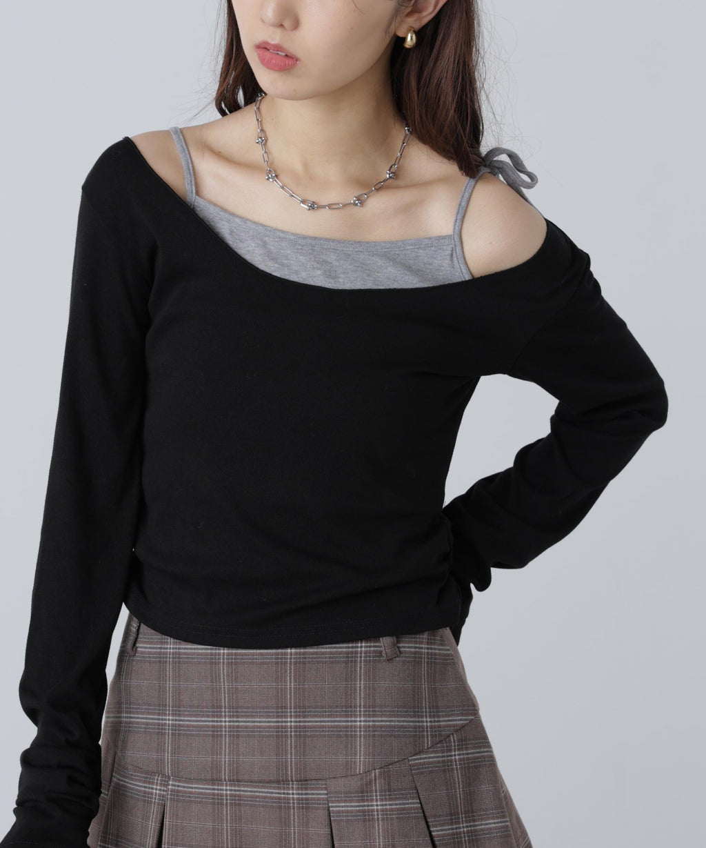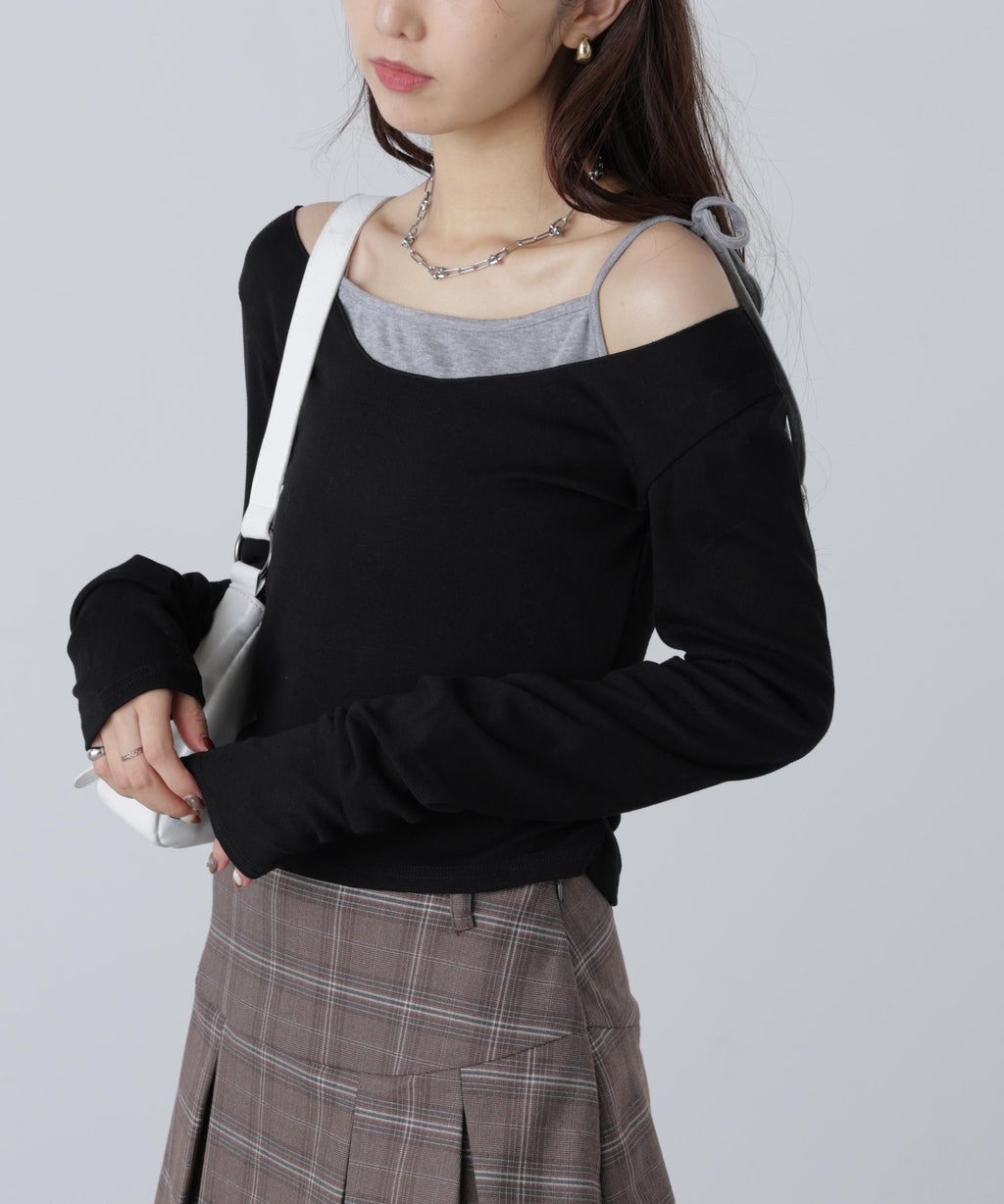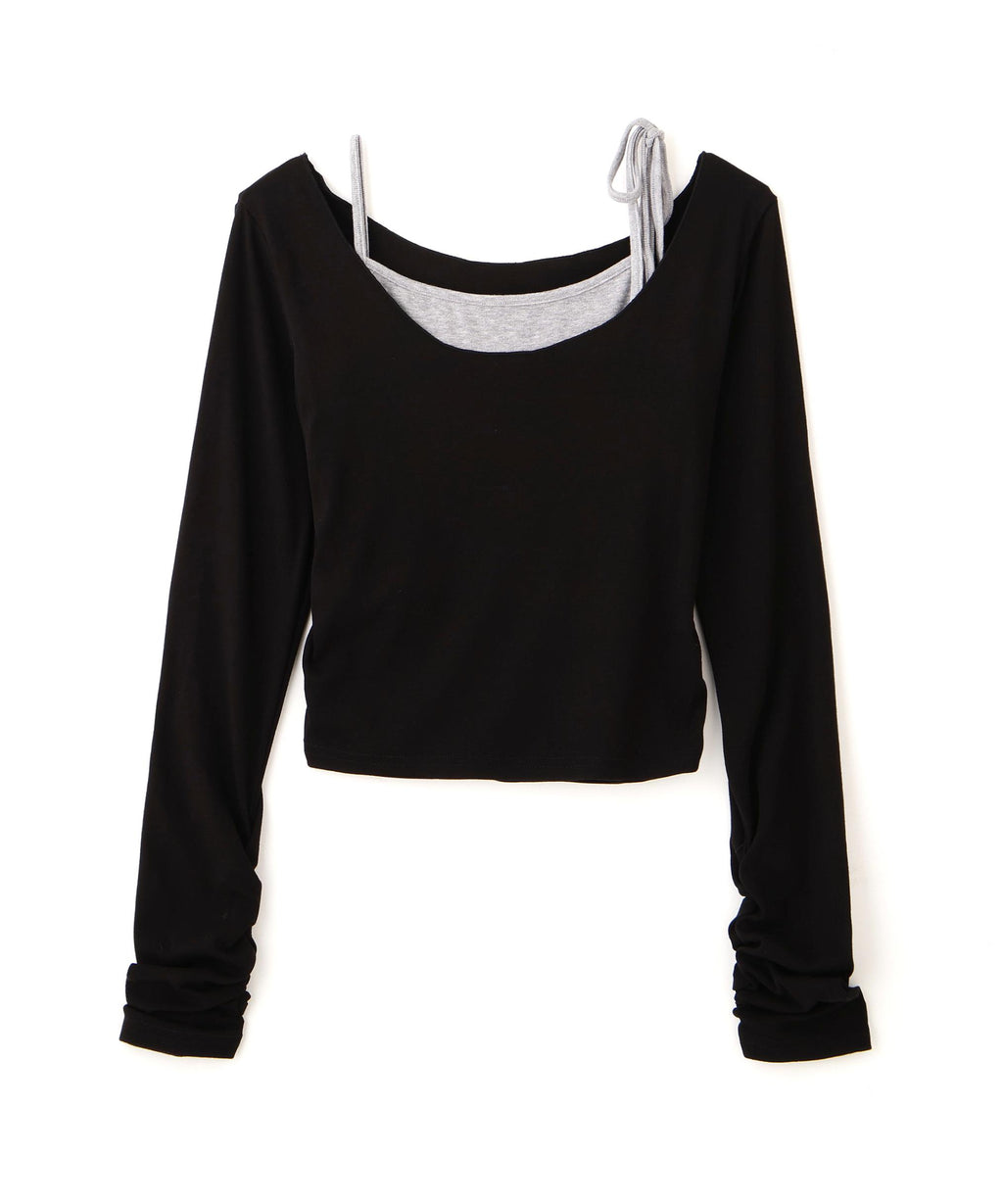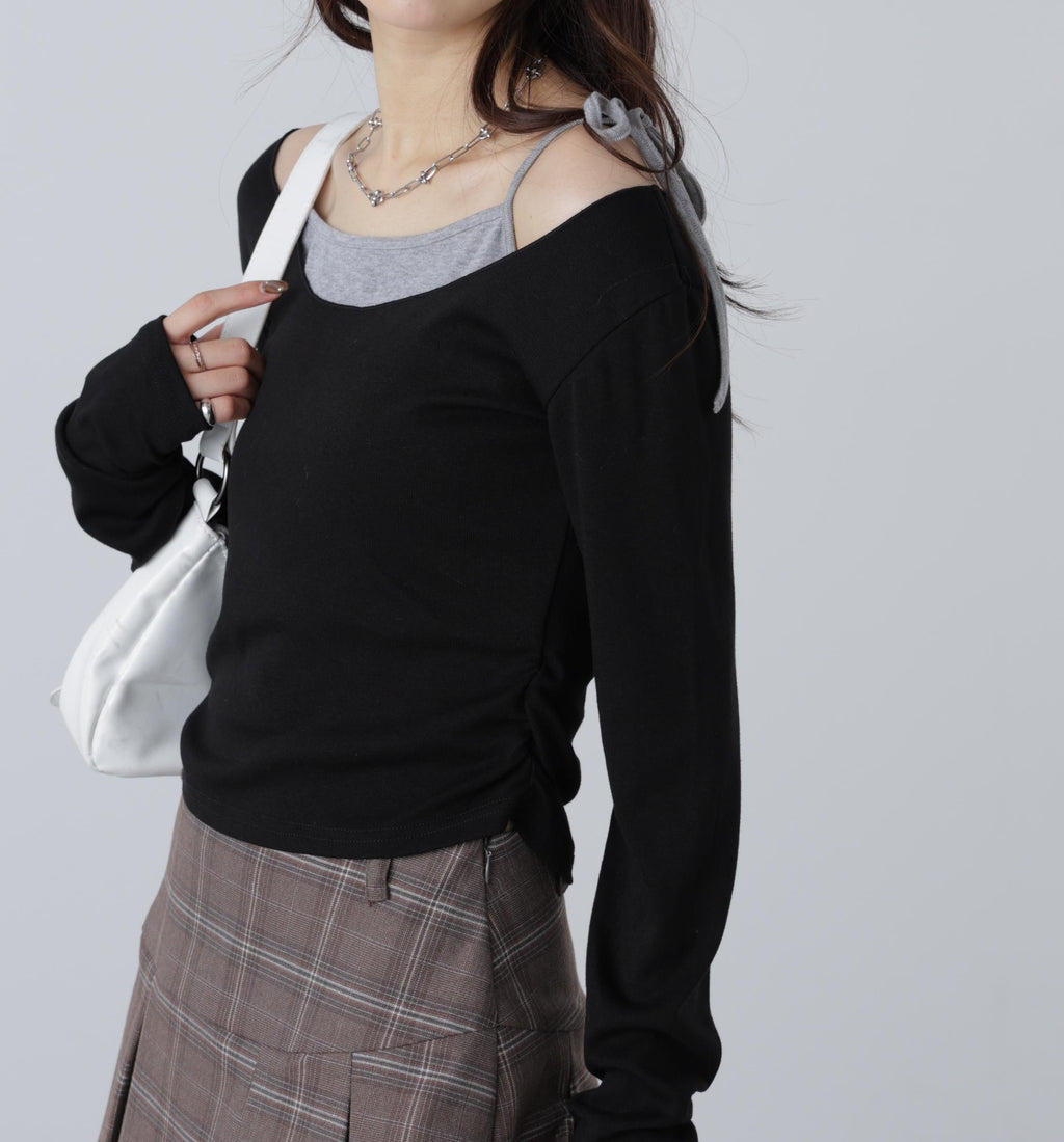 柔滑且具有良好彈性的純棉天竺材質的一體成型上衣,與同素材的吊帶衫組合成層次感的剪裁T恤。上衣的領口設計適合露肩時貼合。內搭的左肩採用蝴蝶結細節,增添芭蕾舞風情。袖口的抽皺褶皺帶來現代感和立體感。由於層次已經完成,只需搭配寬鬆牛仔褲即可輕鬆穿出造型。也推薦搭配迷你裙展現甜美風格。