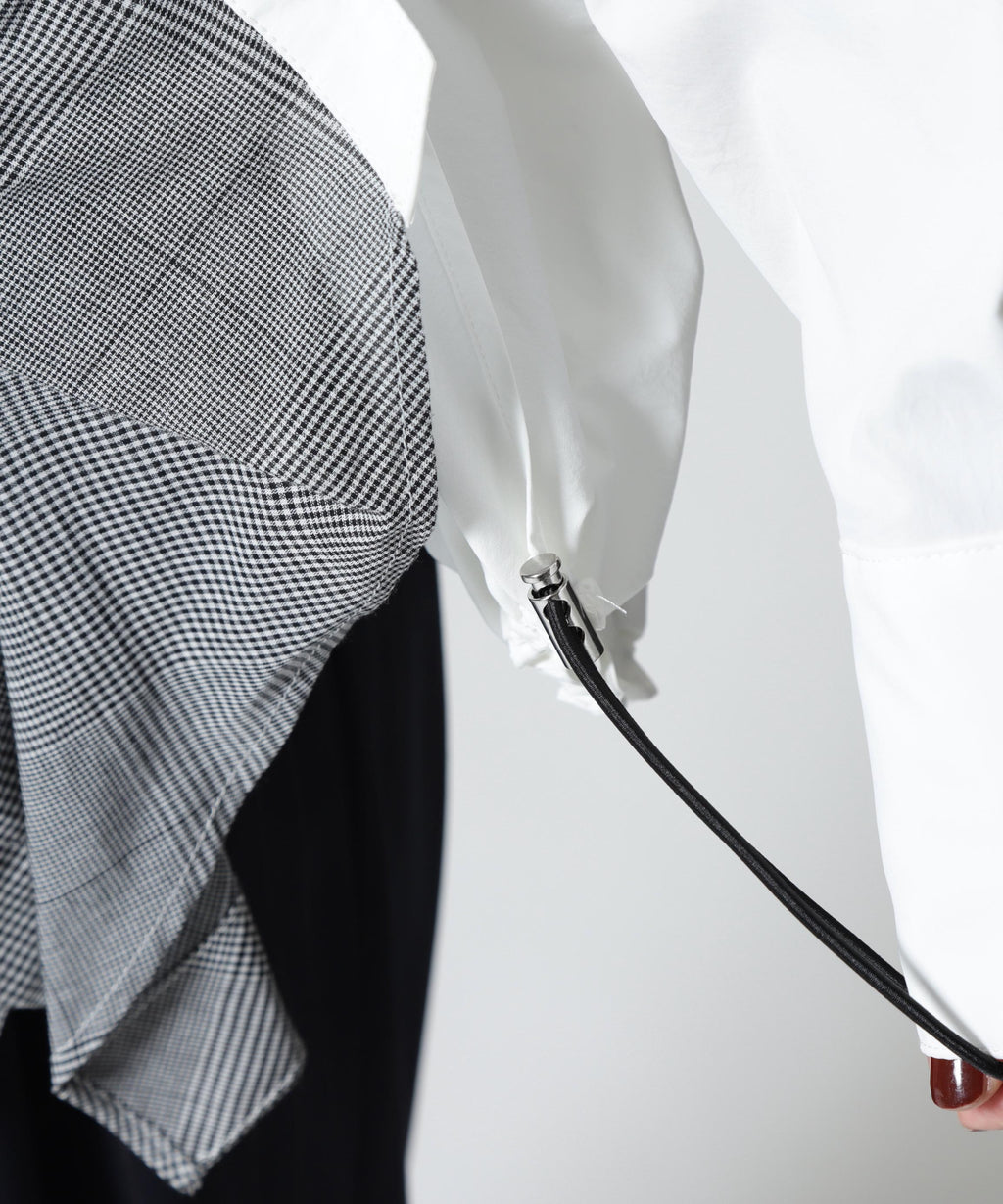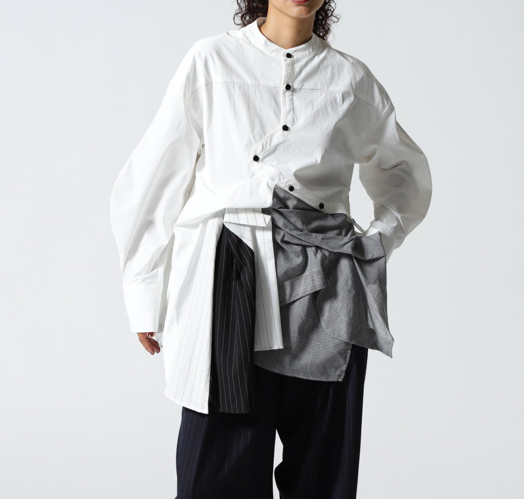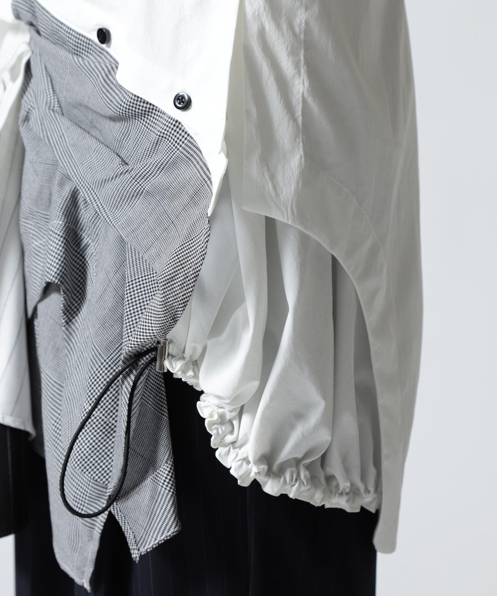 隨機加入的褶皺和變形的前襟設計,以及圓錐型輪廓,營造出立體感的設計。同款設計的裙子也有展出,因此可以搭配套裝穿著。