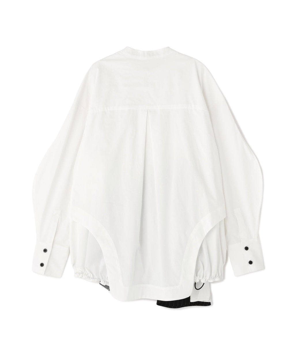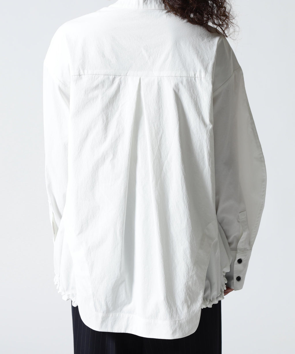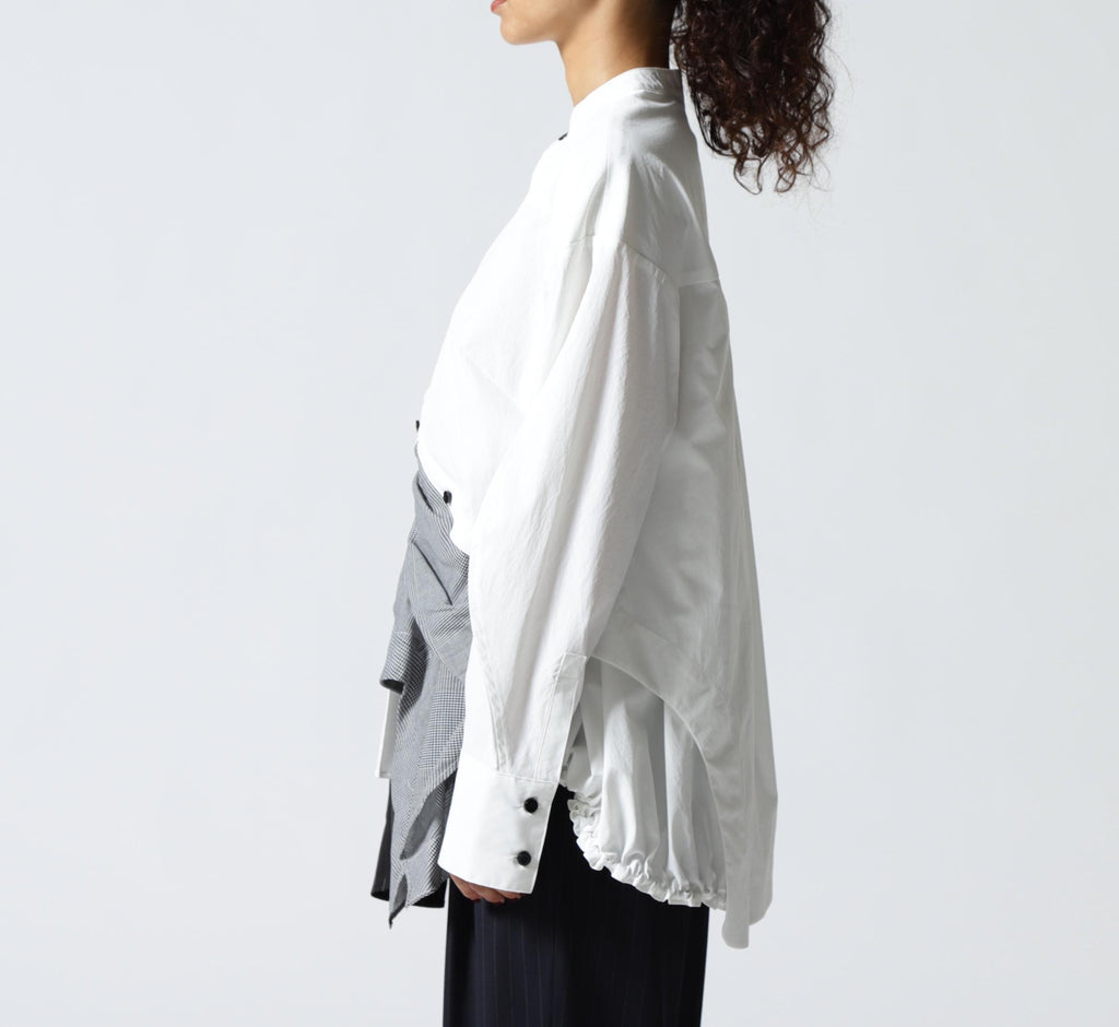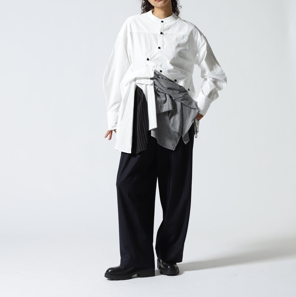 隨機加入的褶皺和變形的前襟設計,以及圓錐型輪廓,營造出立體感的設計。同款設計的裙子也有展出,因此可以搭配套裝穿著。