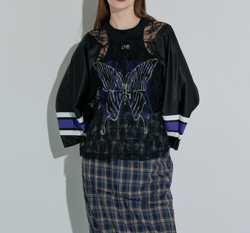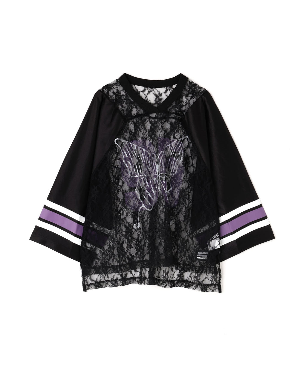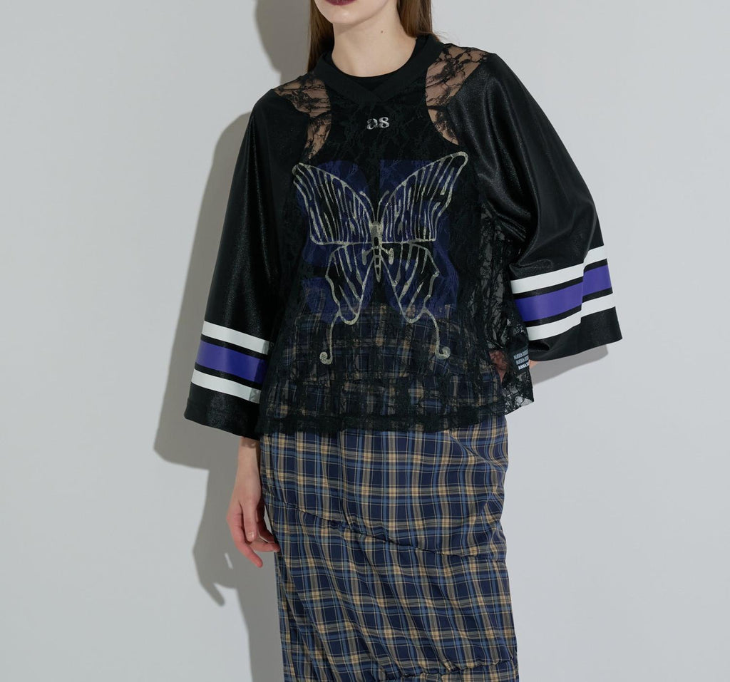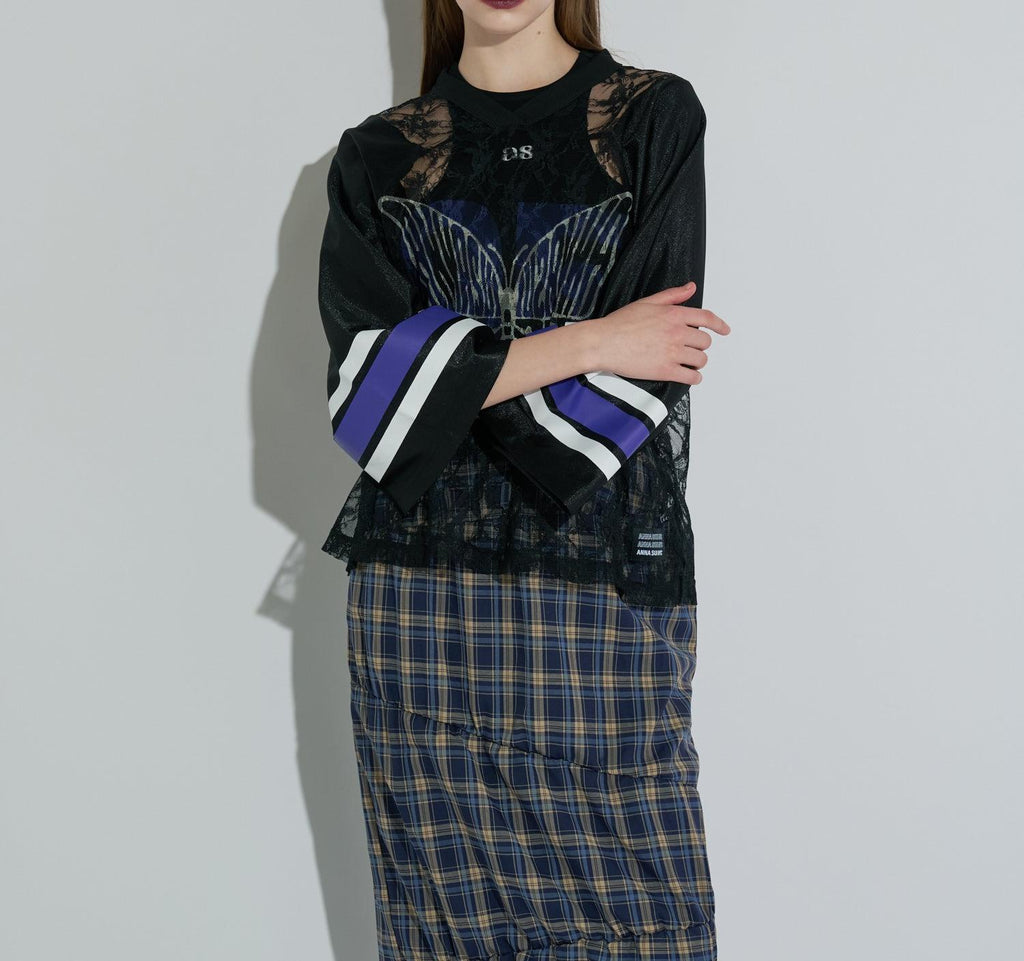 ANNA SUI NYC的經典遊戲襯衫搭配蕾絲,展現運動感與性感氛圍並存的一件。透膚蕾絲上,大膽排布的數字和蝴蝶圖案印花,絕對在街頭吸睛。具有光澤感的制服風格素材和線條印花等運動細節,與細膩蕾絲的對比營造出新鮮的平衡感。根據內搭的不同,印象也會改變,是可以層次搭配、享受穿搭樂趣的單品。顏色有黑色、棕色和銀色三種。每種都擁有不同的世界觀,是令人想要一併擁有的多色系列。